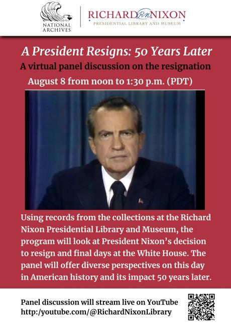 The Richard Nixon Presidential Library and Museum presents A President Resigns: 50 Years Later, a virtual panel discussion on the resignation.