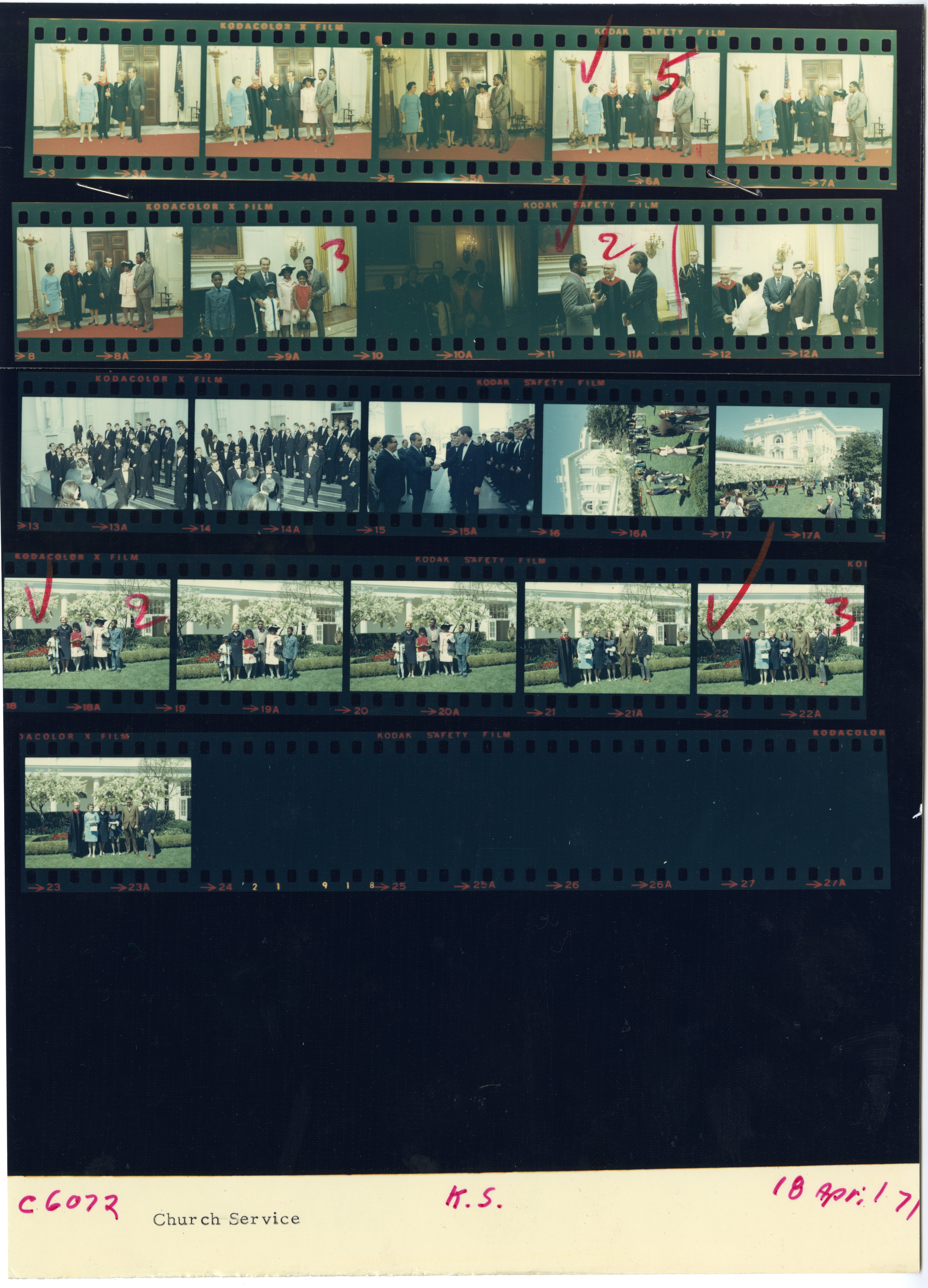 - Frame(s): WHPO-6069-17A-33A, President Nixon greeting worshippers after the East Room religious service. 4/18/1971, Washington, D.C. White House, State Dining Room. President Nixon, Rev. Dr. Carl W. Haley, guests, aides.