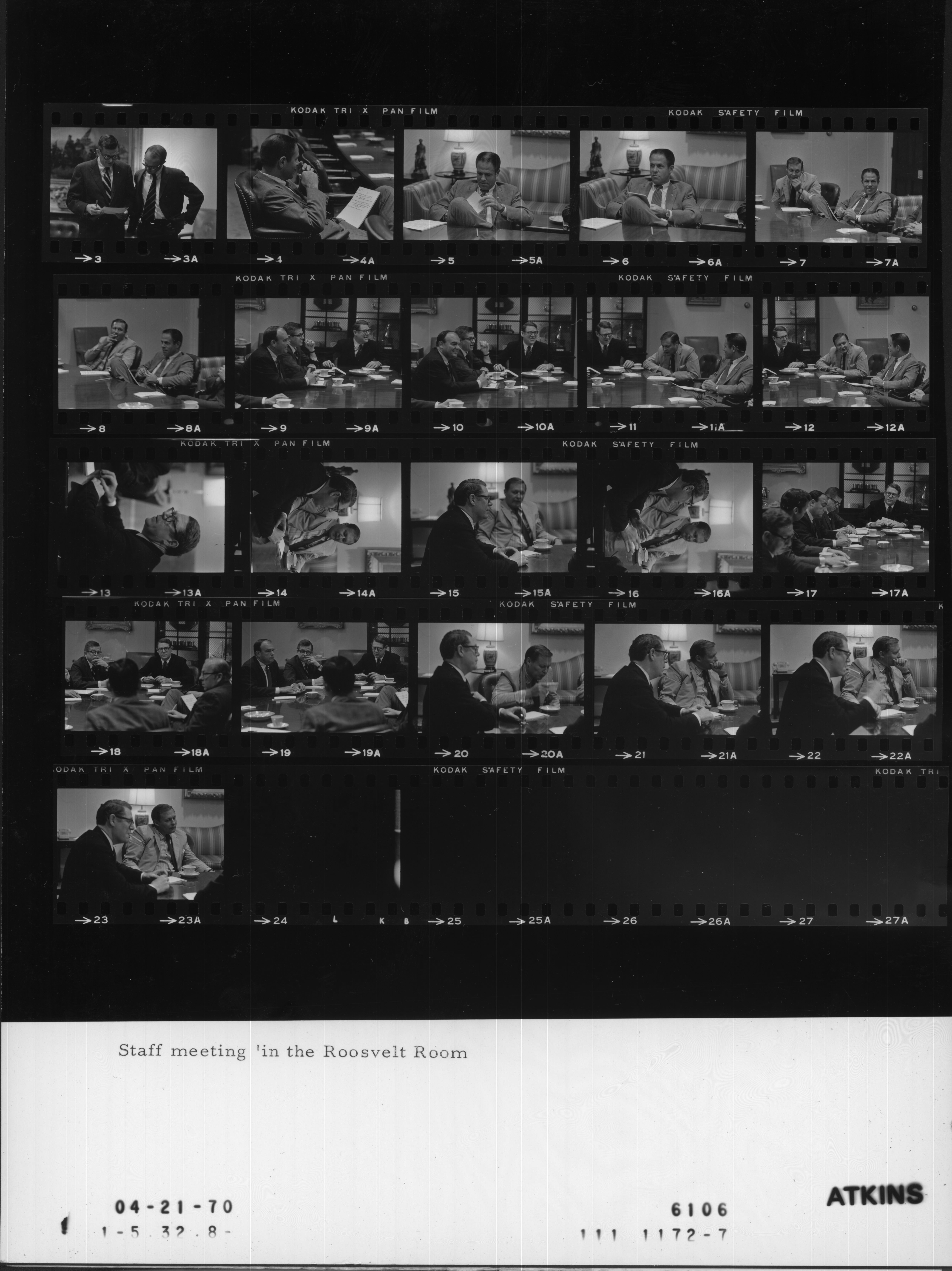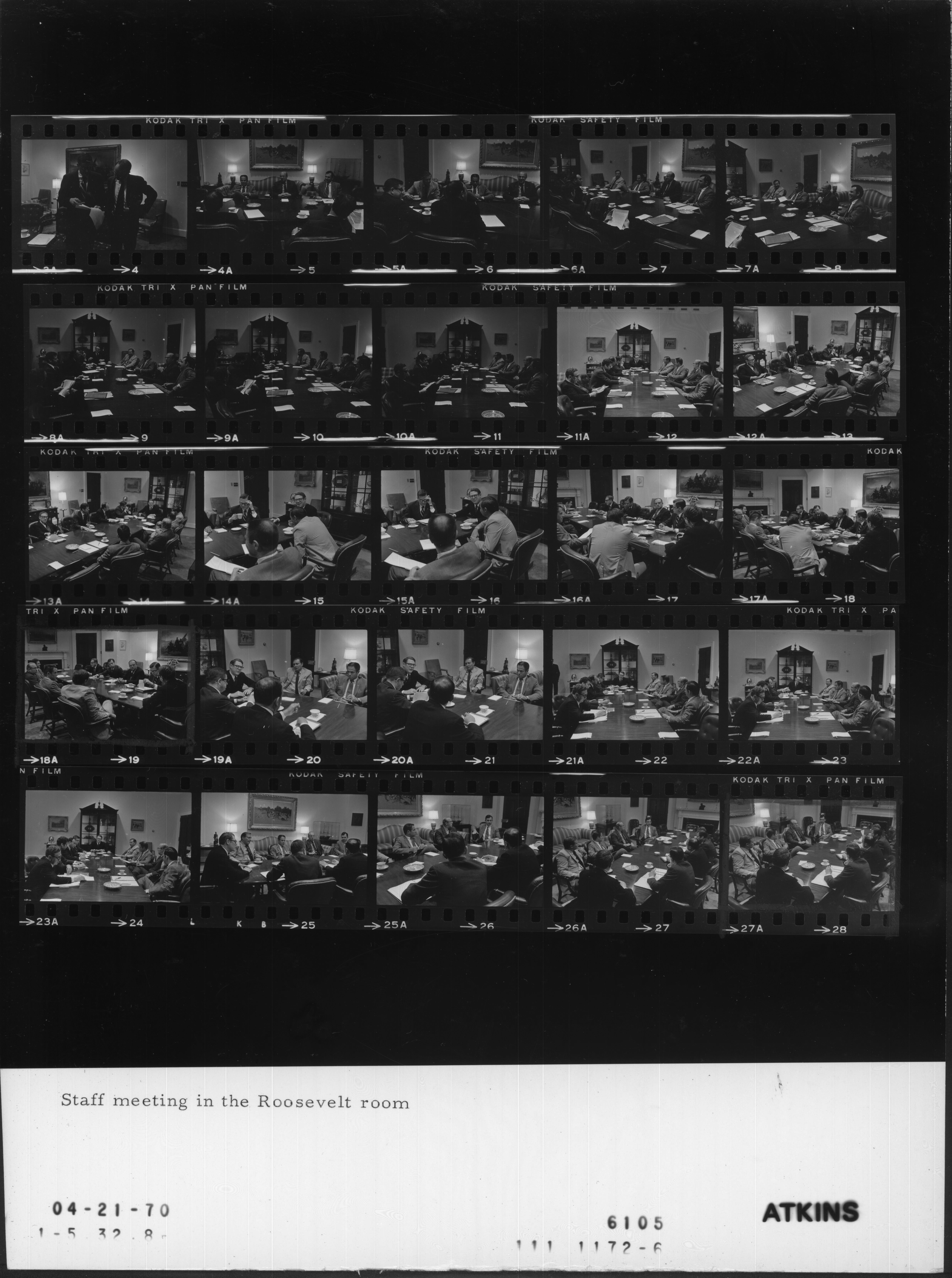 - Frame(s): WHPO-6105-03A-27A, White House staff meeting with lark MacGregor, Harry Robbins Haldeman, John Ehrlichman, Ron Ziegler, George Shultz, Charles W. Colson, Henry Kissinger, others. 4/21/1971, Washington, D.C. White House, Roosevelt Room. Clark MacGregor, Harry Robbins Haldeman, John Ehrlichman, Ron Ziegler, George Shultz, Charles W. Colson, Henry Kissinger, others.