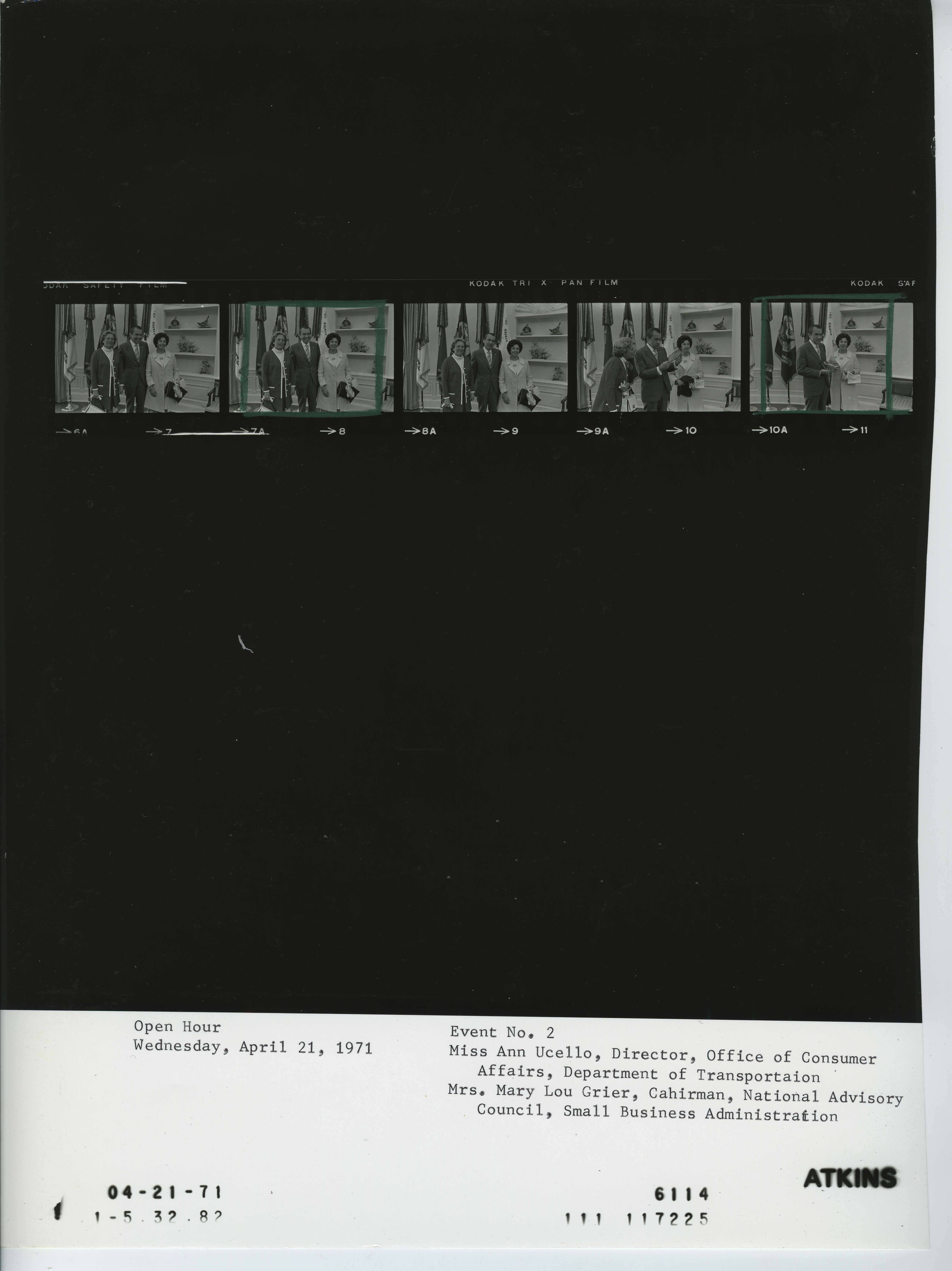 - Frame(s): WHPO-6114-06A-10A, President Nixon standing with Ann Ucello, Director of the Office of Consumer Affairs in the Department of Transportation, and Mary Lou Grier, the Chairman of the National Advisory Council in the Small Business Administration. 4/21/1971, Washington, D.C. White House, Oval Office. President Nixon, Ann Ucello, Mary Lou Grier.