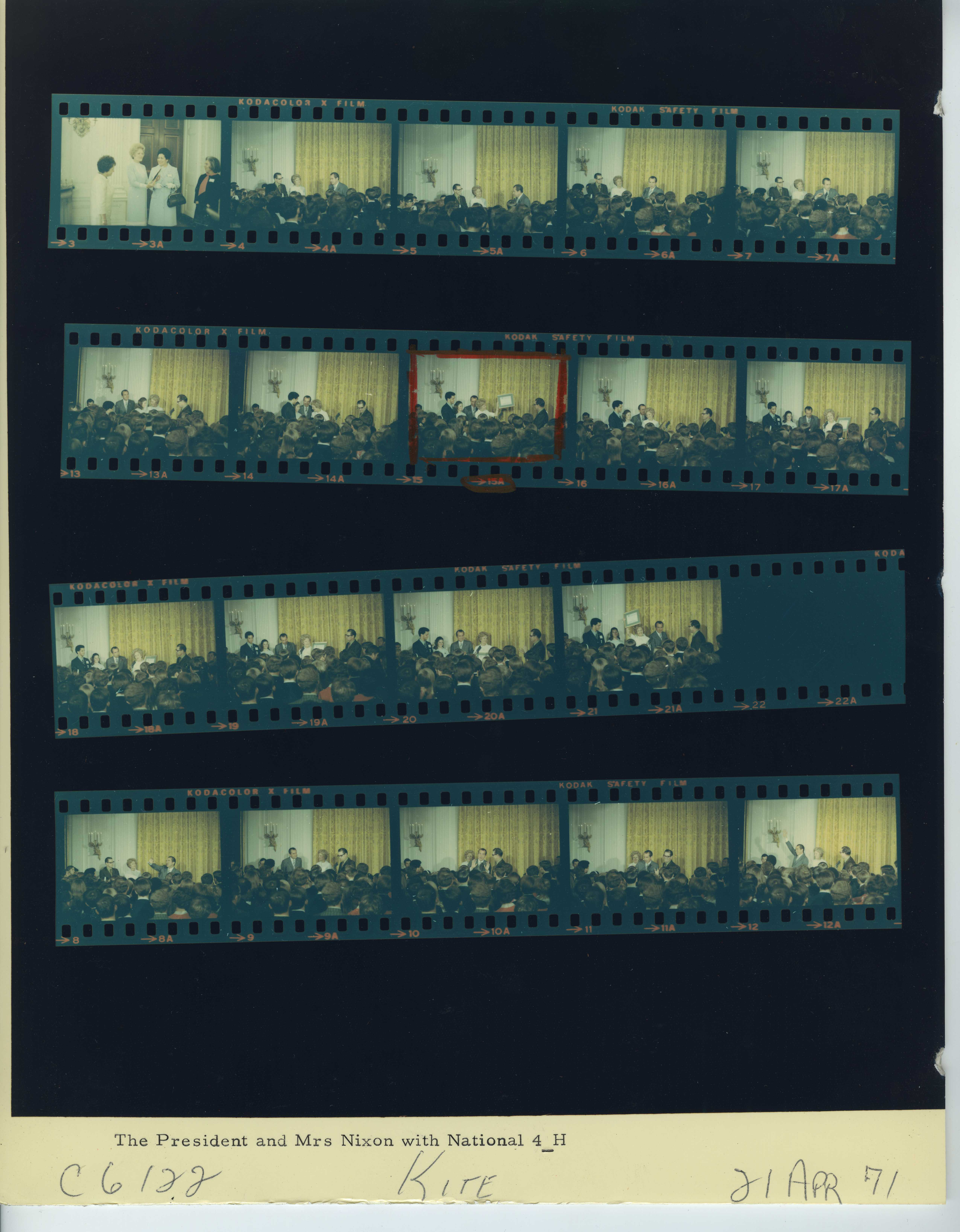 - Frame(s): WHPO-6121-04, President Nixon and Pat Nixon with a 4-H Club representative, probably 4-H Club National Director Dr. E. Dean Vaughan, on a platform in front of 4-H members. 4/21/1971, Washington, D.C. White House, East Room. President Nixon, Pat Nixon, probably E. Dean Vaughan.