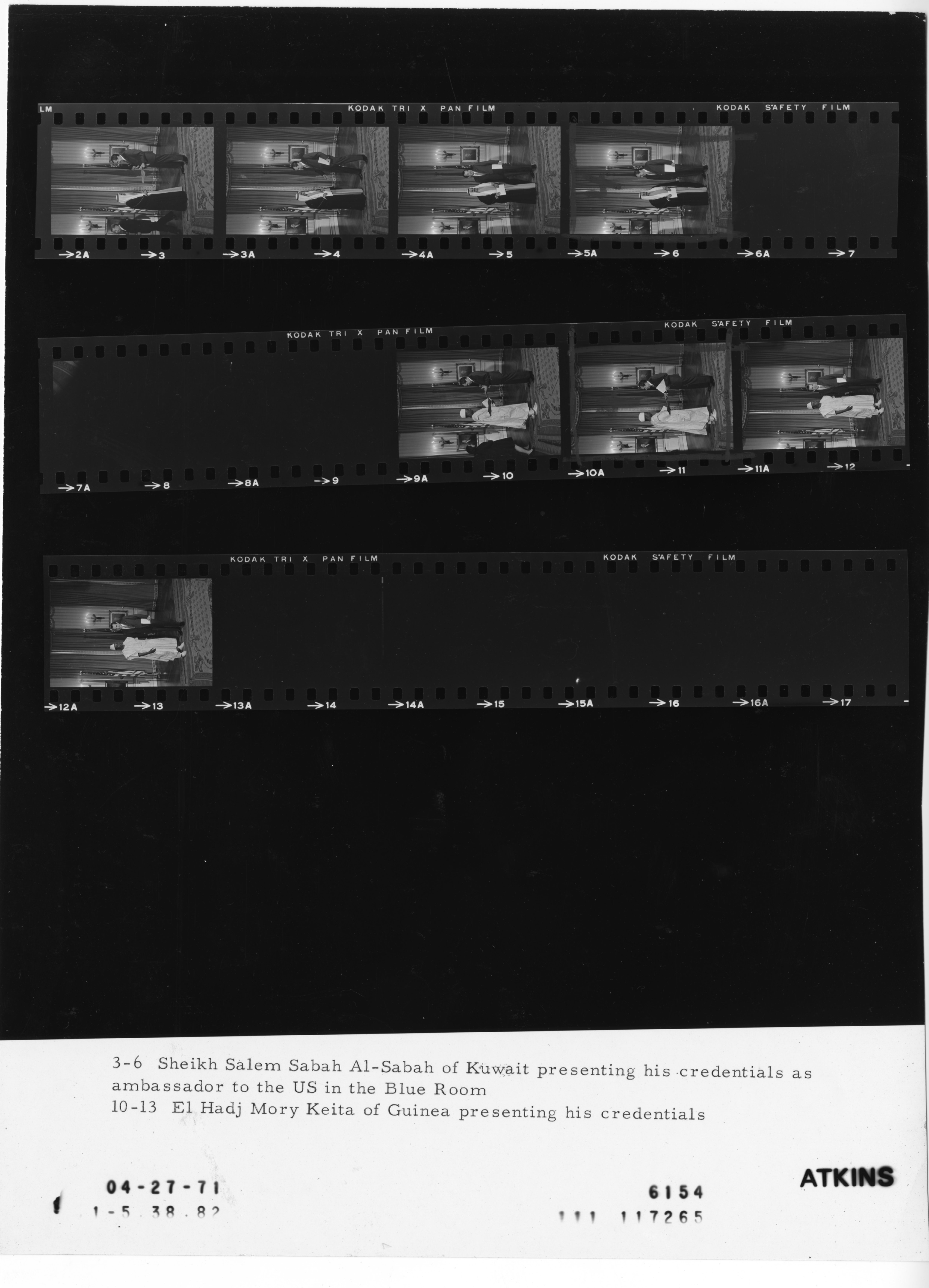 - Frame(s): WHPO-6154-02A-05A, President Nixon receiving diplomatic credentials from Shaykh Salim Al Sabah, Ambassador from Kuwait. 4/27/1971, Washington, D.C. Blue Room, White House. President Nixon, Saykh Salim Al Sabah, El Hadj Mory Keita.