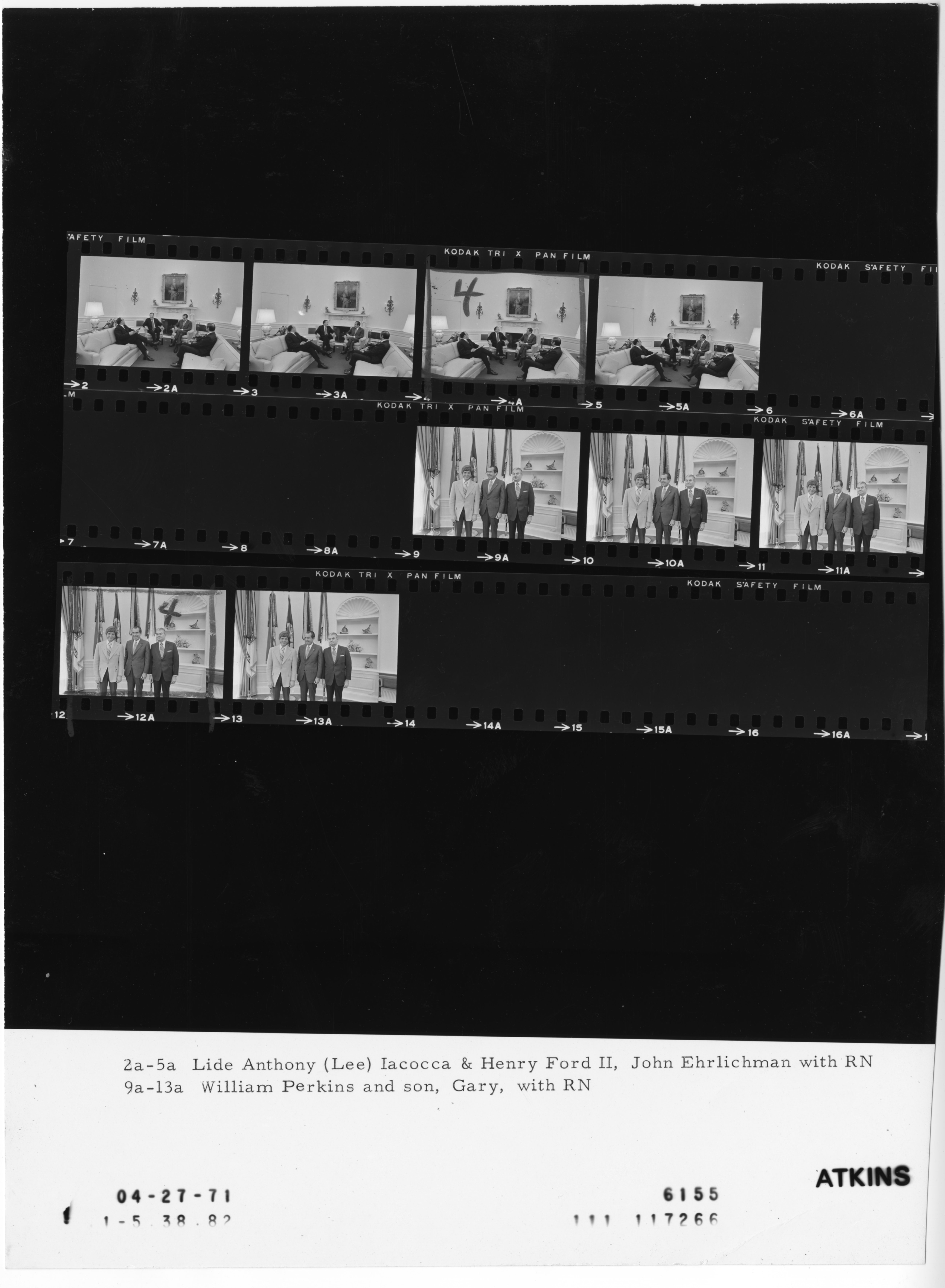 - Frame(s): WHPO-6155-02-05, President Nixon sitting with Lee Iacocca, Henry Ford II, and John Ehrlichman. 4/27/1971, Washington, D.C. White House, Oval Office. President Nixon, Lee Iacocca, Henry Ford II, John Ehrlichman.