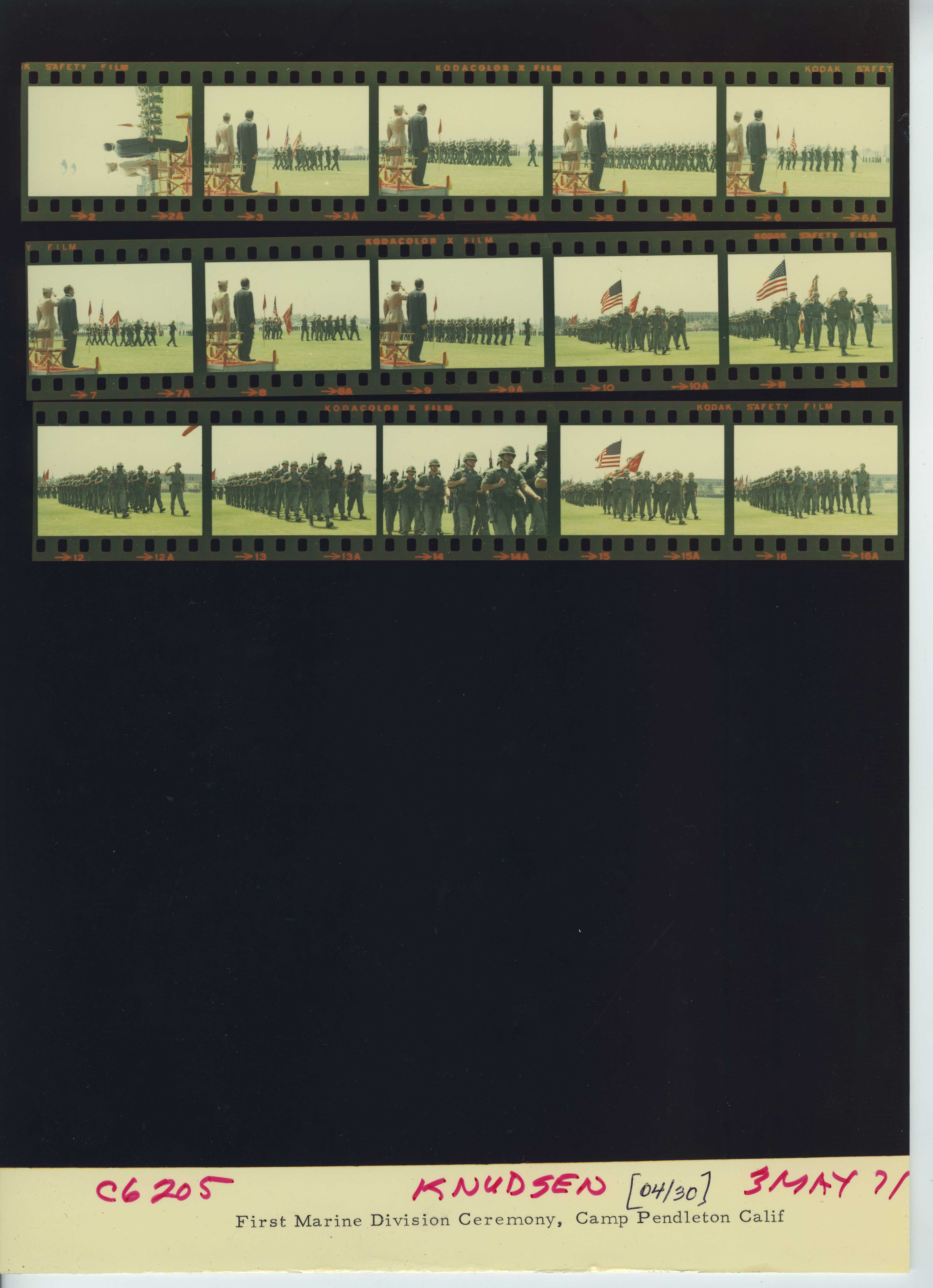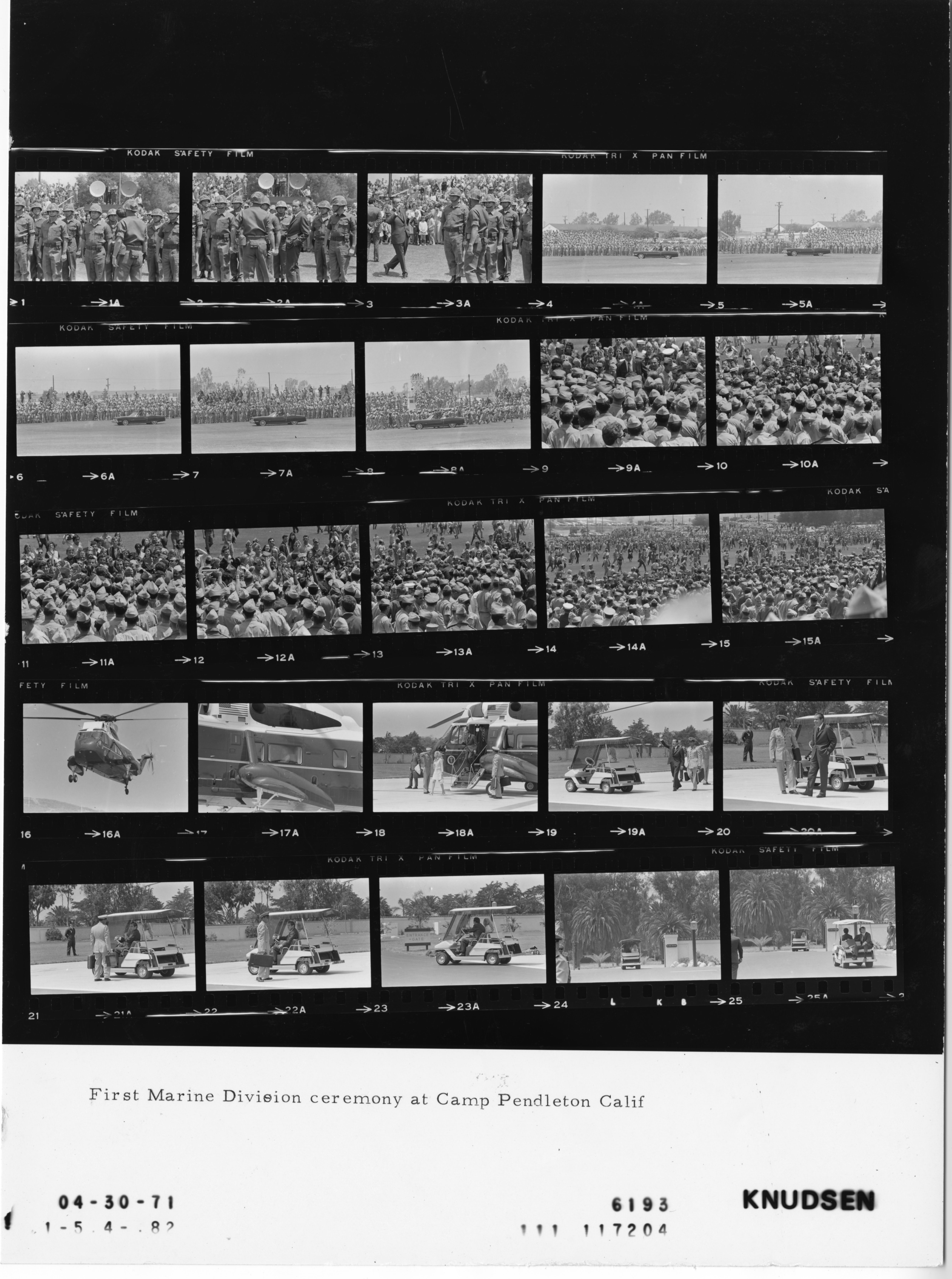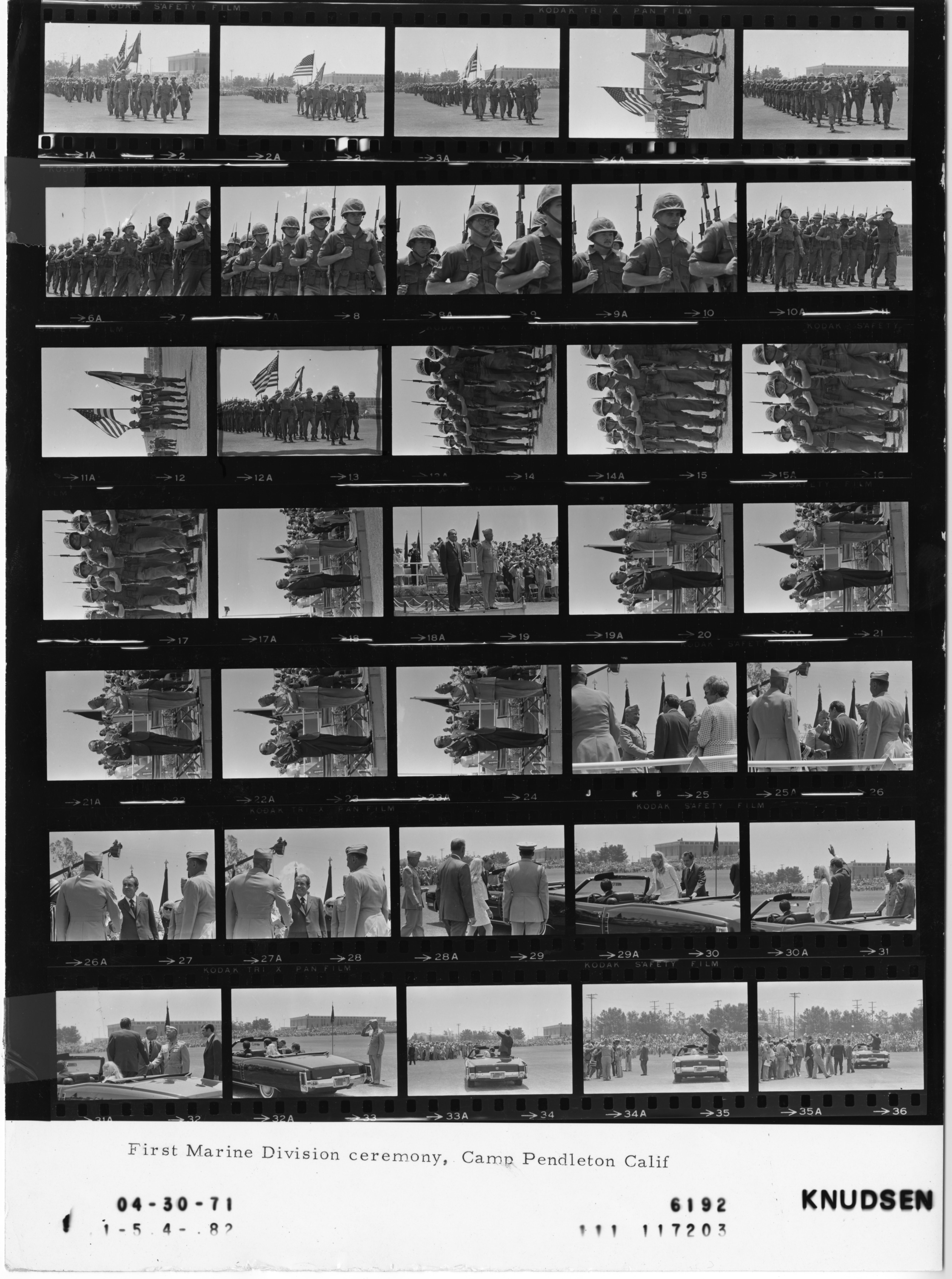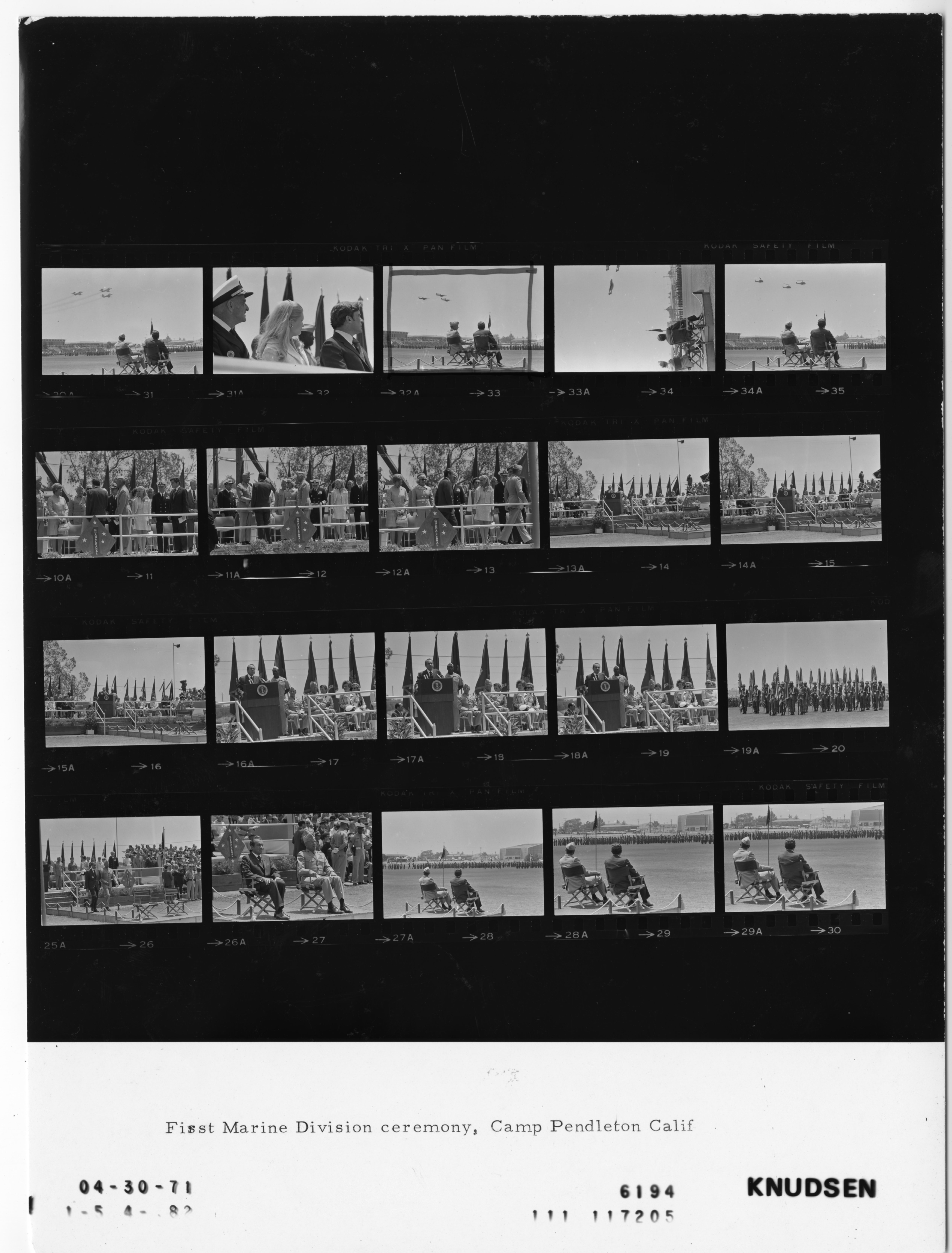 - Frame(s): WHPO-6195-06A-36A, President Nixon during ceremonies honoring the 1st Marine Division. 4/30/1971, Camp Pendleton, California Parade Grounds. President Nixon, Commandant Leonard Chapman, 1st Marine Division troops, Tricia Nixon, guests.