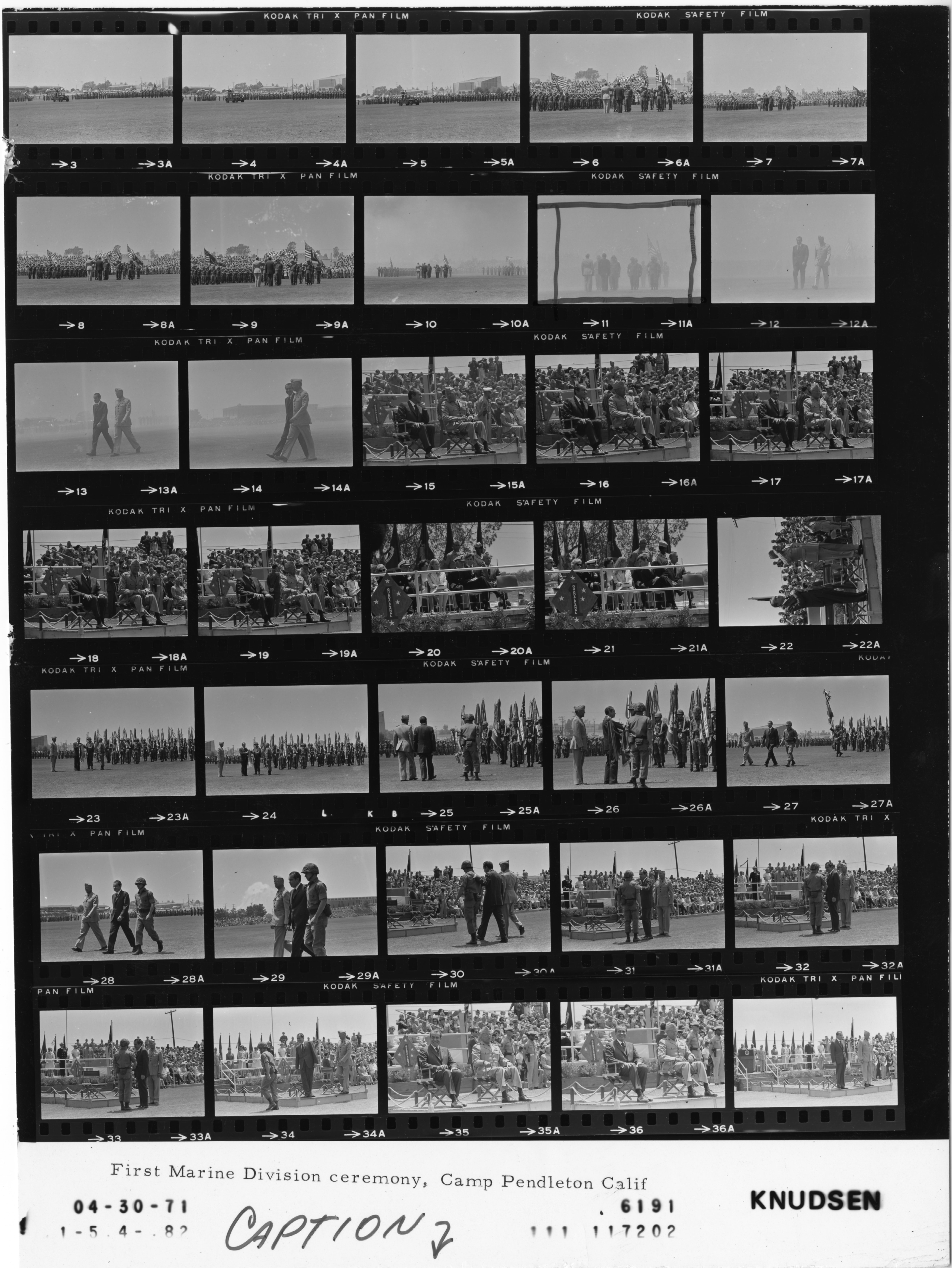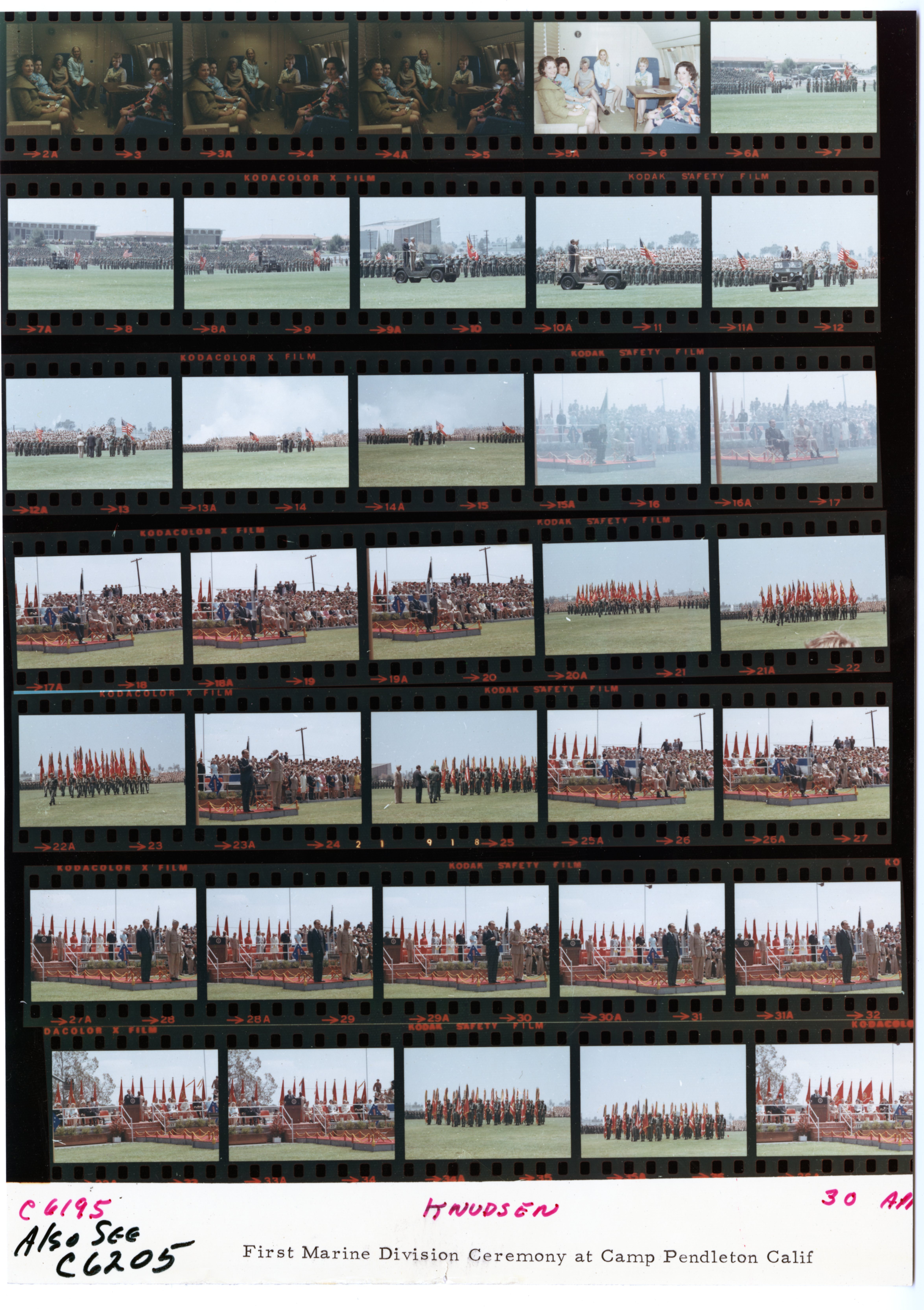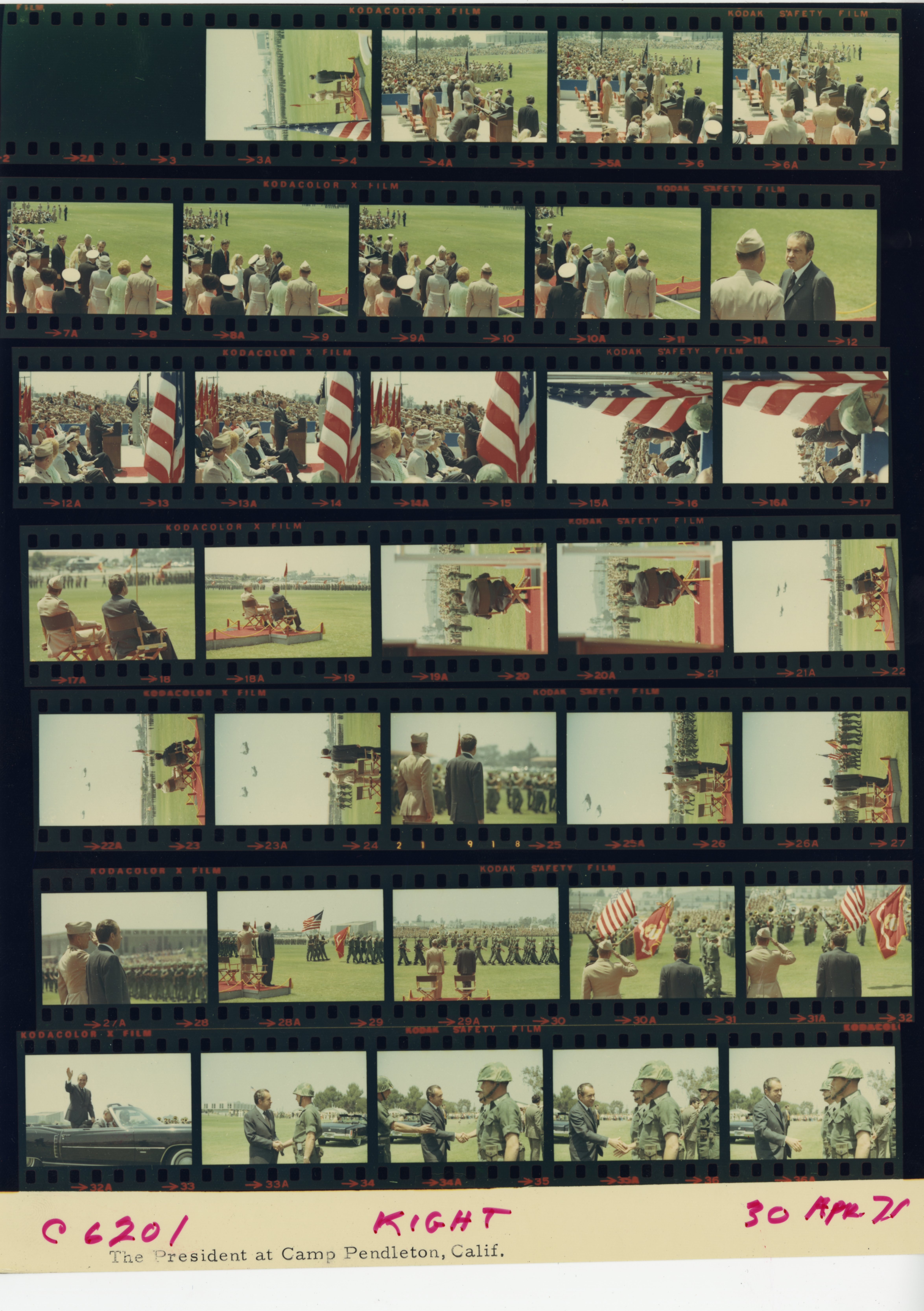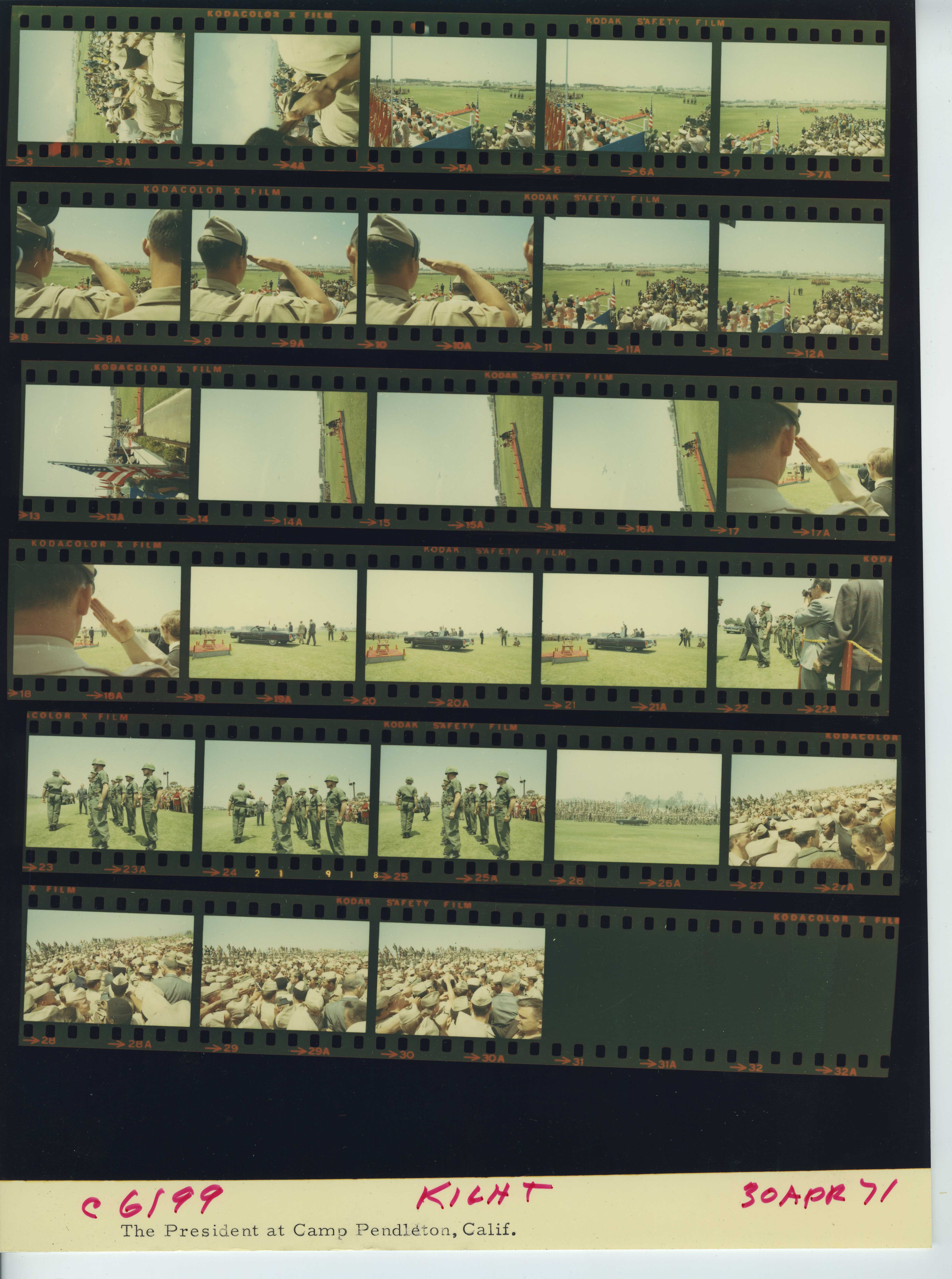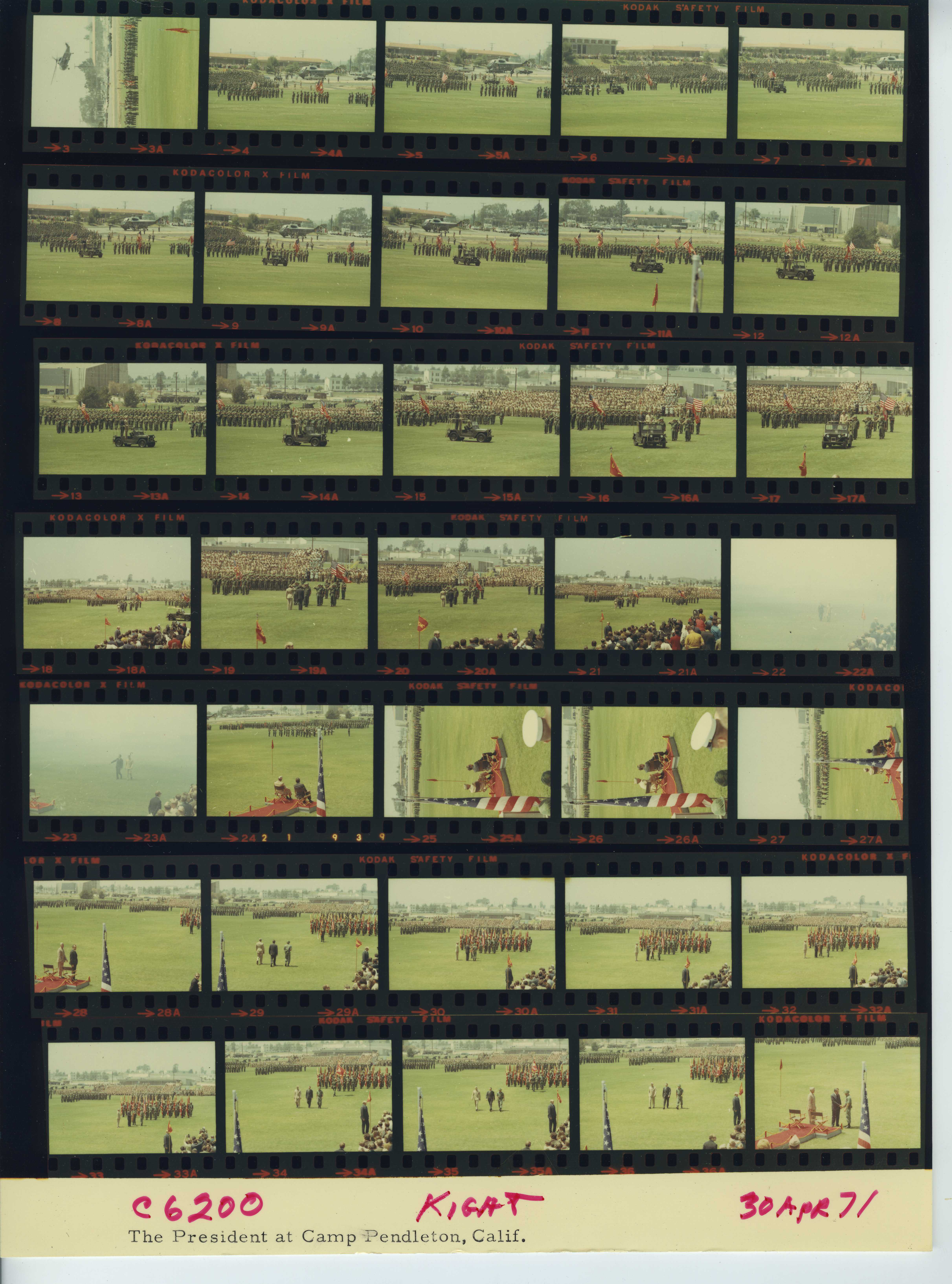 - Frame(s): WHPO-6195-06A-36A, President Nixon during ceremonies honoring the 1st Marine Division. 4/30/1971, Camp Pendleton, California Parade Grounds. President Nixon, Commandant Leonard Chapman, 1st Marine Division troops, Tricia Nixon, guests.
