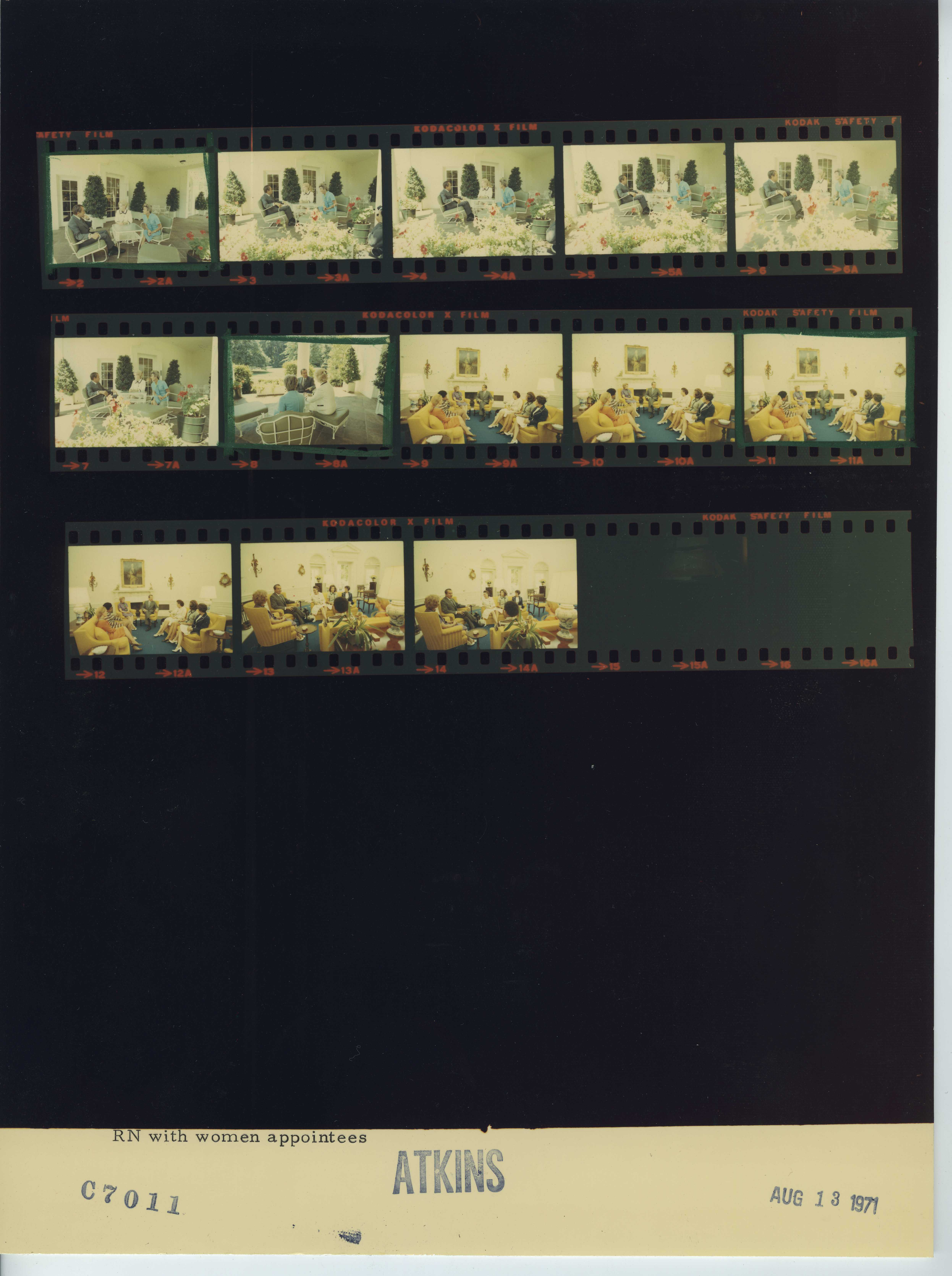 - Frame(s): WHPO-7008-, President Nixon seated during a meeting with key women appointees, Helen Bentley, Barbara Franklin, Elizabeth Hanford, Nancy Hanks, Sallyanne Payton, Ethel Walsh. 8/13/1971, Washington, D.C. White House, Oval Office. President Nixon, Helen Bentley, Barbara Franklin, Elizabeth Hanford, Nancy Hanks, Sallyanne Payton, Ethel Walsh.