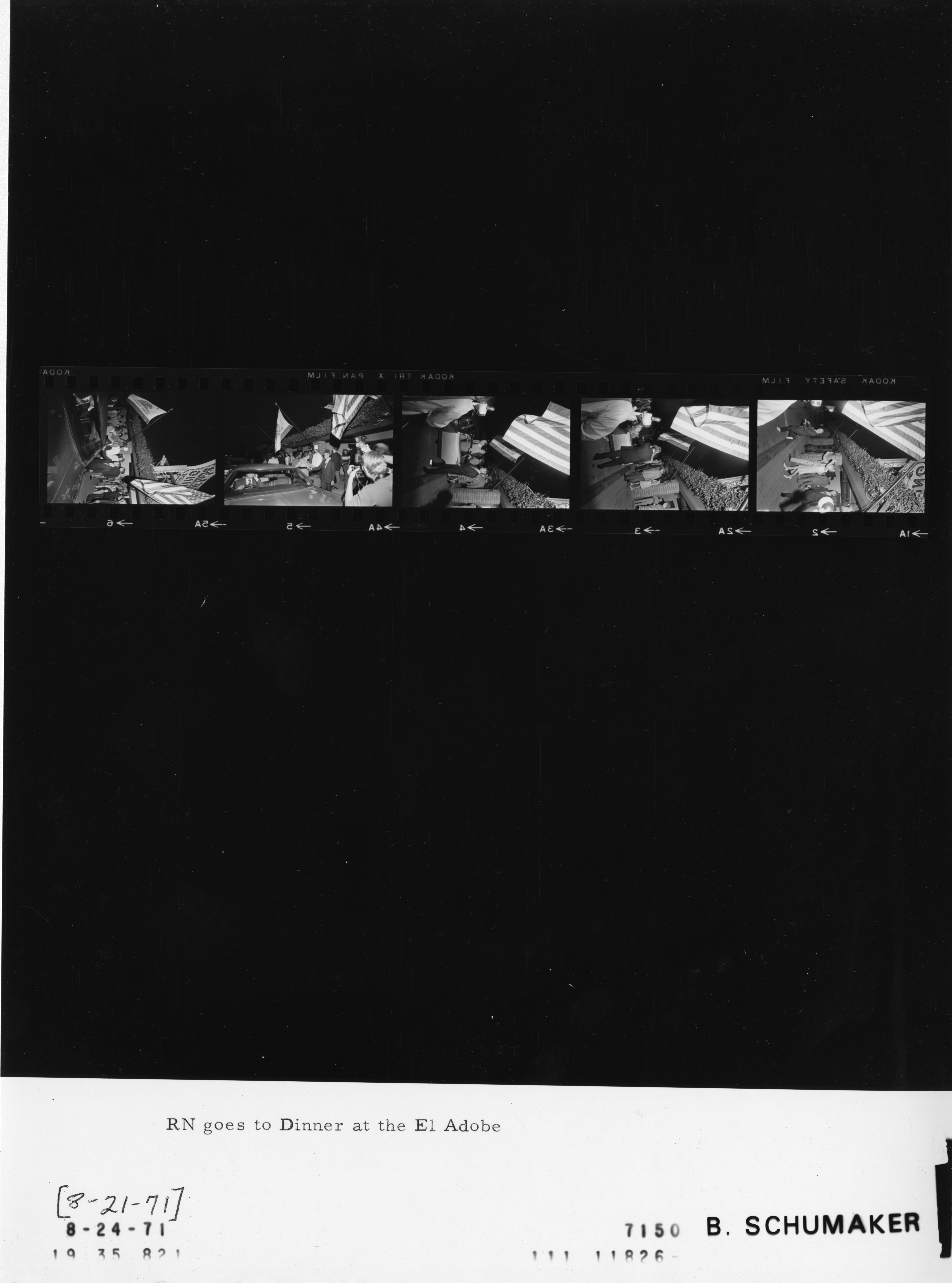 - Frame(s): WHPO-7150-01A-05A, President Nixon leaving the El Adobe Restaurant. 8/21/1971, San Juan Capistrano, California El Adobe Restaurant, exterior. President Nixon, press, chef, unidentified persons.