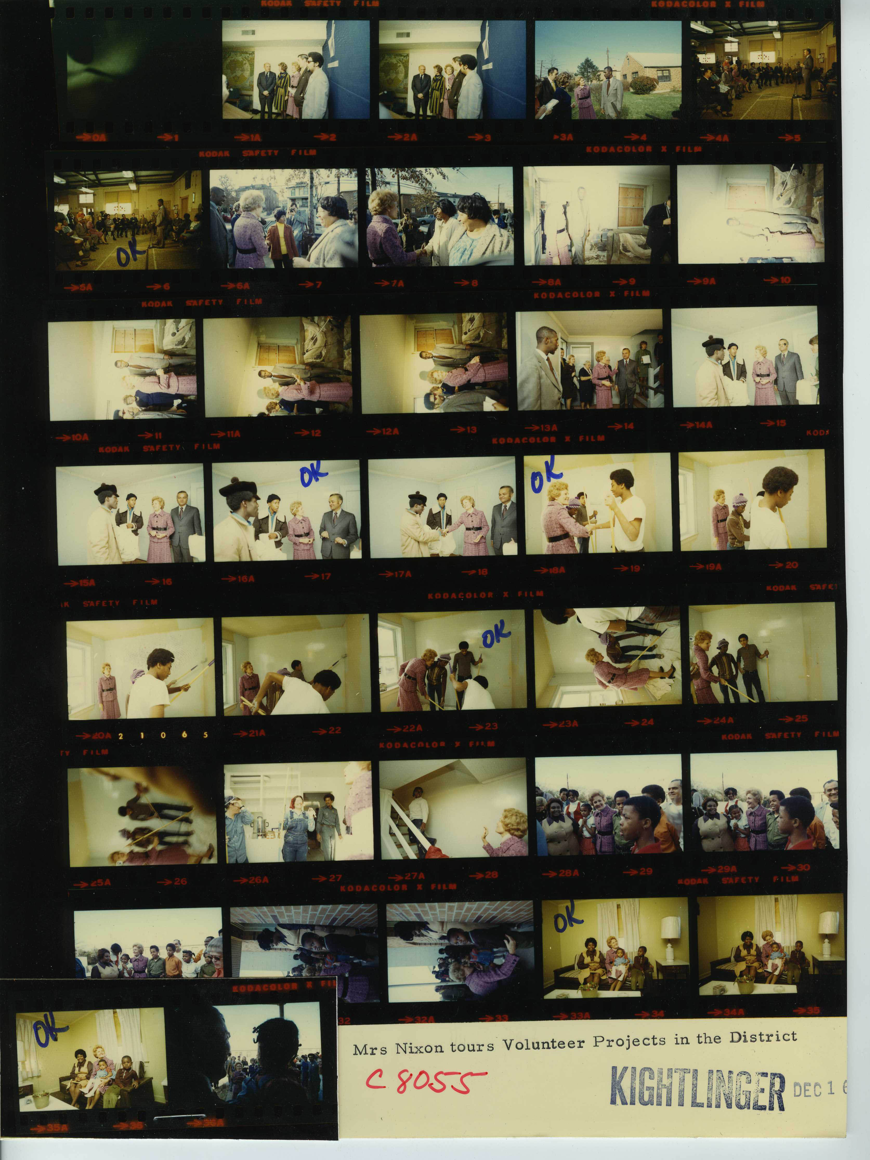 • Frame(s): WHPO-8055-, Pat Nixon visiting NCVA to view volunteer projects for the National Center for Voluntary Action. 12/16/1971, Washington, D.C. NCVA office, Barry Farm Dwellings. Pat Nixon, NCVA officials, volunteers, residents, clients.