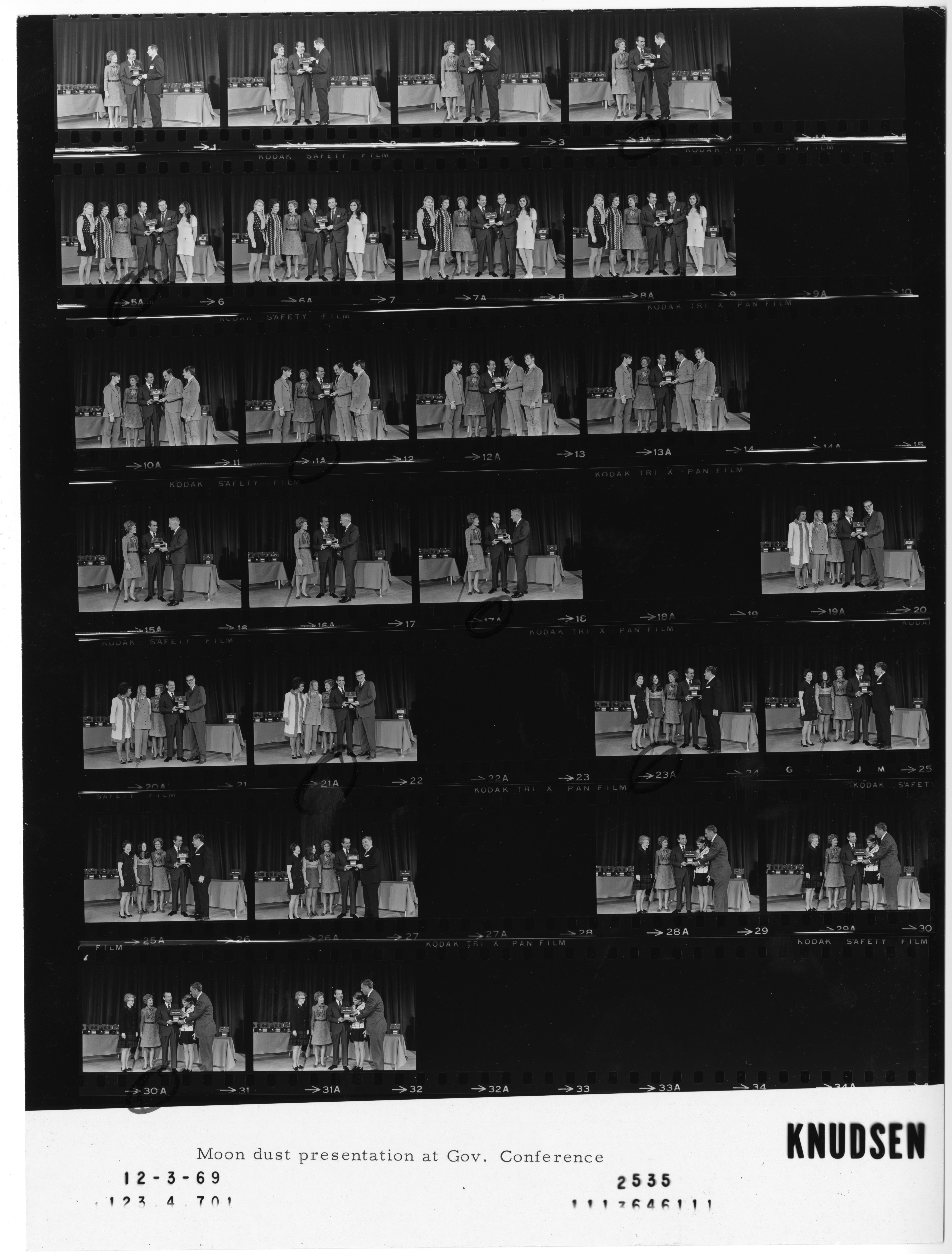 - Frame(s): WHPO-2526-00A-32A, President Nixon and Pat Nixon with state Governors and their families at the Governors' Conference, giving each governor a gift containing moon dust. 12/3/1969, Washington, D.C. State Department. President Nixon, Pat Nixon, unidentified governors and their families.