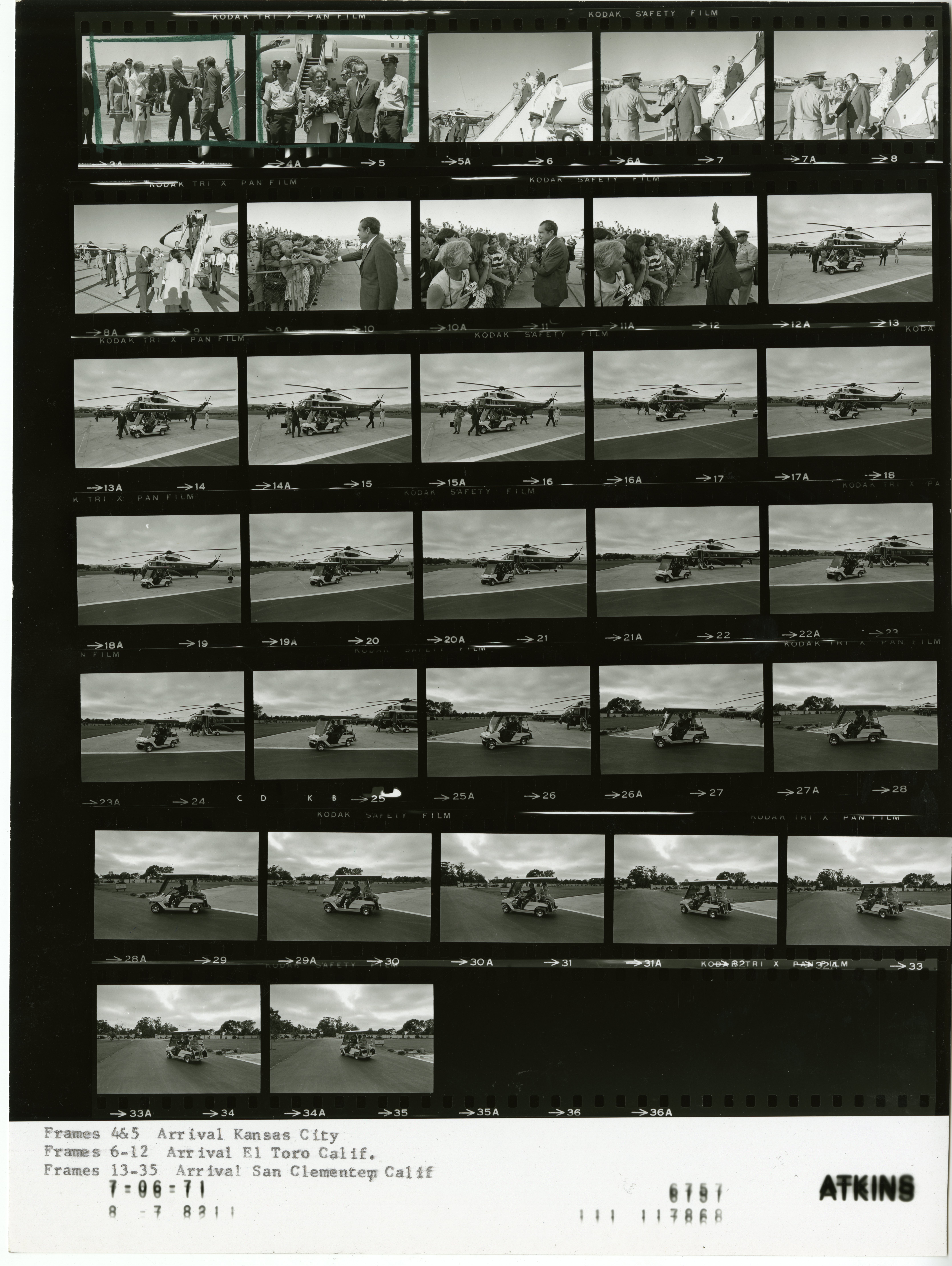 • Frame(s): WHPO-6757-12A-34A, President Nixon, Pat Nixon and Rose Mary Woods near the Presidential helicopter in a golfcart parked on the helipad, after arriving at the Western White House in San Clemente. 7/6/1971, San Clemente, California Western White House, heliport. President Nixon, Pat Nixon, Rose Mary Woods, officials, crowd.