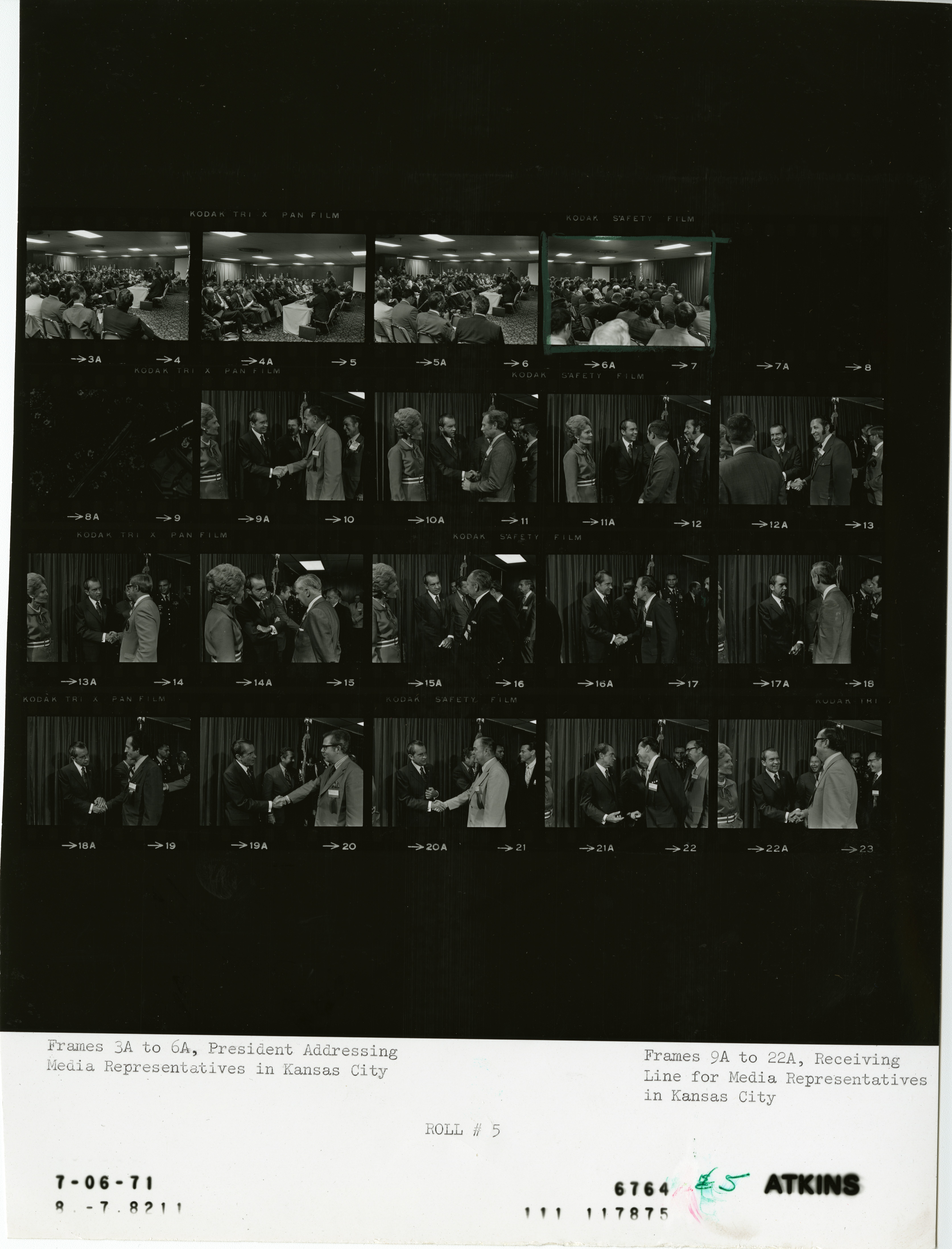 • Frame(s): WHPO-6764-09A-22A, President Nixon and Pat Nixon in a receiving line greeting and posing for group portraits with various media representatives attending the Midwestern Regional Media Briefing in Kansas City. 7/6/1971, Kansas City, Missouri Holiday Inn. President Nixon, Pat Nixon, unidentified media representatives.
