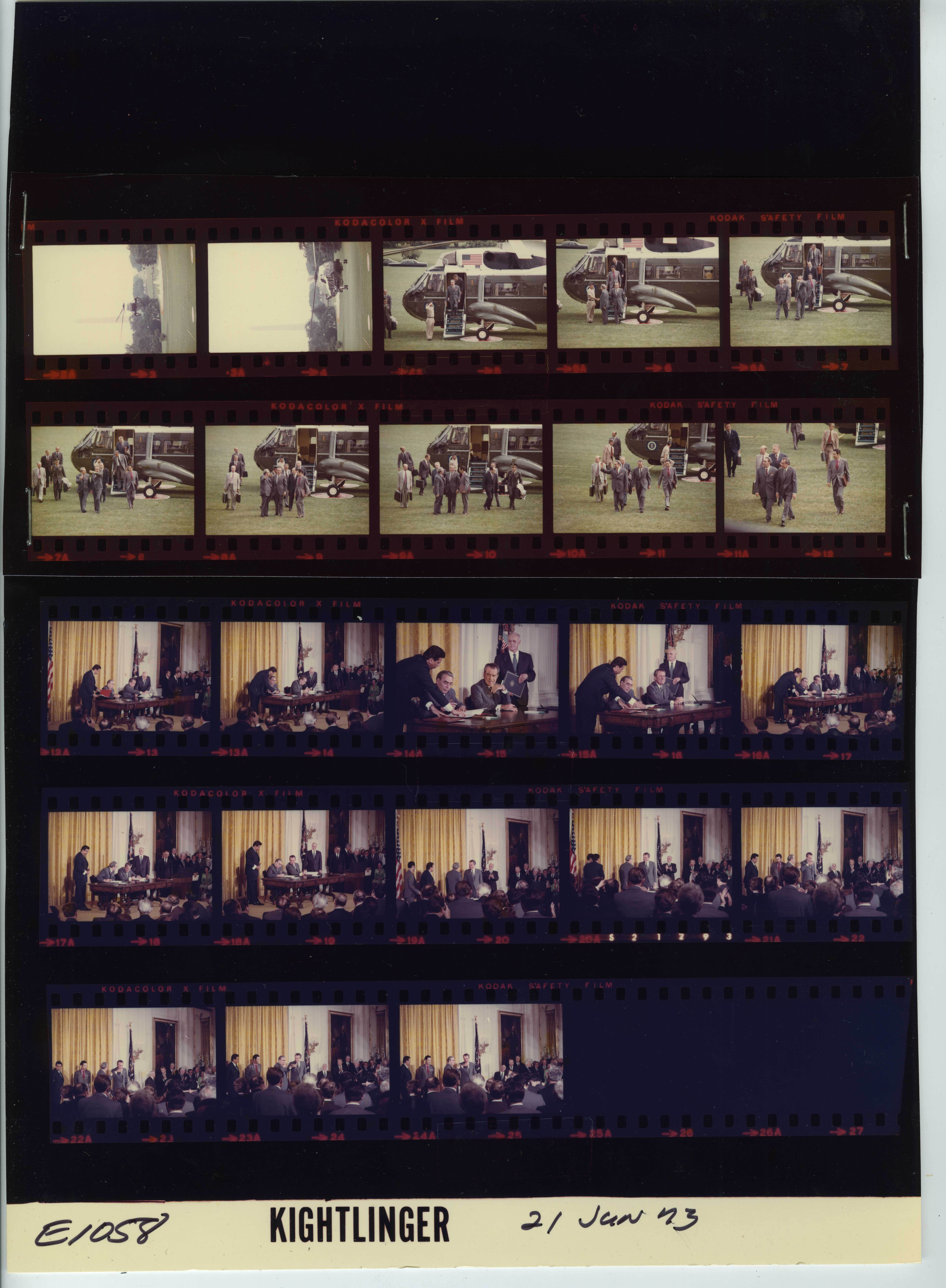 - Frame(s): WHPO-E1055-13, President Nixon and General Secretary Brezhnev signing an agreement between the U.S. and U.S.S.R. on "Scientific and Technical Cooperation in the Field of Peaceful Uses of Atomic Energy.". 6/21/1973, Washington, D. C. White House, East Room. President Nixon, Leonid Brezhnev, unidentified aides.