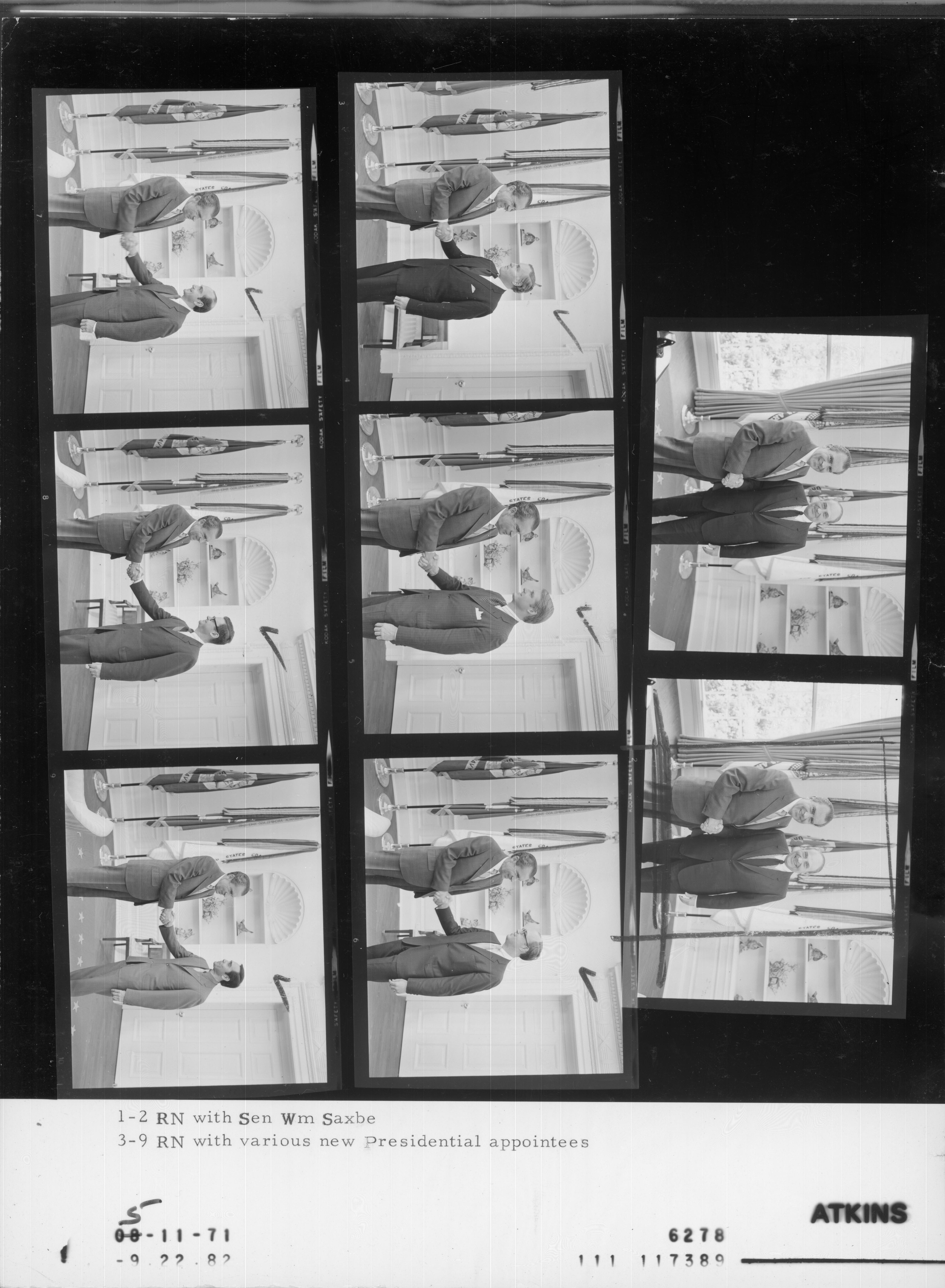 - Frame(s): WHPO-6278-, President Nixon in the Oval Office shaking hands with Senator William Saxbe and new Presidential appointees John Barnum, Richard Bodman, Robert Fri, Stephen Kurzman, William Letson and Phillip Sanchez. 5/11/1971, Washington, D.C. White House, Oval Office. President Nixon, William Saxbe, John Barnum, Richard Bodman, Robert Fri, Stephen Kurzman, William Letson, Phillip Sanchez.