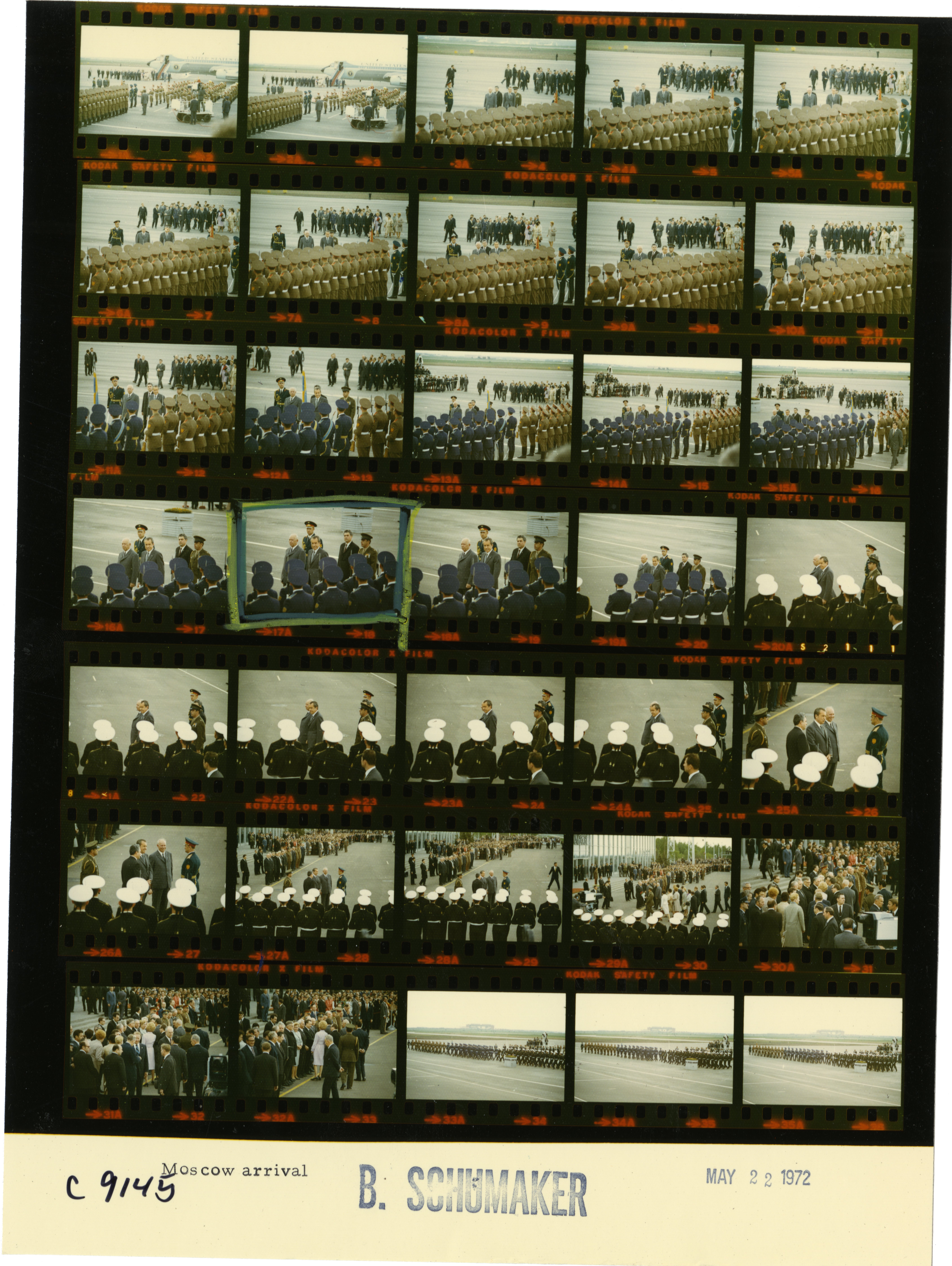 - Frame(s): WHPO-9145-02A, President Nixon's arrival ceremony. President Nixon and Nikolai Podgorny reviewing the honor guard. 5/22/1972, Moscow, Russia, USSR tarmac, Vnukovo II Airport. President Nixon, Pat Nixon, Nikolai Podgorny, Boris Kolokov, Anatoly Dobrynin, Andrei Gromyko, Alexei Kosygin, William Rogers, Kissinger, Mosbacher, officials, honor guard, unidentified members of the band.