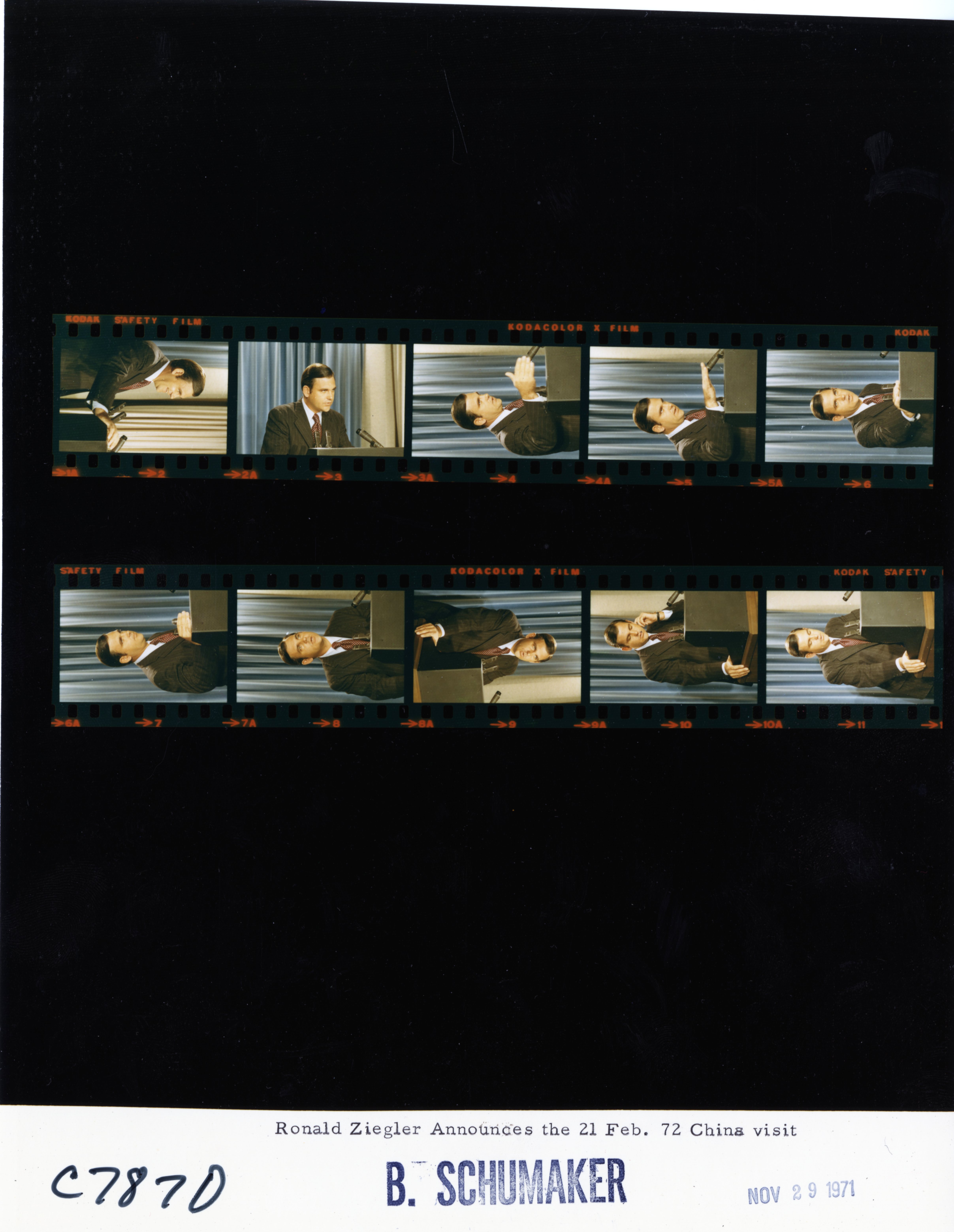 - Frame(s): WHPO-7871-01A-09A, Ron Ziegler briefing the press about the forthcoming Far East China Trip, announcing that the date for leaving for China is February 21, 1972. 11/29/1971, Washington, D.C. White House, Press Room. Ronald Ziegler.