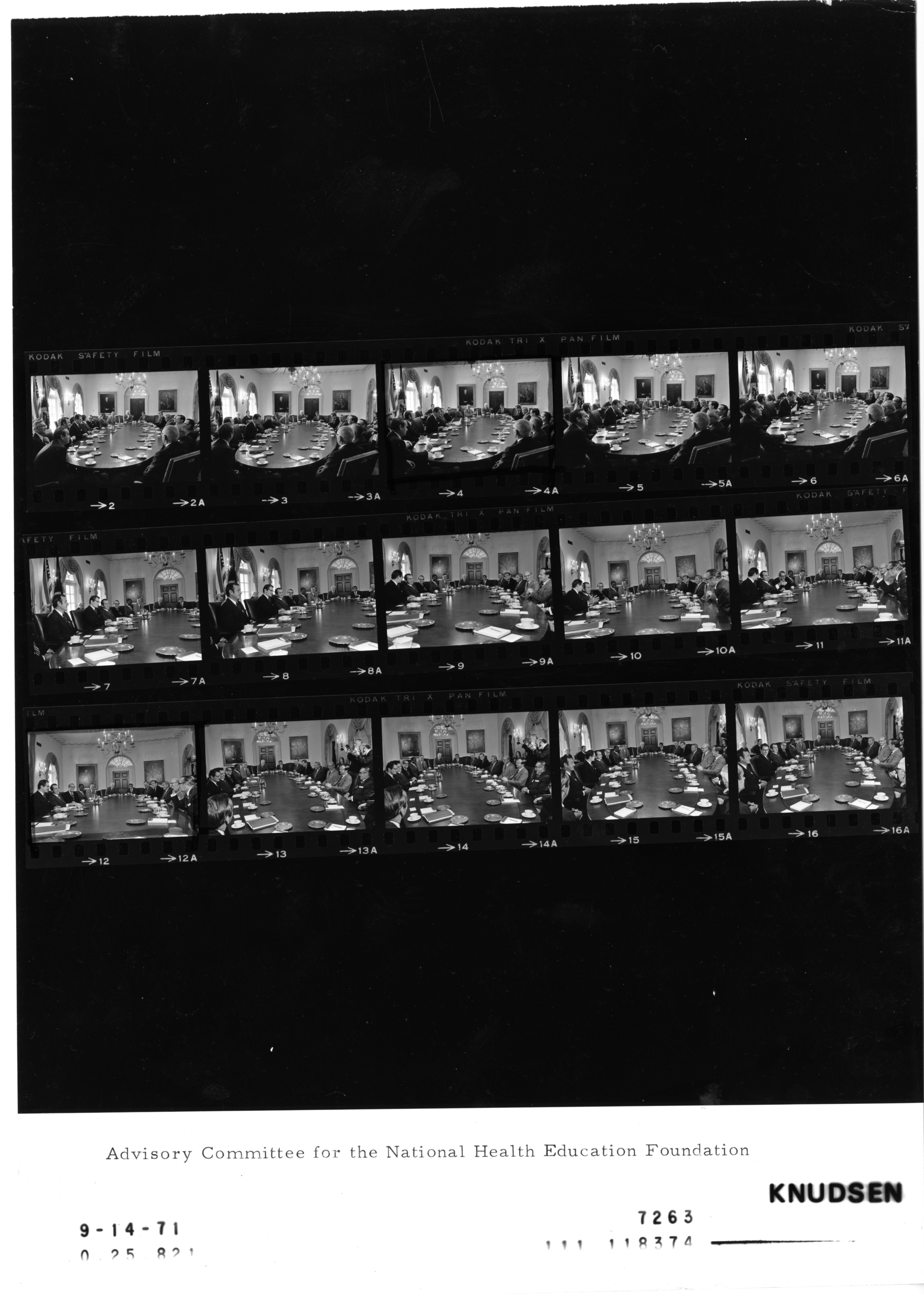 - Frame(s): WHPO-7263-02-16, President Nixon meeting with the Committee to Form a National Health Education Foundation. 9/14/1971, Washington, D.C. White House, Cabinet Room. President Nixon, Eliot Richardson, Joseph Wilson, Joseph Beirne, M. Alfred Haynes MD, Richard McGrail, J. Alexander McMahon, Walter J. McNerney, A.C. Nielsen Jr., Joseph Painter, Wrede Petersmeyer, Charles Seigfried, Dan Seymour, Dr. Irving Shapiro, Scott Simonds, J. Henry Smith, Dr. Merlin DeVal, Robert Laur, others listed in Presidential Daily Diary.