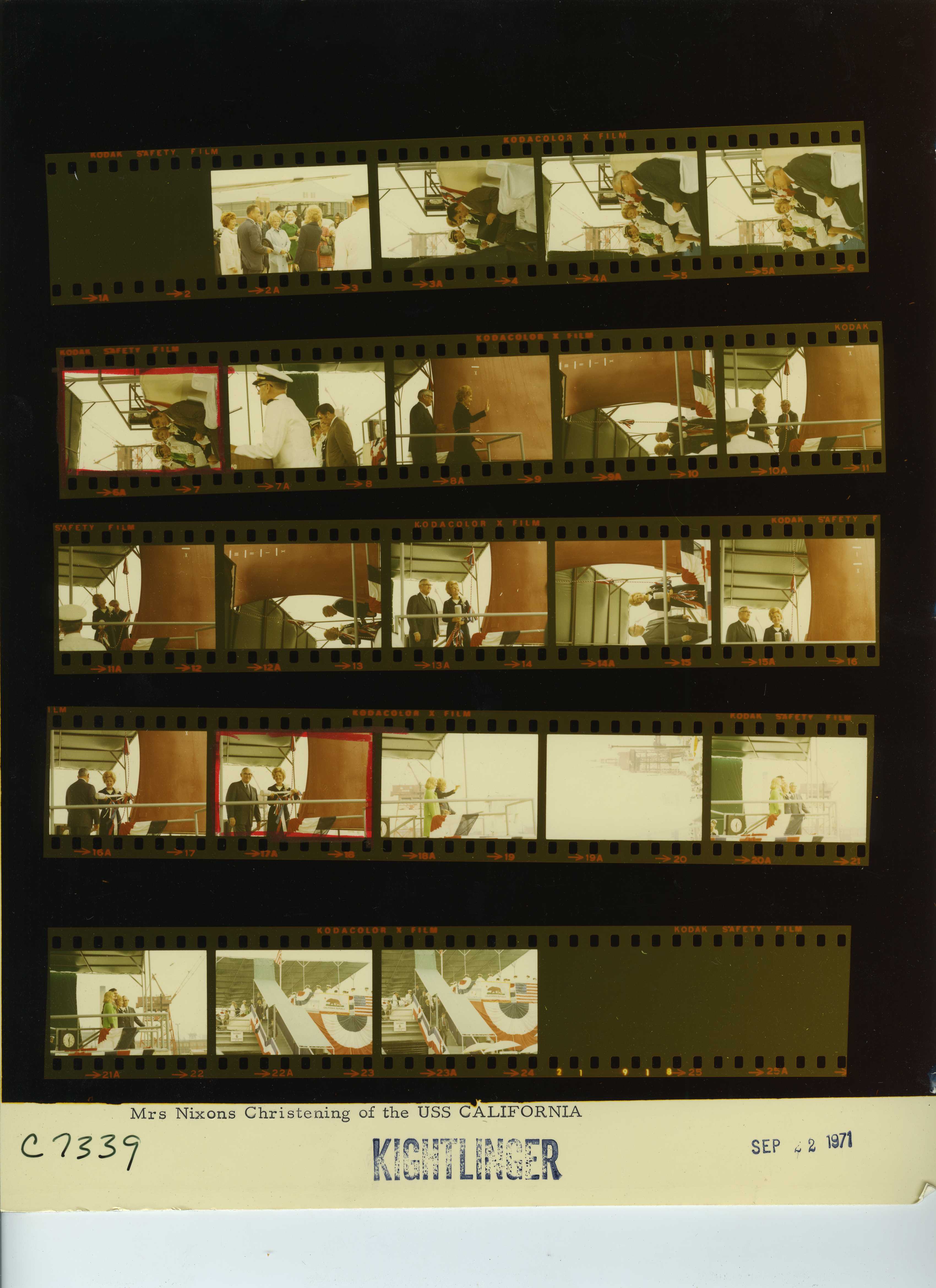 - Frame(s): WHPO-7340-02A-19A, Pat Nixon at the christening ceremony of the ship "USS California.". 9/22/1971, Newport News, Virginia Newport News Shipyard. Pat Nixon, unidentified officials, military personnel.