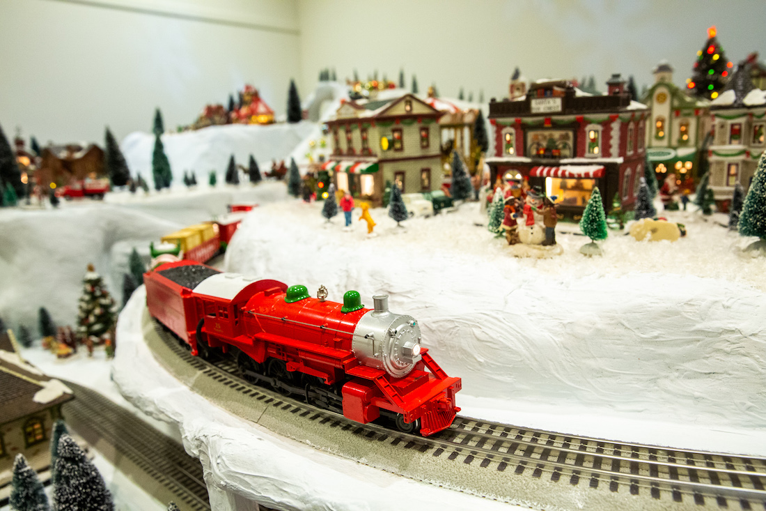 Explore the special Christmas display, All-Aboard, America! featuring four spectacular layouts of model trains whistling over bridges, through snow-capped mountains and stopping in miniature towns and cities.