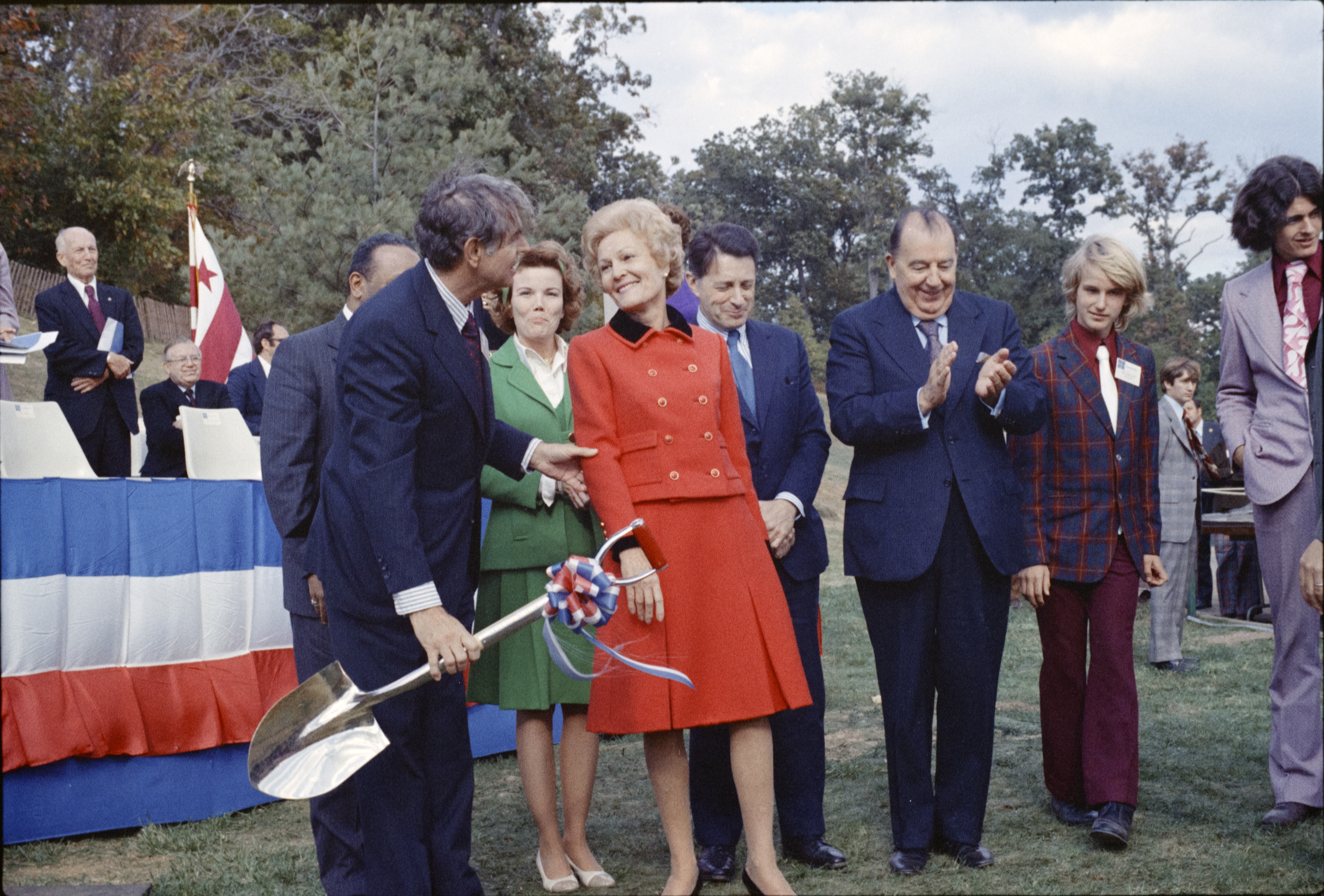 The photo above show Mrs. Nixon with Gallaudet University President, Edward C. Merrill, and KDES/MSSD students, Bill Barber and Nathan Fay (at far right) at the Groundbreaking Ceremony on October 17, 1973, Model Secondary School for the Deaf, Gallaudet University. Designed by Adele Simpson, the red suit is a sleeveless dress with double-breasted jacket with black velvet collar and cuffs.