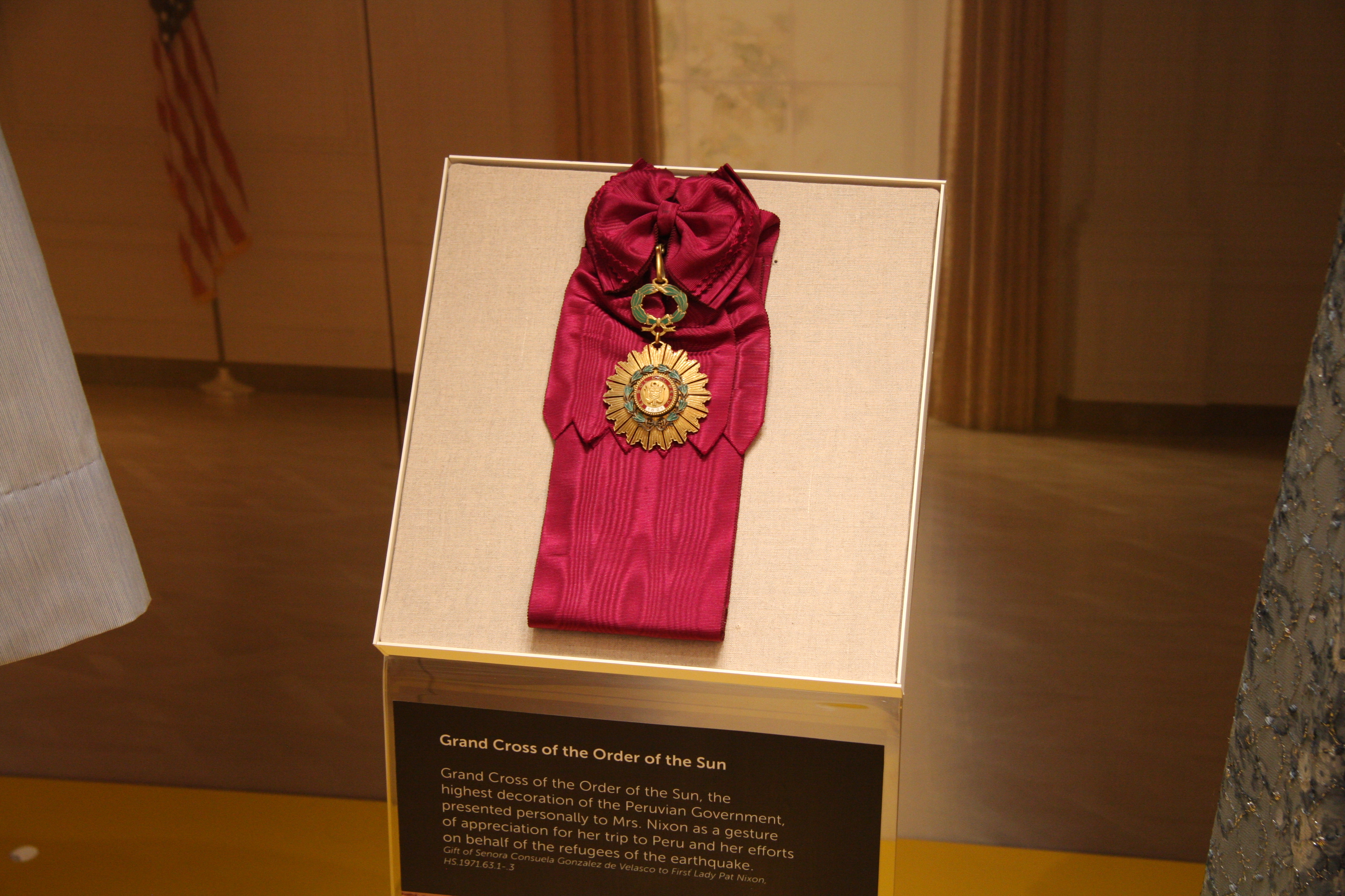 Grand Cross of the Order of the Sun, the highest decoration of the Peruvian Government, presented personally to Mrs. Nixon as a gesture of appreciation for her trip to Peru and her efforts on behalf of the refugees of the earthquake.