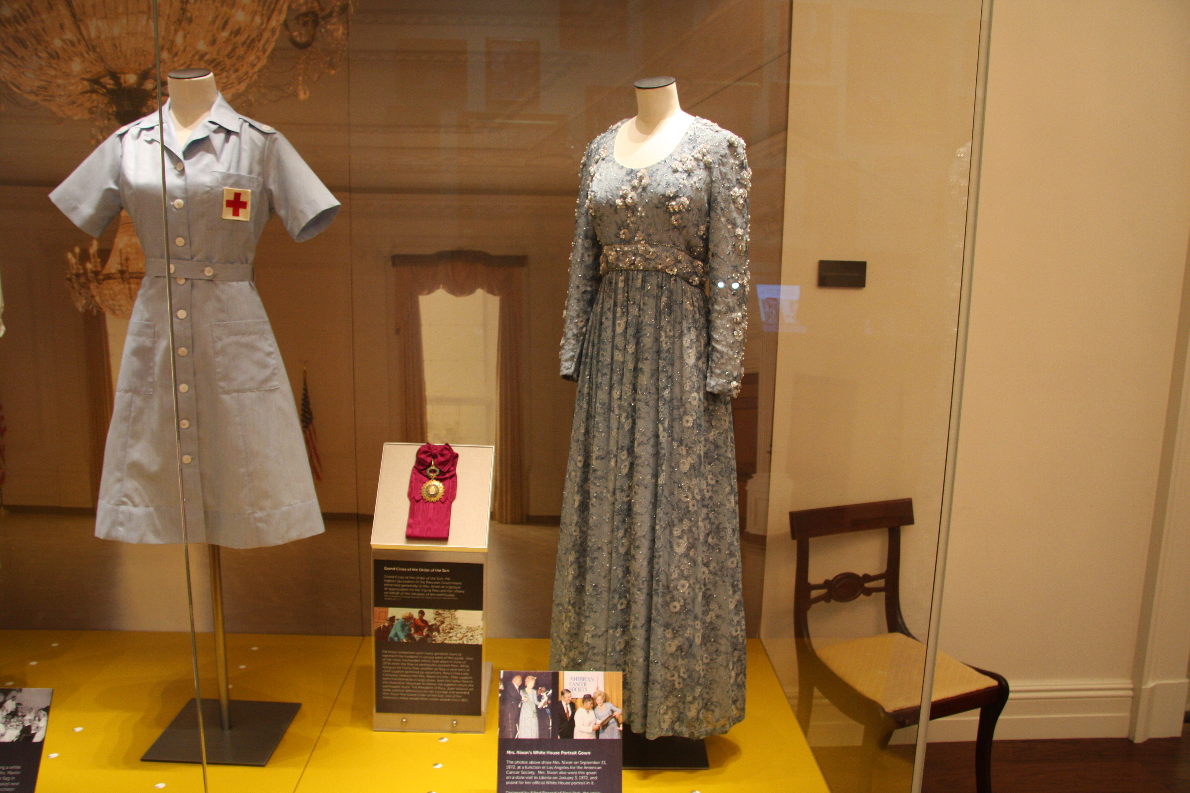 Mrs. Nixon wore this white uniform while volunteering for the Red Cross. She began her volunteer days with the Red Cross in the early 1940s as a secretary, and continued to volunteer her time to the agency’s causes.