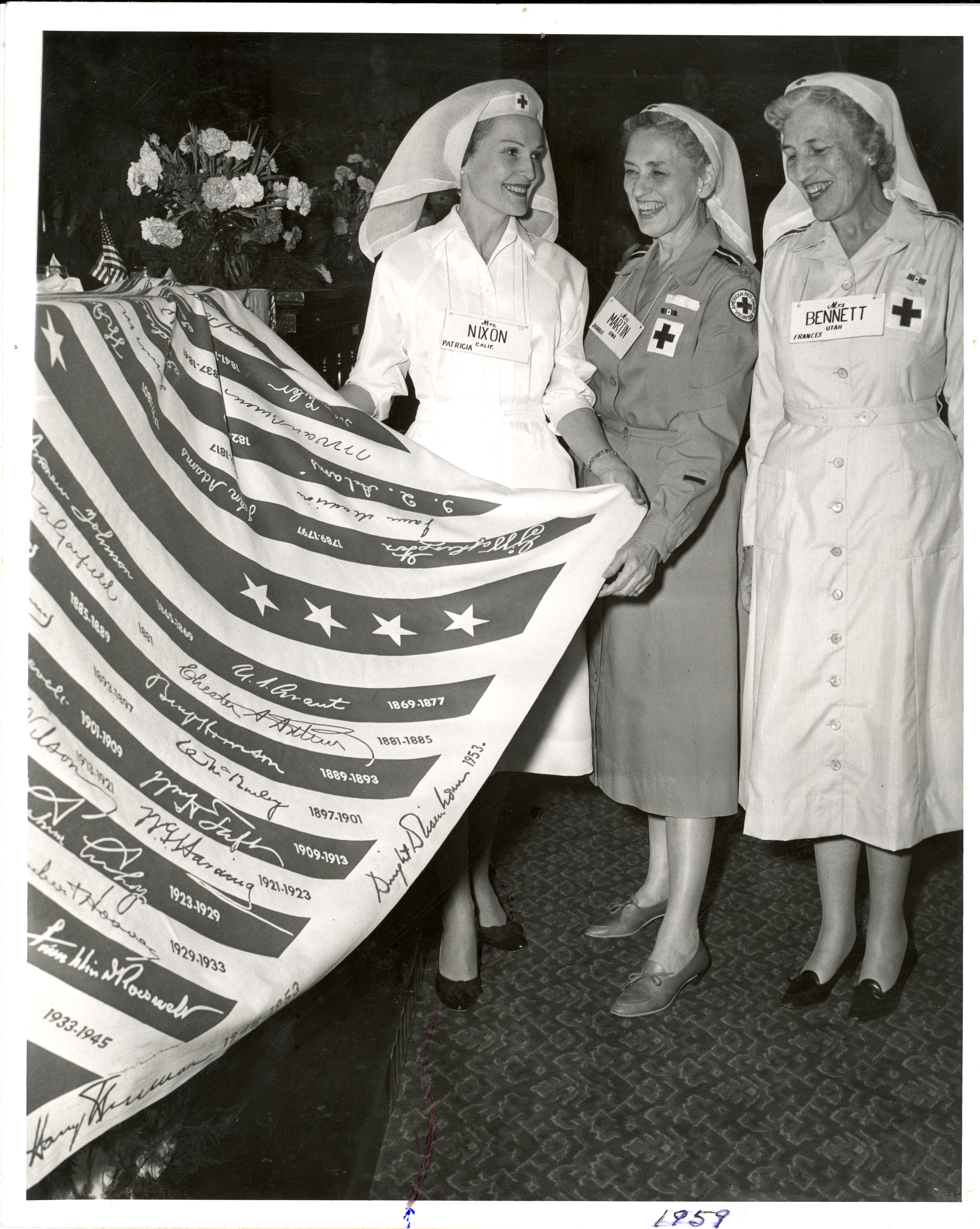 The photo above shows Mrs. Nixon wearing a white Red Cross uniform with Mrs. Everett and Mrs. Martin as the three admire a Presidential Signature flag in 1959.