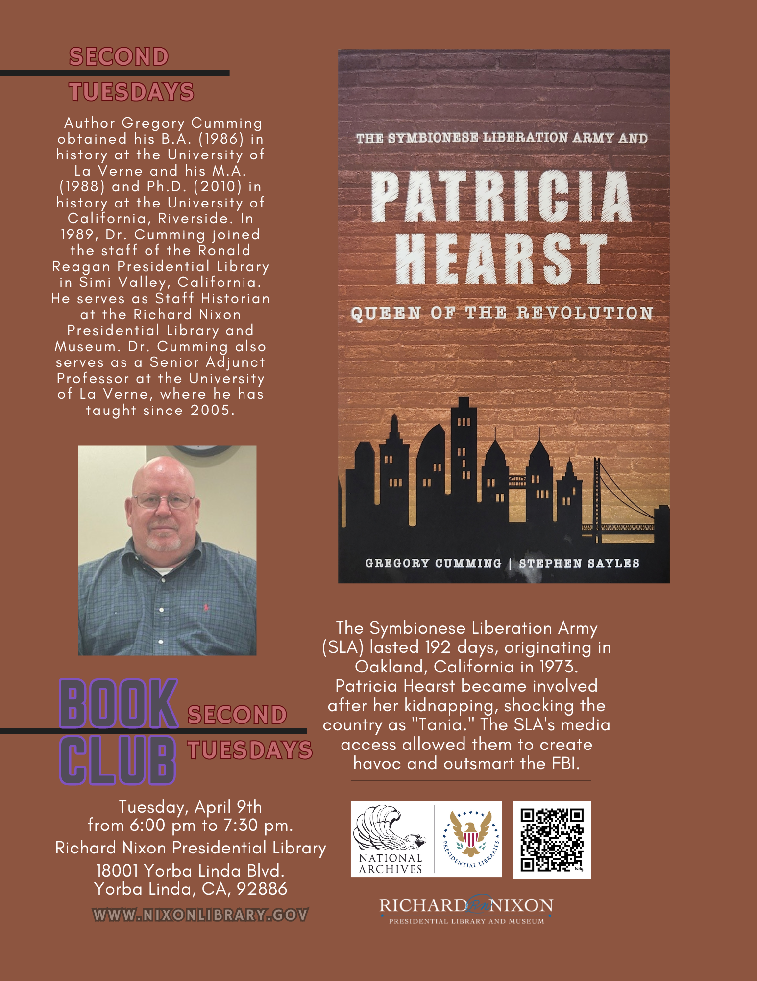 On April 9, 2024, at 6:00 p.m., Dr. Gregory Cumming, Richard Nixon Presidential Library and Museum Staff Historian and Adjunct Professor at the University of La Verne, will be discussing his book The Symbionese Liberation Army and Patricia Hearst: Queen of the Revolution