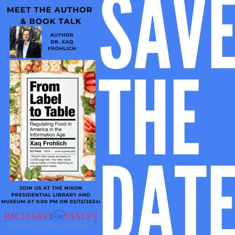 Join the Richard Nixon Presidential Library and Museum on Monday, February 12, 2024, for a one-night-only, free, open-to-the-public event. We invite you to meet and listen to Author Dr. Xaq Frohlich while he reads excerpts from his new book, From Label to Table: Regulating Food in America in the Information Age. The book talk will begin at 6:00 pm with a question-and-answer format to follow.