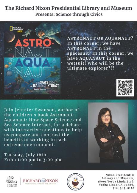 June 12, 2024 ASTRONAUT OR AQUANAUT? TUESDAY, JULY 16, 20241:00 p.m. - 3:00 p.m. Join Jennifer Swanson, author of the children's book Astronaut-Aquanaut: How Space Science and Sea Science Interact, for a debate with interactive questions to help us compare and contrast the benefits of working in each extreme environment.