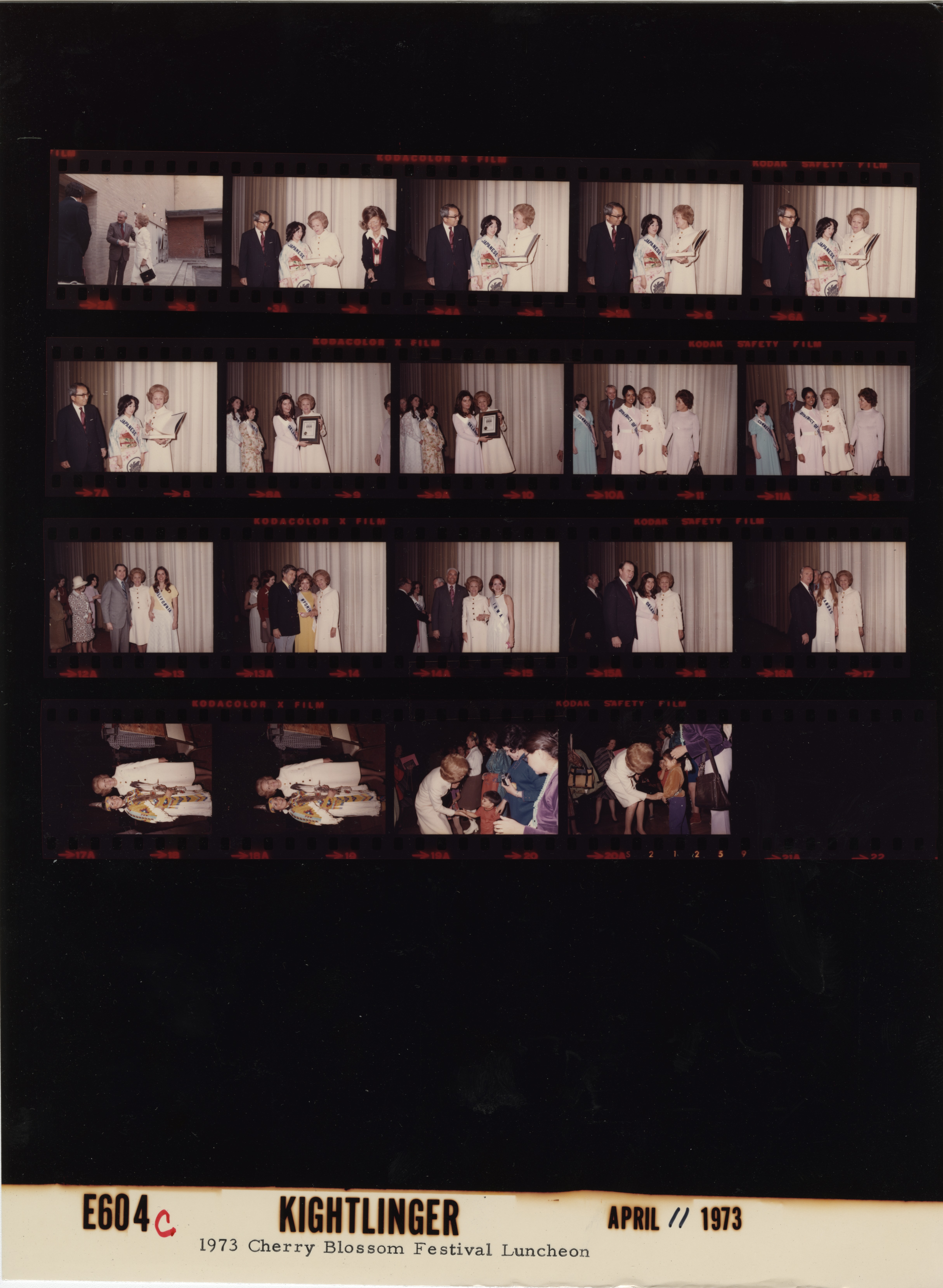 - Frame(s): WHPO-E0604-02A-20A, Pat Nixon speaking with the 1973 National Cherry Blossom Festival officials including the Cherry Blossom Queen from Japan with Japanese Ambassador Nobuhiko Ushiba, and the American Indian Queen. 4/11/1973, Washington, D.C. Park Ballroom, Sheraton Park Hotel. Pat Nixon, Festival Chairman Richard Vierbuchen, Luncheon Chairman Mrs. Eve Lloyd Thompson, unidentified Cherry Blossom Queen from Japan, Japanese Ambassador to the U.S. Nobuhiko Ushiba, unidentified Cherry Blossom Princesses.