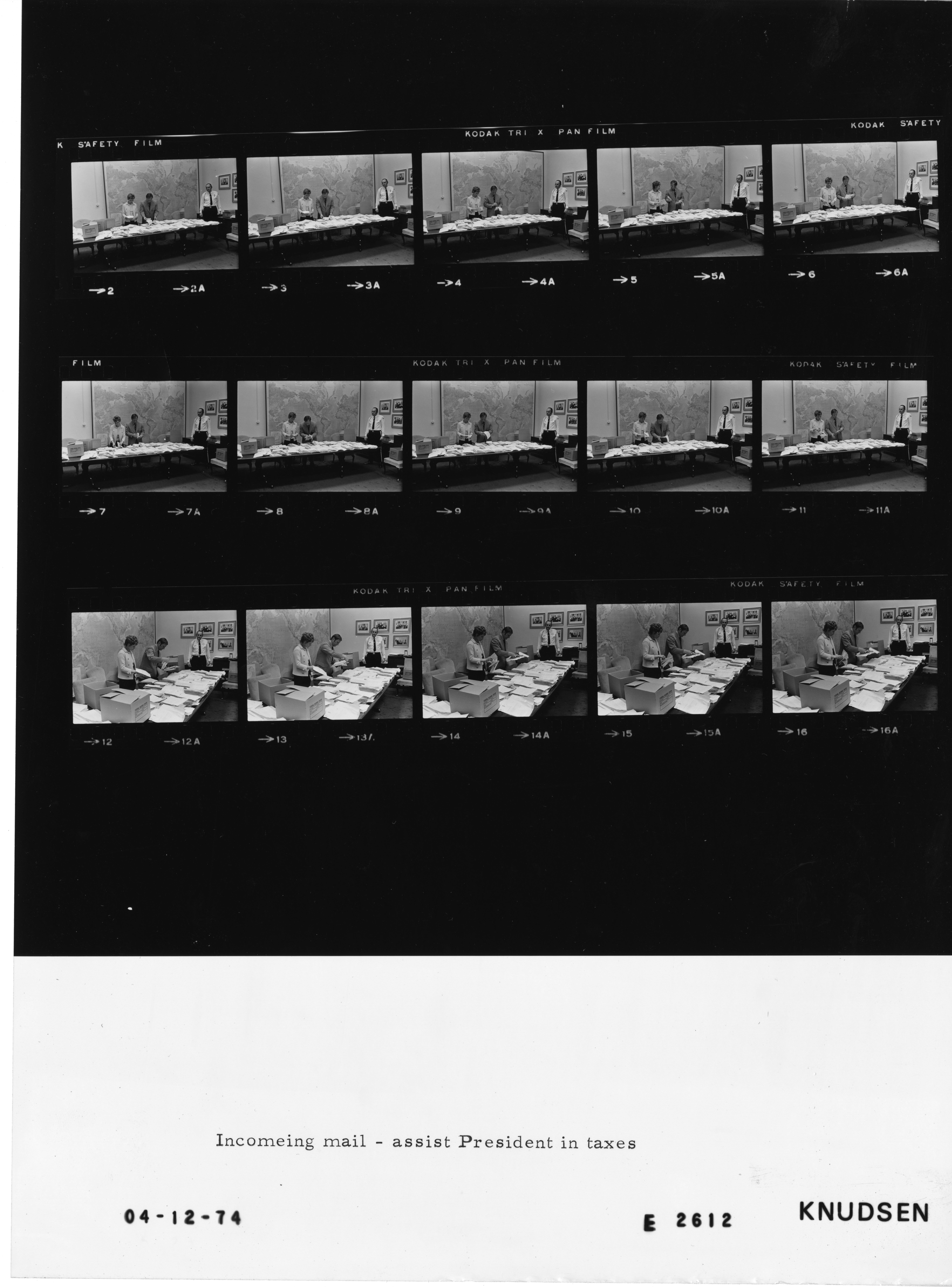 - Frame(s): WHPO-E2612-02-16, Two staff members sorting Incoming White House mail - Contact sheet notes: assist President with taxes. 4/12/1974, Washington, D. C. White House, Mail room. unidentified staff members and White House Security Guard in uniform, Judy Entler, Roland Elliot, Robert Tomlinson.