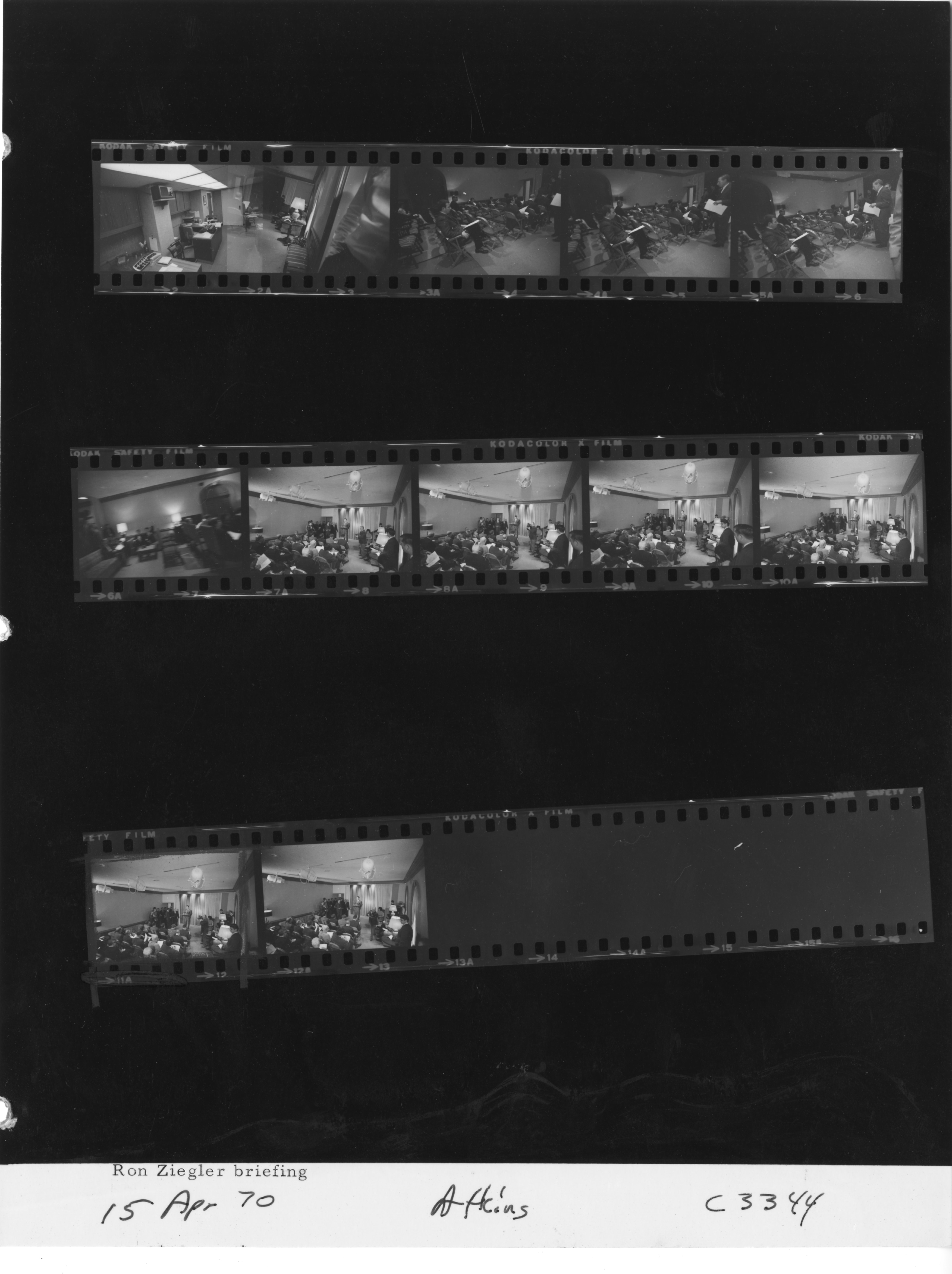 - Frame(s): WHPO-3344-12, Press briefing given by Ronald Ziegler. 4/15/1970, Washington, D.C. White House Press Room.