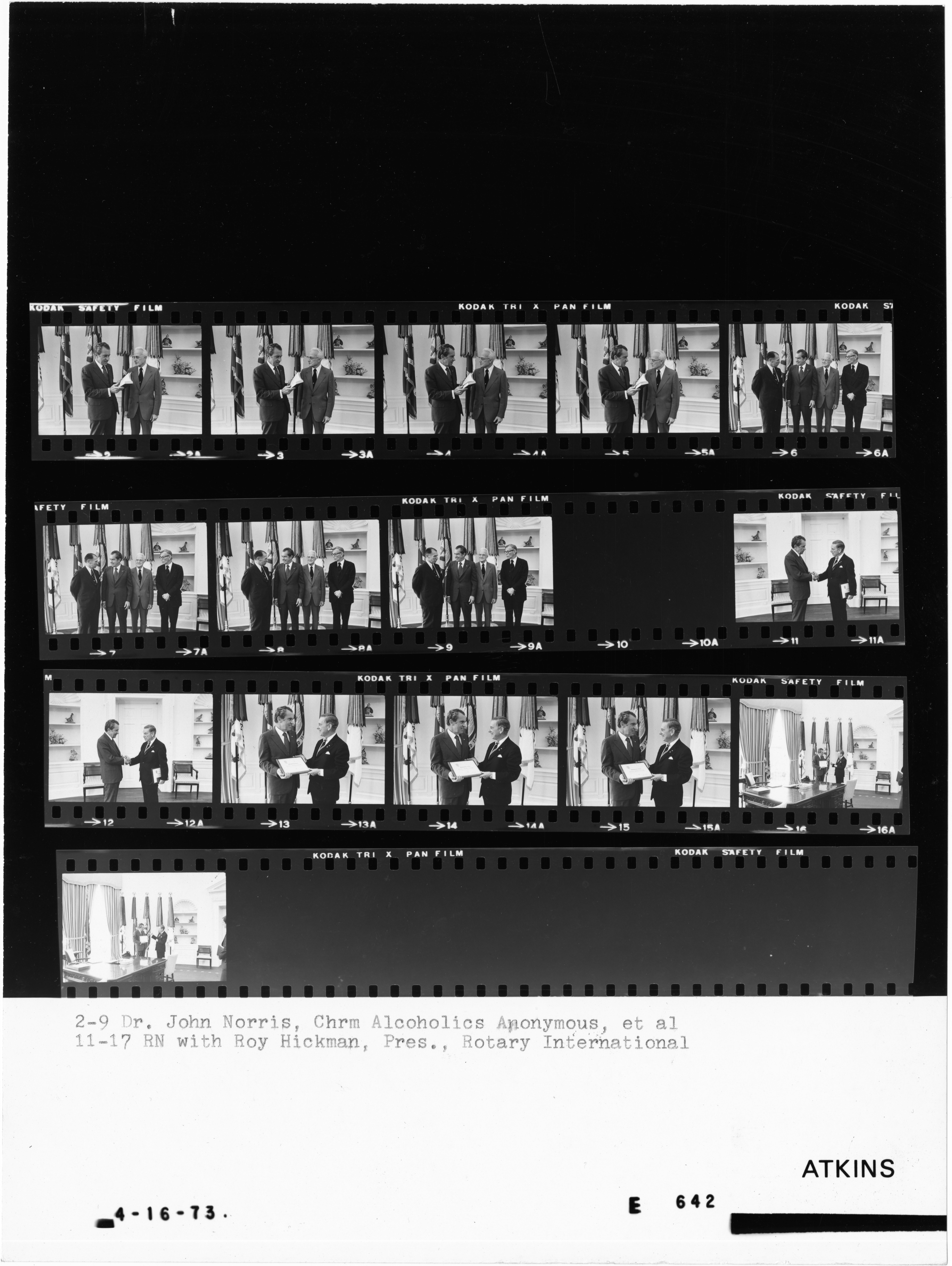 - Frame(s): WHPO-E0642-02-09, President Nixon meeting Chairman of Board of Trustees of Alcoholics Anonymous Dr. John Norris, General Manager of AA General Service Office Robert Hitchins, National Adviscry Council on Alcoholism member Tom Pike. 4/16/1973, Washington, D.C. White House, Oval Office. President Nixon, Dr. John Norris, Robert Hitchins, Tom Pike.