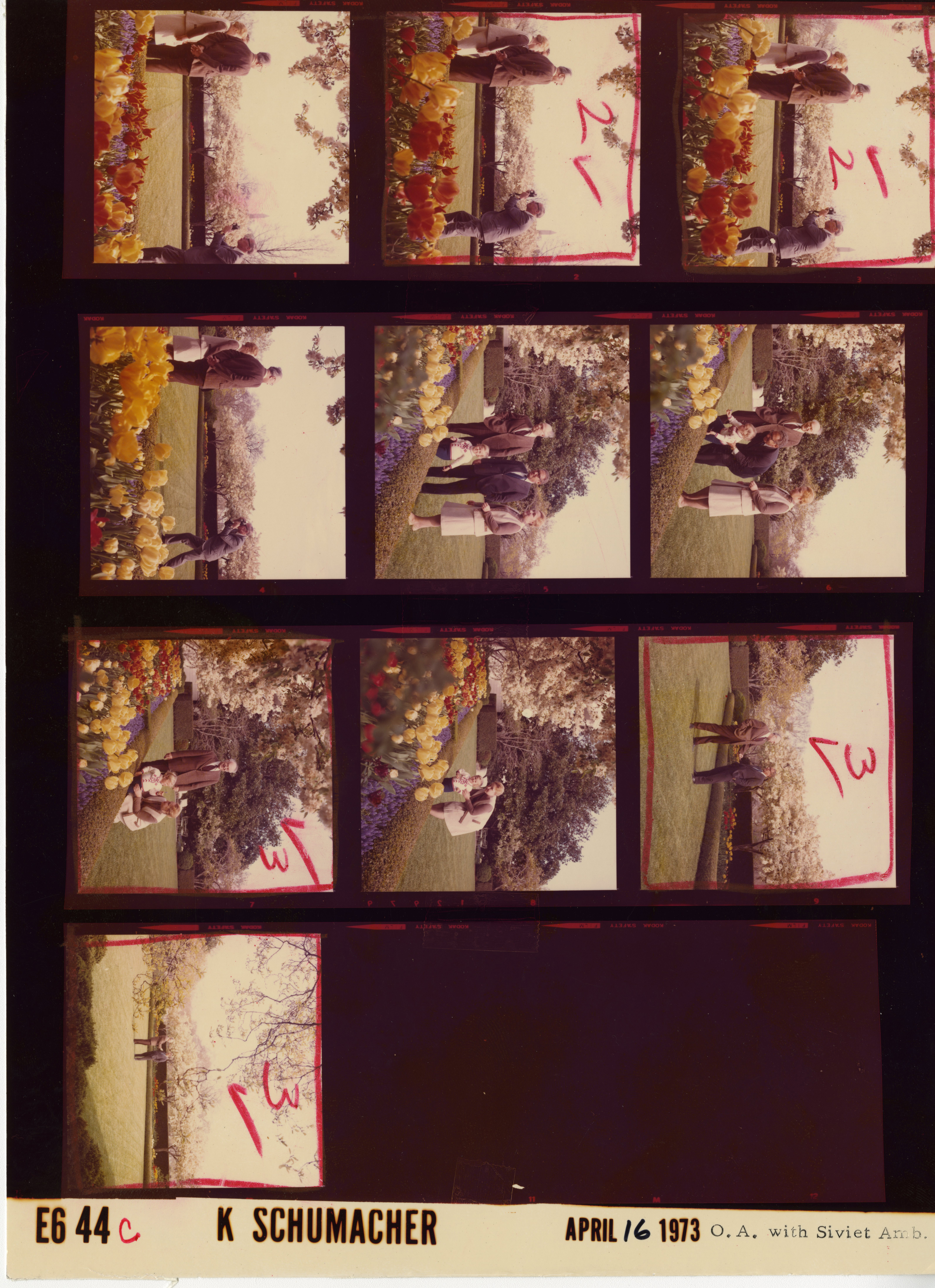 - Frame(s): WHPO-E0650-10, National Security Advisor Henry Kissinger stands with Soviet Ambassador Anatoly Dobrynin, wife Irina Dobrynin and young daughter Yelena Dobrynin while White House Photo Office Director Oliver "Ollie" Atkins takes photographs of them in front of a tulip bed in full bloom. 4/16/1973, Washington, D.C. White House Rose Garden. Henry Kissinger, Presidential photographer Oliver "Ollie" Atkins, Ambassador Anatoly Dobrynin, Mrs. Irina Dobrynin, daughter Yelena Dobrynin.