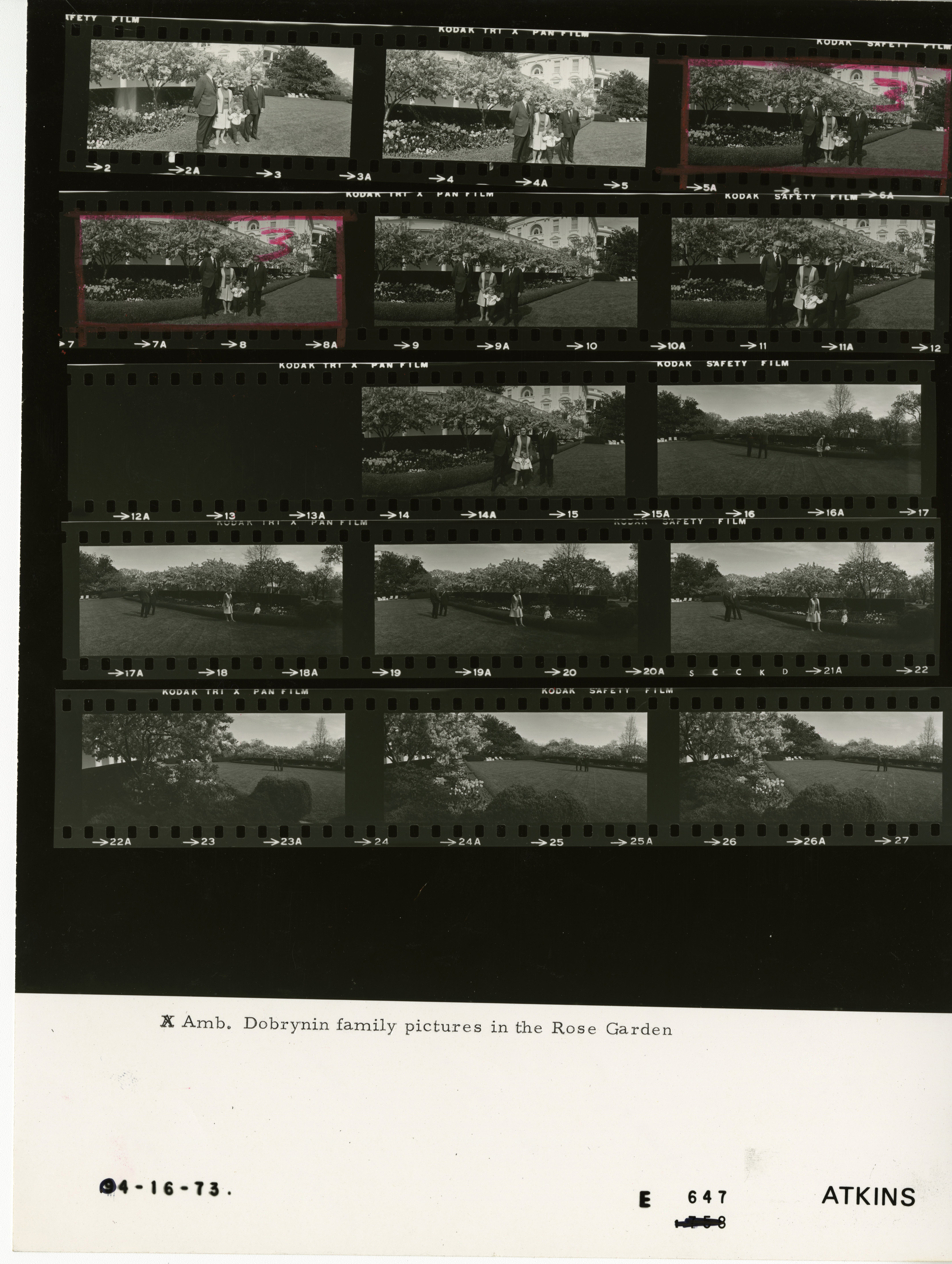 - Frame(s): WHPO-E0644-, National Security Advisor Henry Kissinger standing in the White House Rose Garden posing for photogaphs with Soviet Ambassador Anatoly Dobrynin and family. 4/16/1973, Washington, D.C. South Gardens, White House. Henry Kissinger, Ollie Atkins, Ambassador Anatoly Dobrynin, wife Mrs. Irina Dobrynin, daughter Yelena Dobrynin.