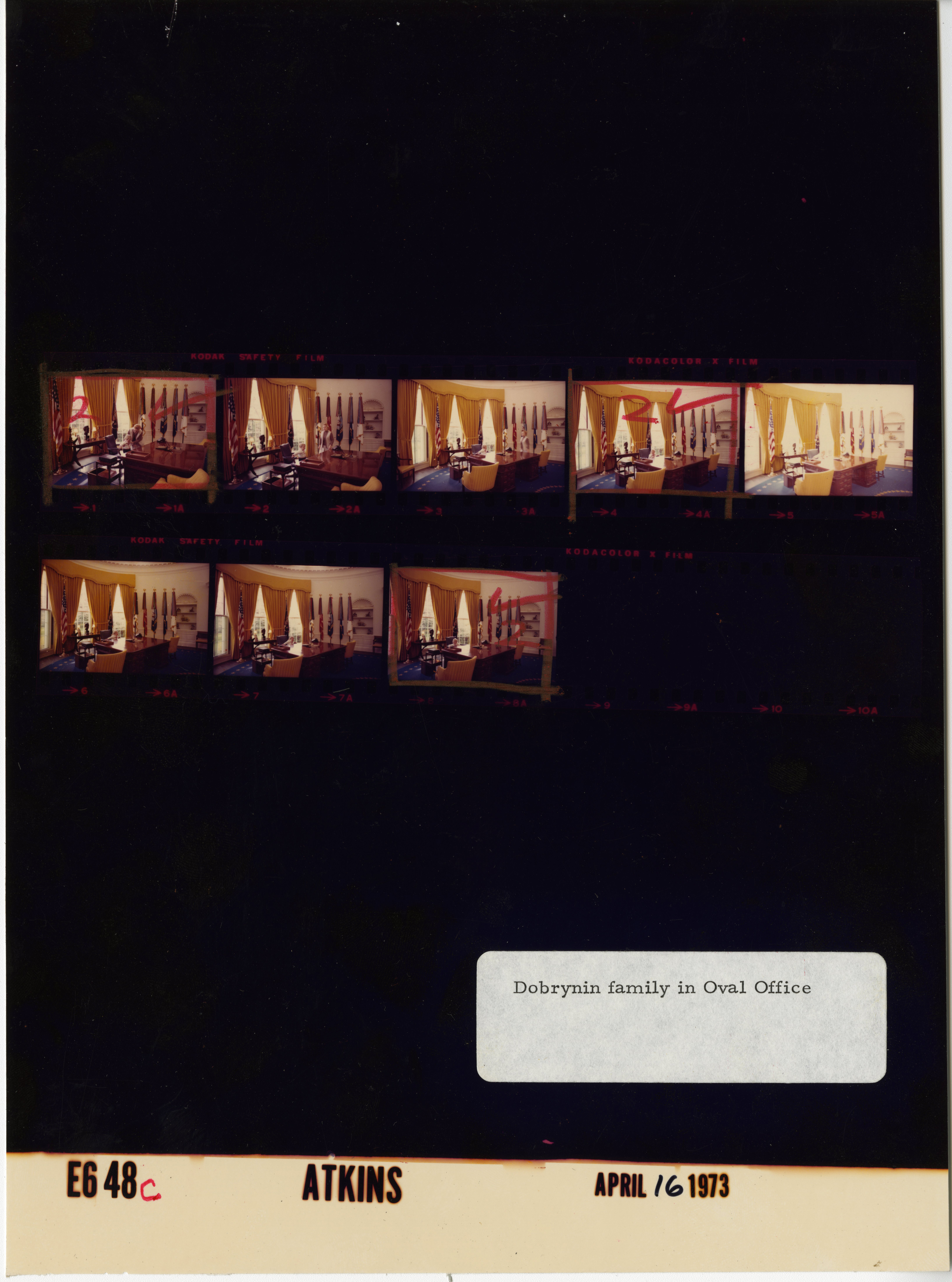 - Frame(s): WHPO-E0648-, Mrs. Irina Dobrynin (wife of Soviet Ambassador Anatoly Dobrynin) and daughter Yelena Dobrynin at President Nixon's Oval Office desk. 4/16/1973, Washington, D.C. White House, Oval Office. Mrs. Irina Dobrynin, Yelena Dobrynin.