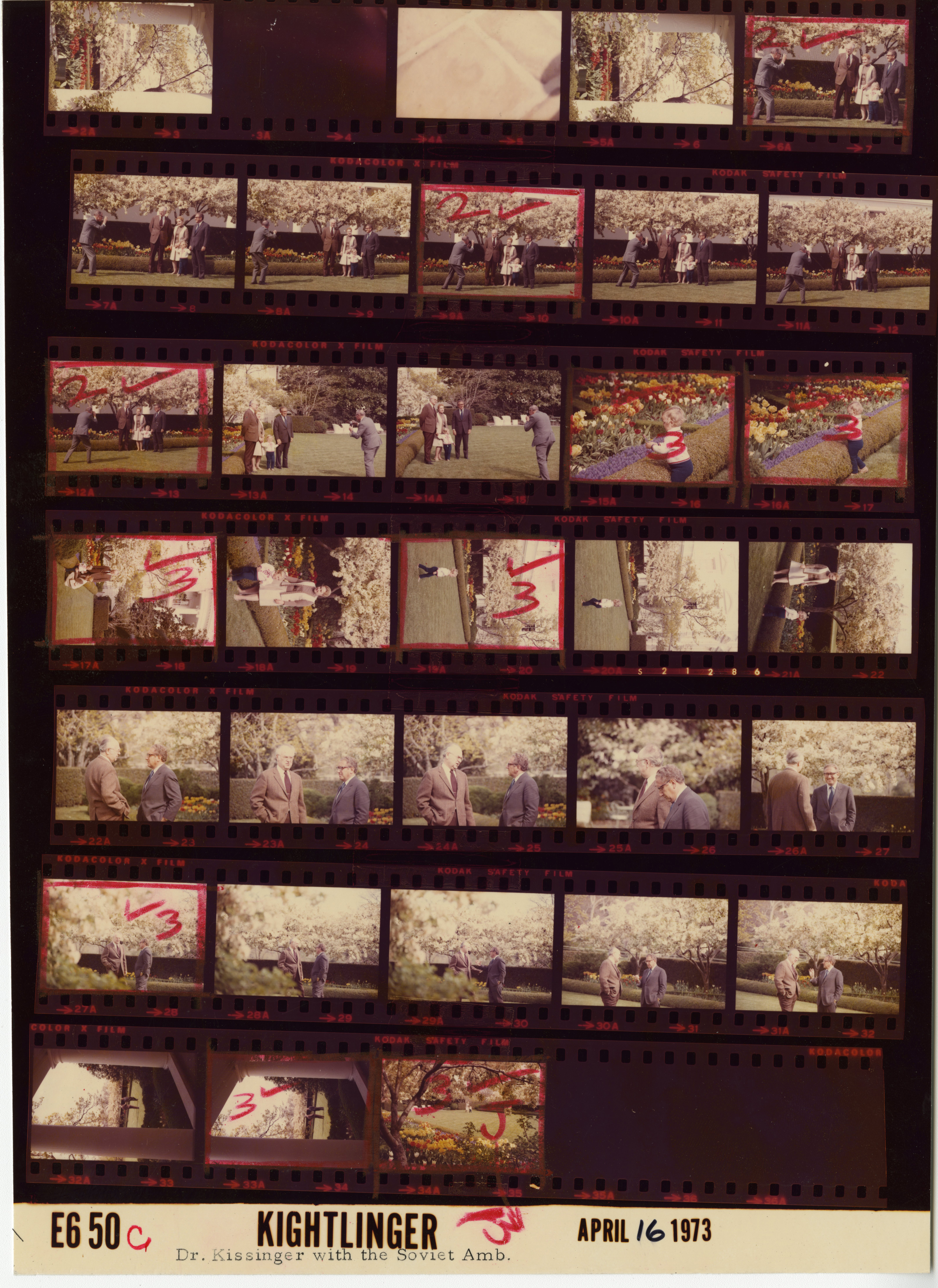 - Frame(s): WHPO-E0650-13A, National Security Advisor Henry Kissinger stands with Soviet Ambassador Anatoly Dobrynin, wife Irina and young daughter Yelena while White House Photo Office Director Oliver "Ollie" Atkins takes photographs of them in front of a White House Rose garden tulip bed in full bloom. 4/16/1973, Washington, D.C. White House Rose Garden. Henry Kissinger, Presidential photographer Oliver "Ollie" Atkins, Ambassador Anatoly Dobrynin, Mrs. Irina Dobrynin, daughter Yelena Dobrynin.