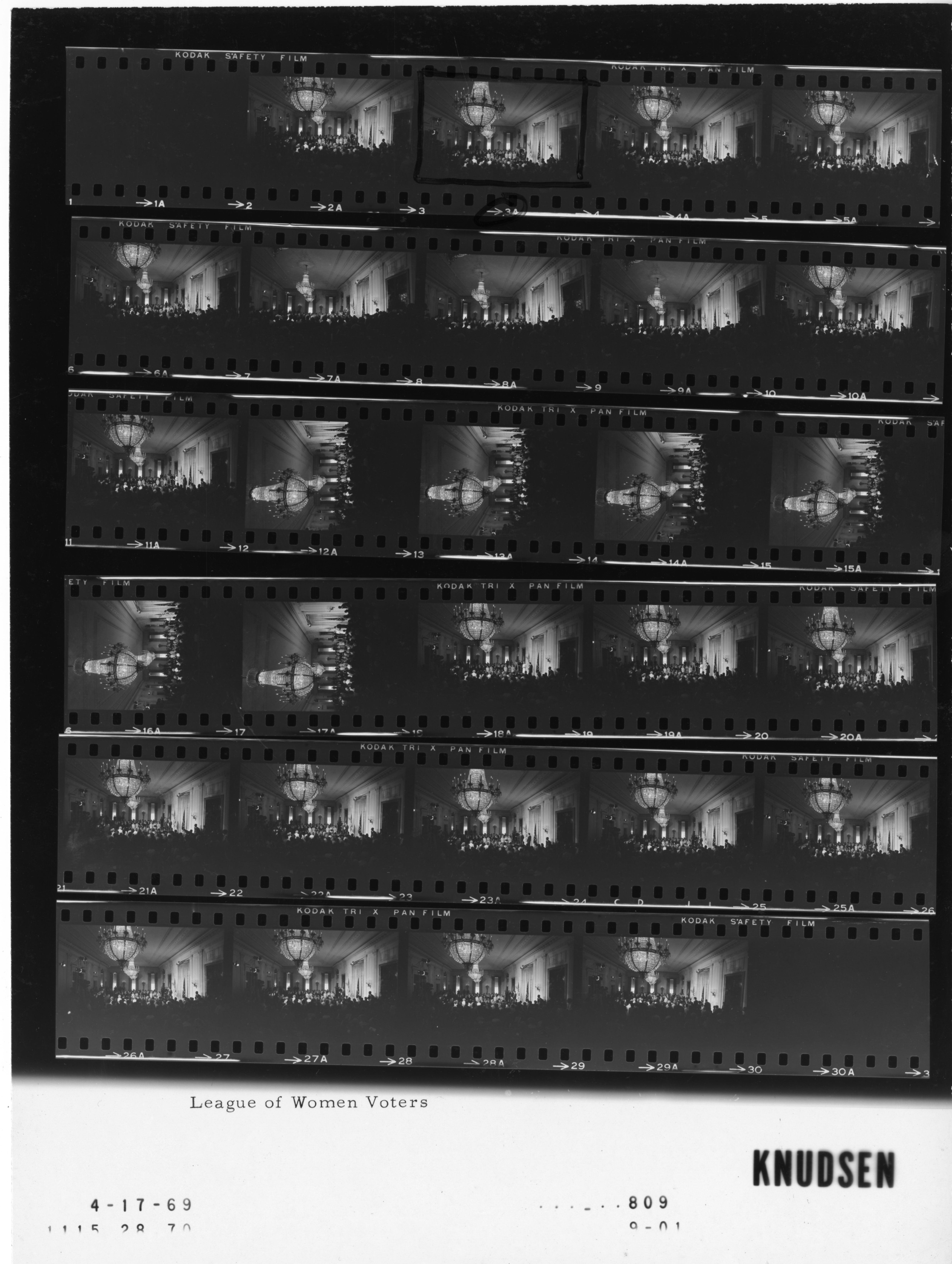 - Frame(s): WHPO-0809-, President Nixon addressing a reception for the League of Women Voters on its 50th anniversary. 4/17/1969, Washington, D.C. White House, East Room. President Nixon, League of Women Voters President Mrs. Bruce Benson, John Gardner, Pat Nixon, others.