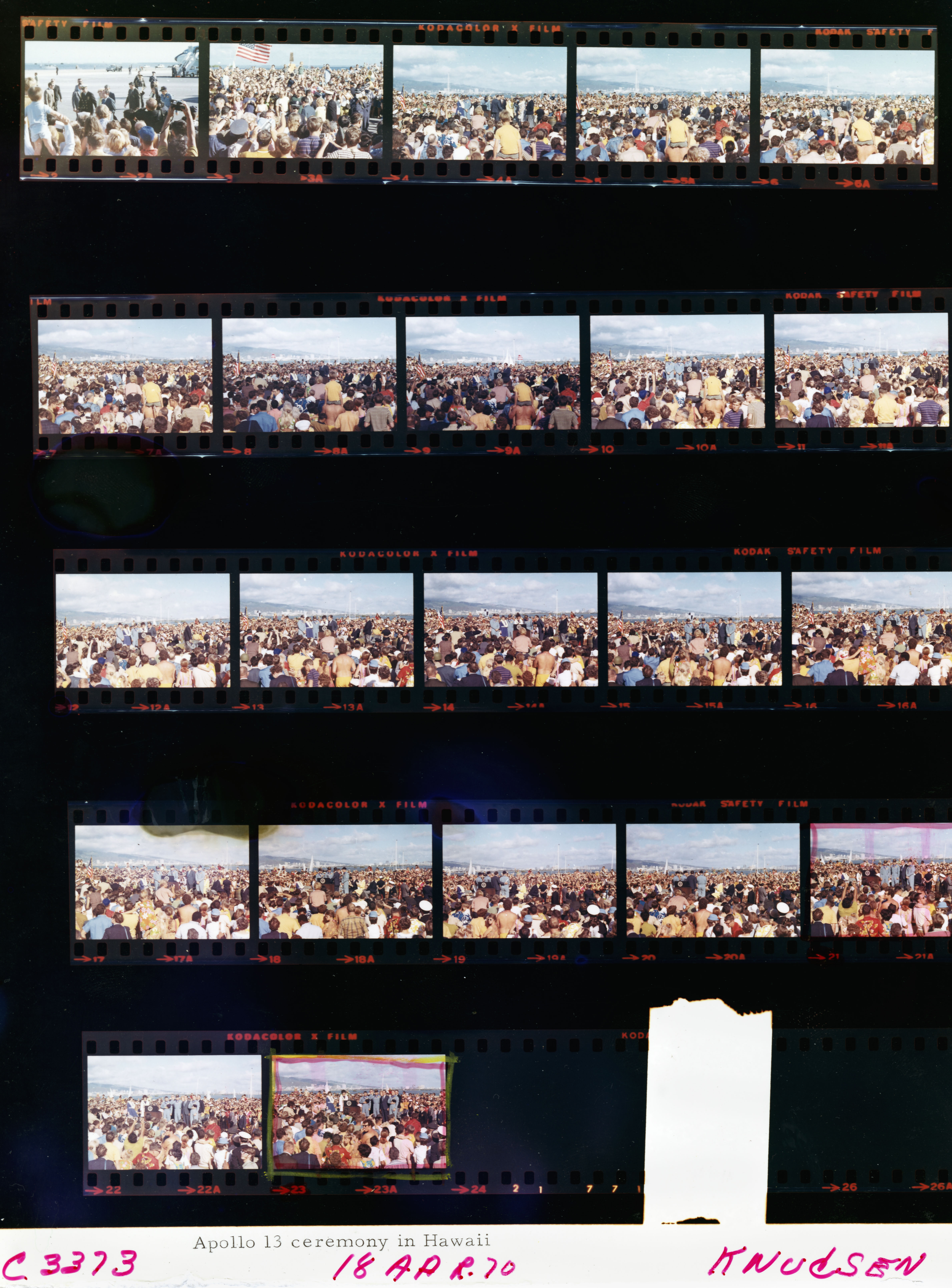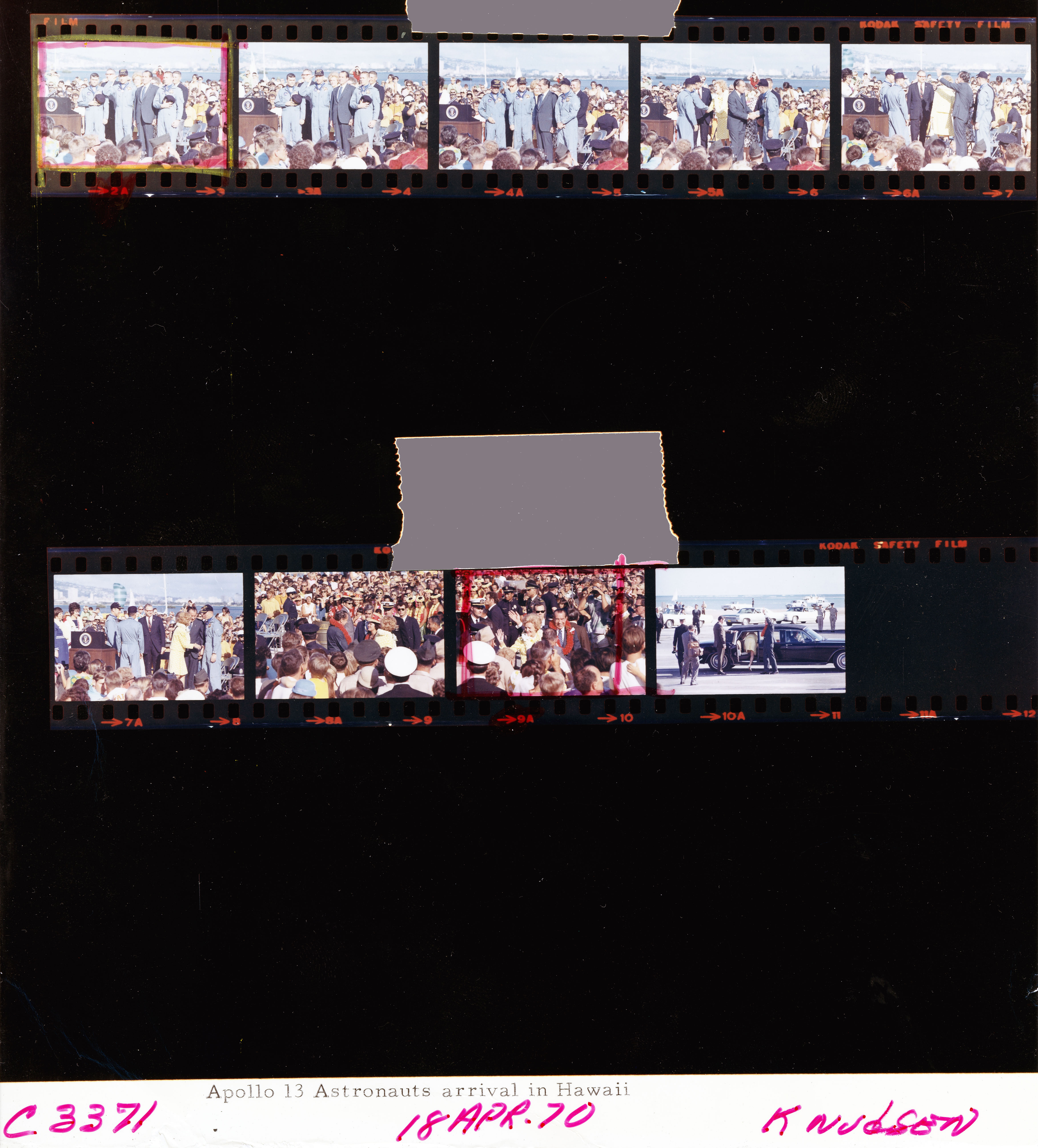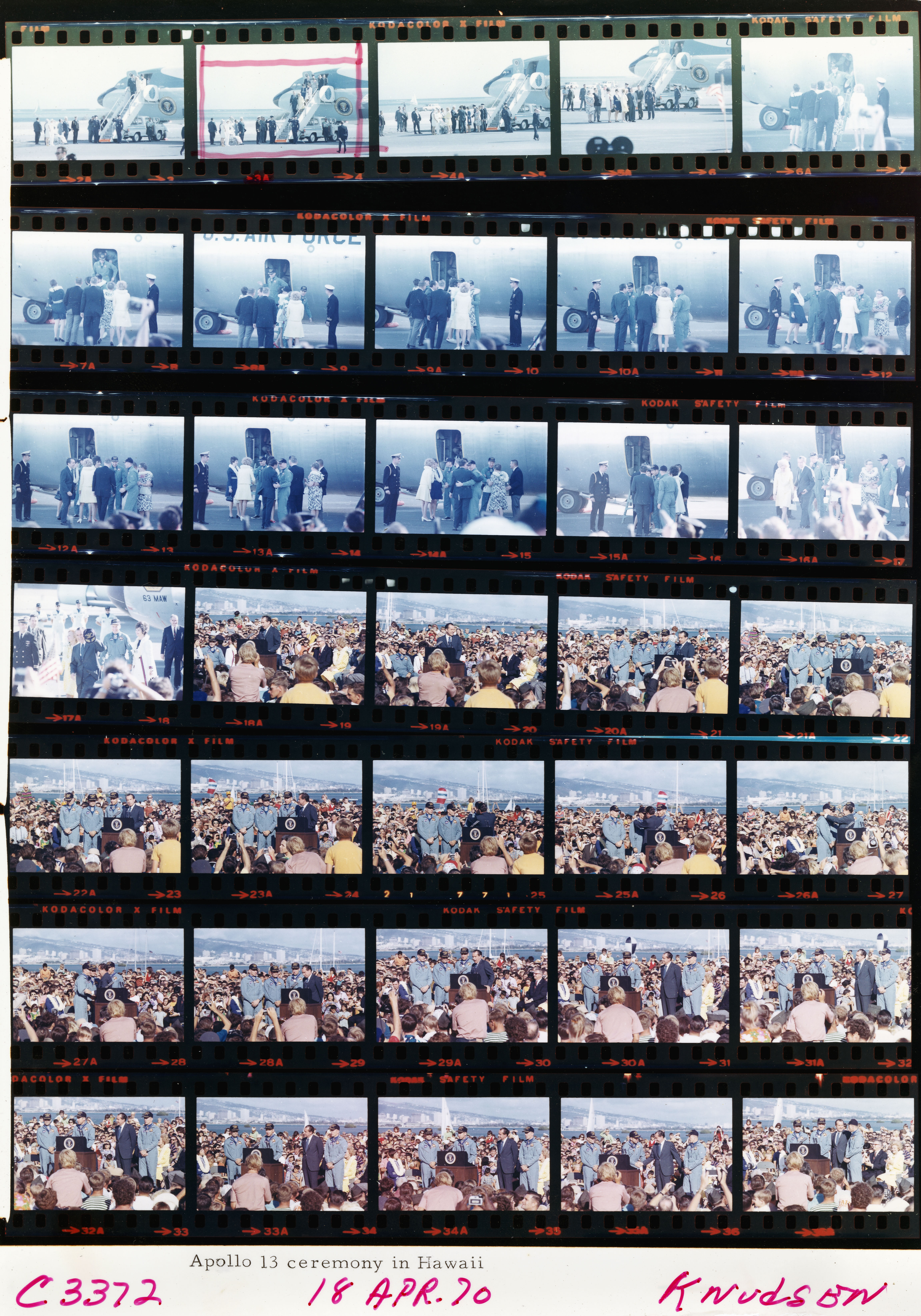 - Frame(s): WHPO-3385-15A, President Nixon wearing many color leis, greets Navy officials before leaving Hawaii after the Apollo XIII (Apollo 13) astronauts Medal of Freedom awards ceremony. 4/18/1970, Honolulu, Hawaii Hickam AFB, HI. President Nixon, unidentified Navy officials.