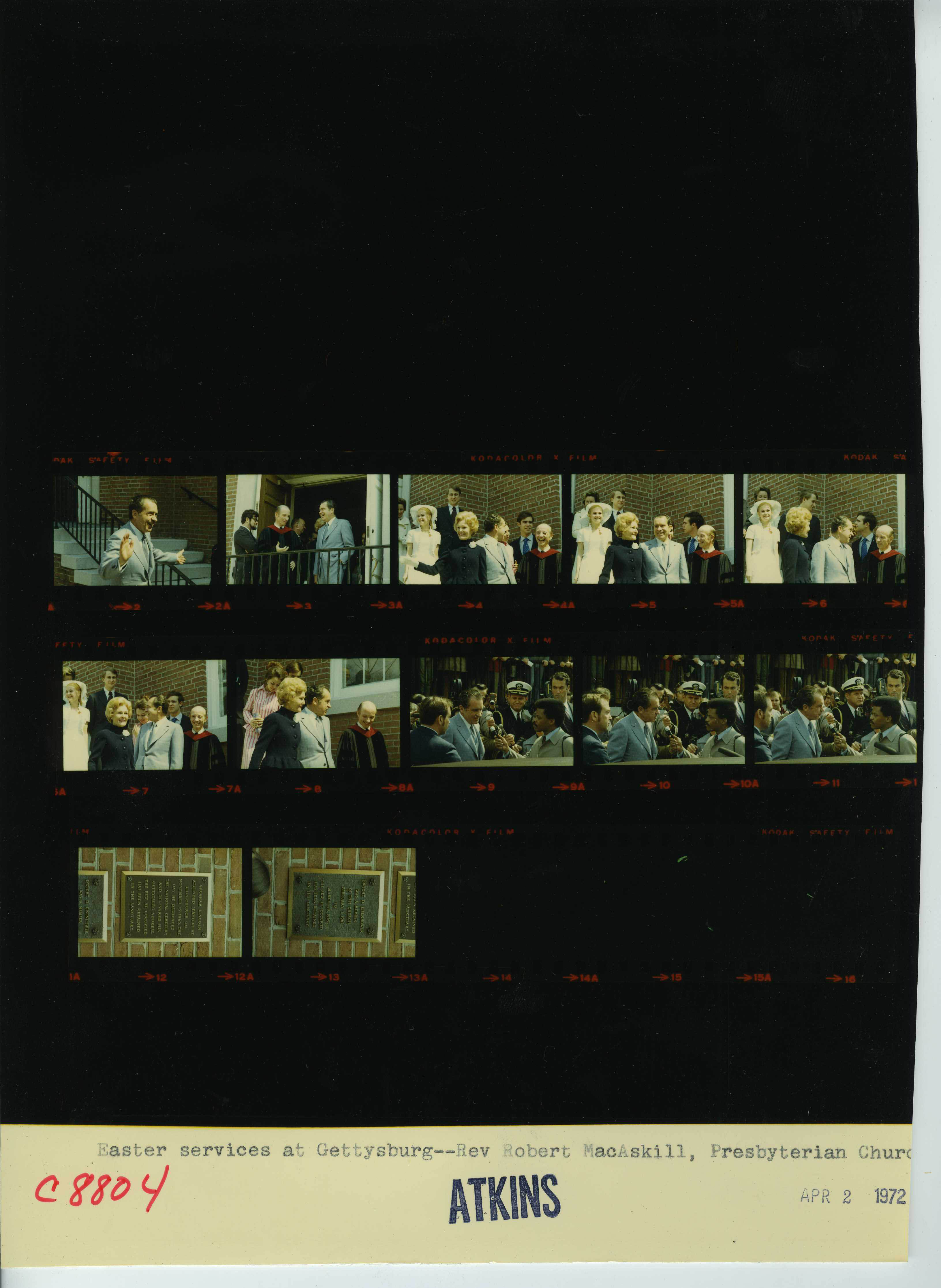 - Frame(s): WHPO-8804-, President Nixon talking with members of the press after attending the Gettysburg Presbyterian Church Easter religious worship Service. 4/2/1972, Gettysburg, Pennsylvania entrance and street, Gettysburg Presbyterian Church. President Nixon, Pat Nixon, Julie Eisenhower, David Eisenhower, Tricia Nixon Cox, Edward Cox, Rev. Robert MacAskill, press corps.