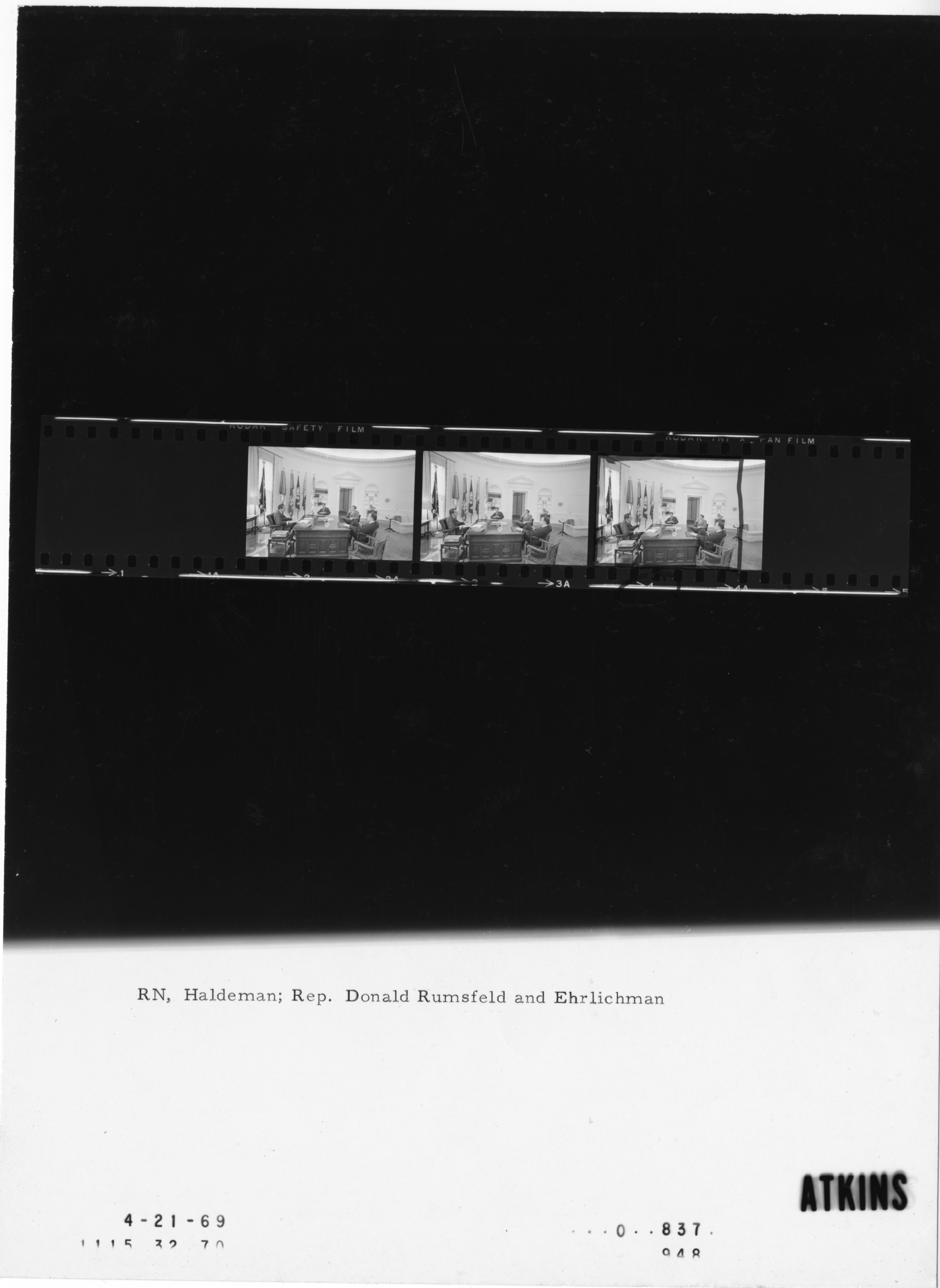 - Frame(s): WHPO-0837-04, President Nixon meeting in the Oval office at his desk with John Ehrlichman, H.R. Haldeman, and Donald Rumsfeld. 4/21/1969, Washington, D.C. White House, Oval Office. President Nixon, John Ehrlichman, H.R. Halderman, Donald Rumsfeld.