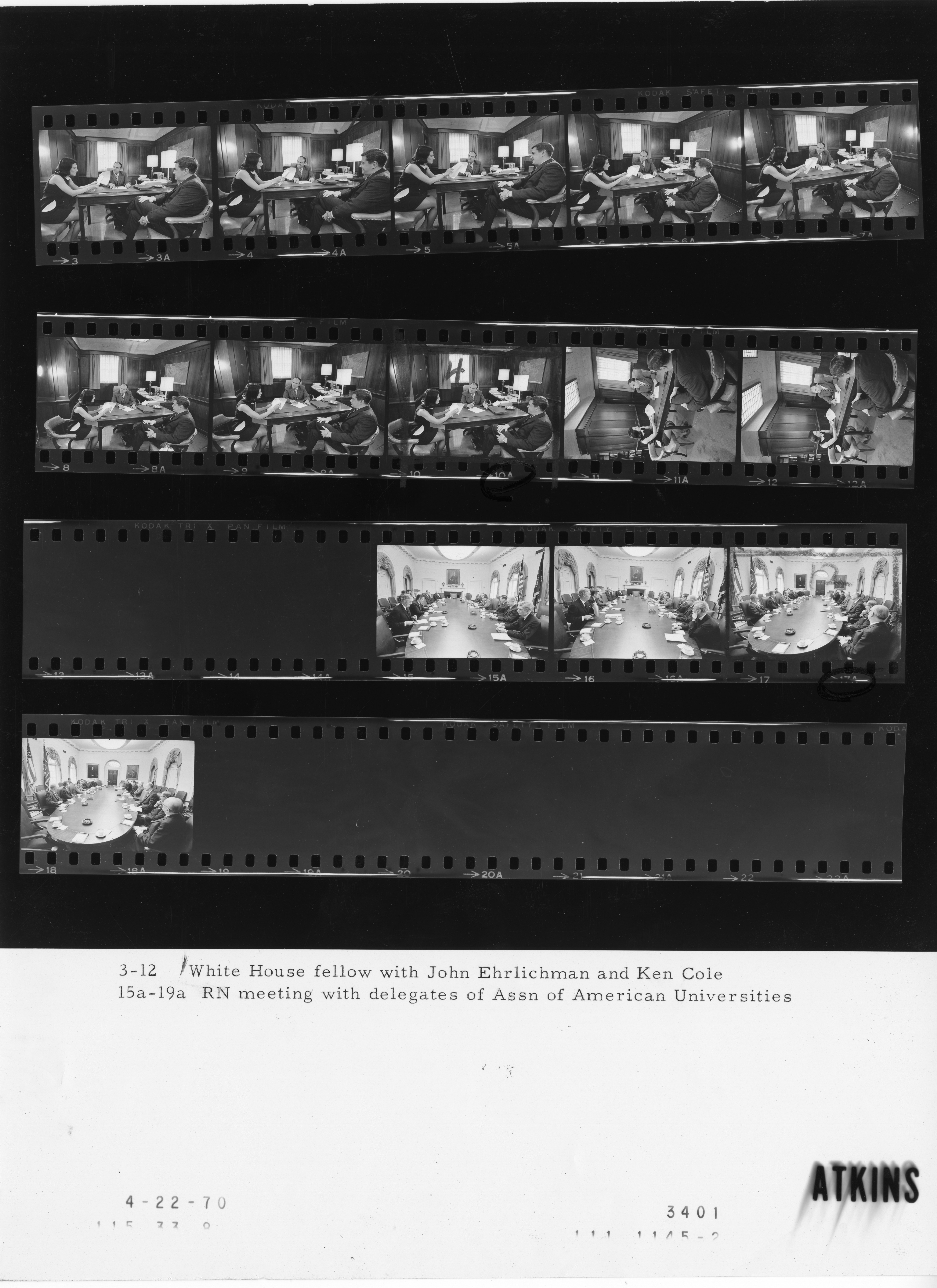 - Frame(s): WHPO-3401-15A-19A, President Nixon with Assistant Daniel Patrick Moynihan meeting with delegates of the Association of American Universities. 4/22/1970, Washington, D.C. White House, Cabinet Room. President Nixon, Patrick Moynihan.
