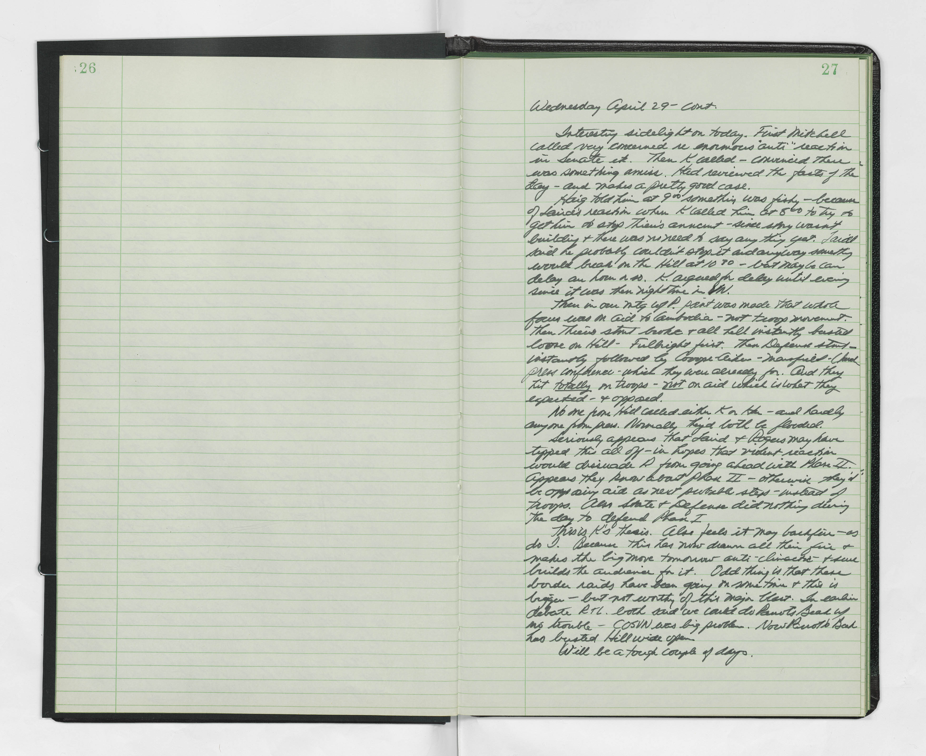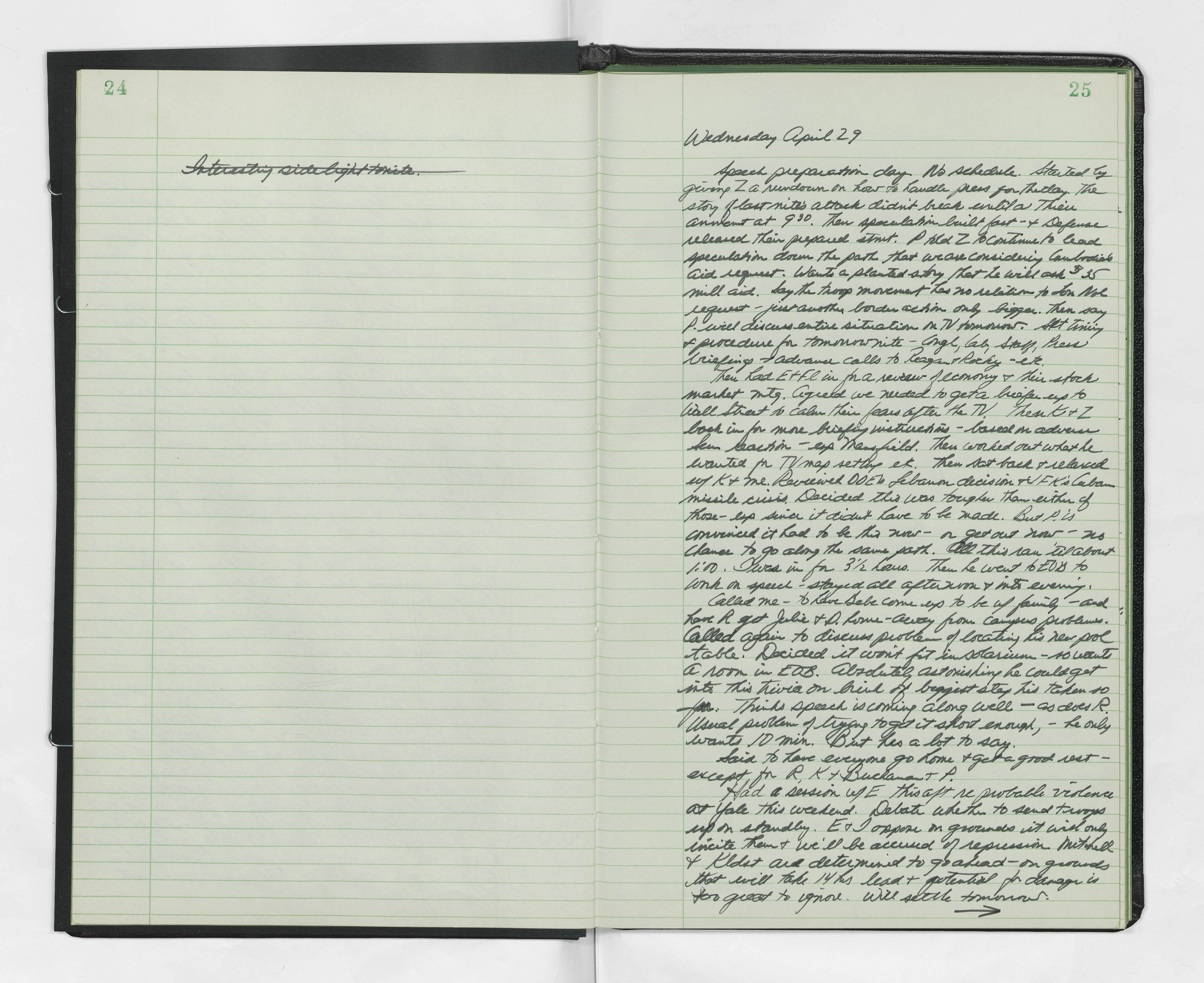 The H. R. Haldeman Diaries consists of seven handwritten diaries, 36 dictated diaries recorded as sound recordings, and two handwritten audio cassette tape subject logs. The diaries and logs reflect H. R. Haldeman’s candid personal record and reflections on events, issues, and people encountered during his service in the Nixon White House. As administrative assistant to the President and Chief of Staff, Haldeman attended and participated in public events and private meetings covering the entire scope of issues in which the Nixon White House engaged in during the years 1969-1973. Visit the finding aid to learn more.