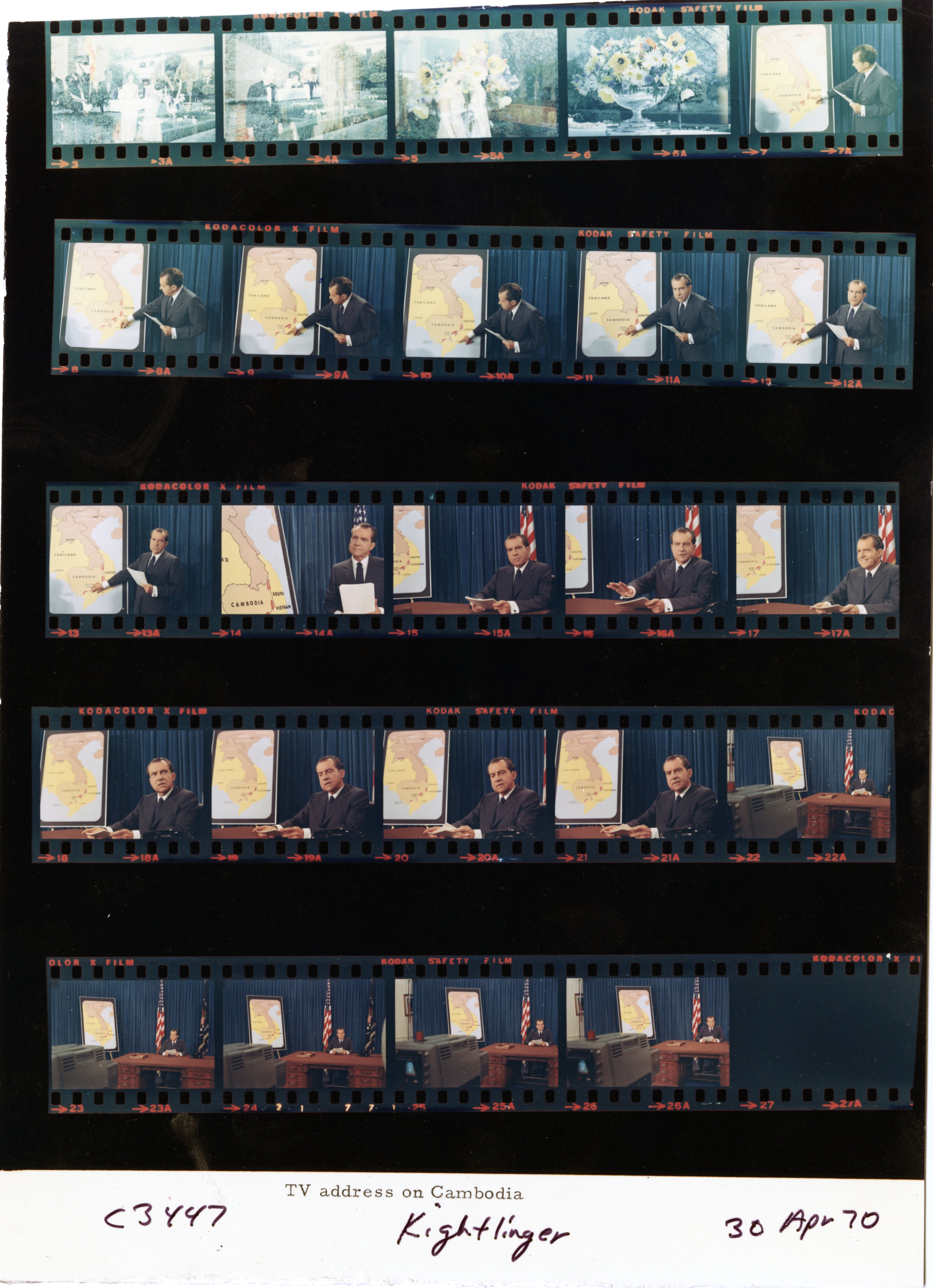 - Frame(s): WHPO-3449-05A-07A, President Nixon delivering a television address regarding American involvement in Cambodia. 4/30/1970, Washington, D.C. White House, Oval Office. President Nixon, officials, reporters, unidentified persons.