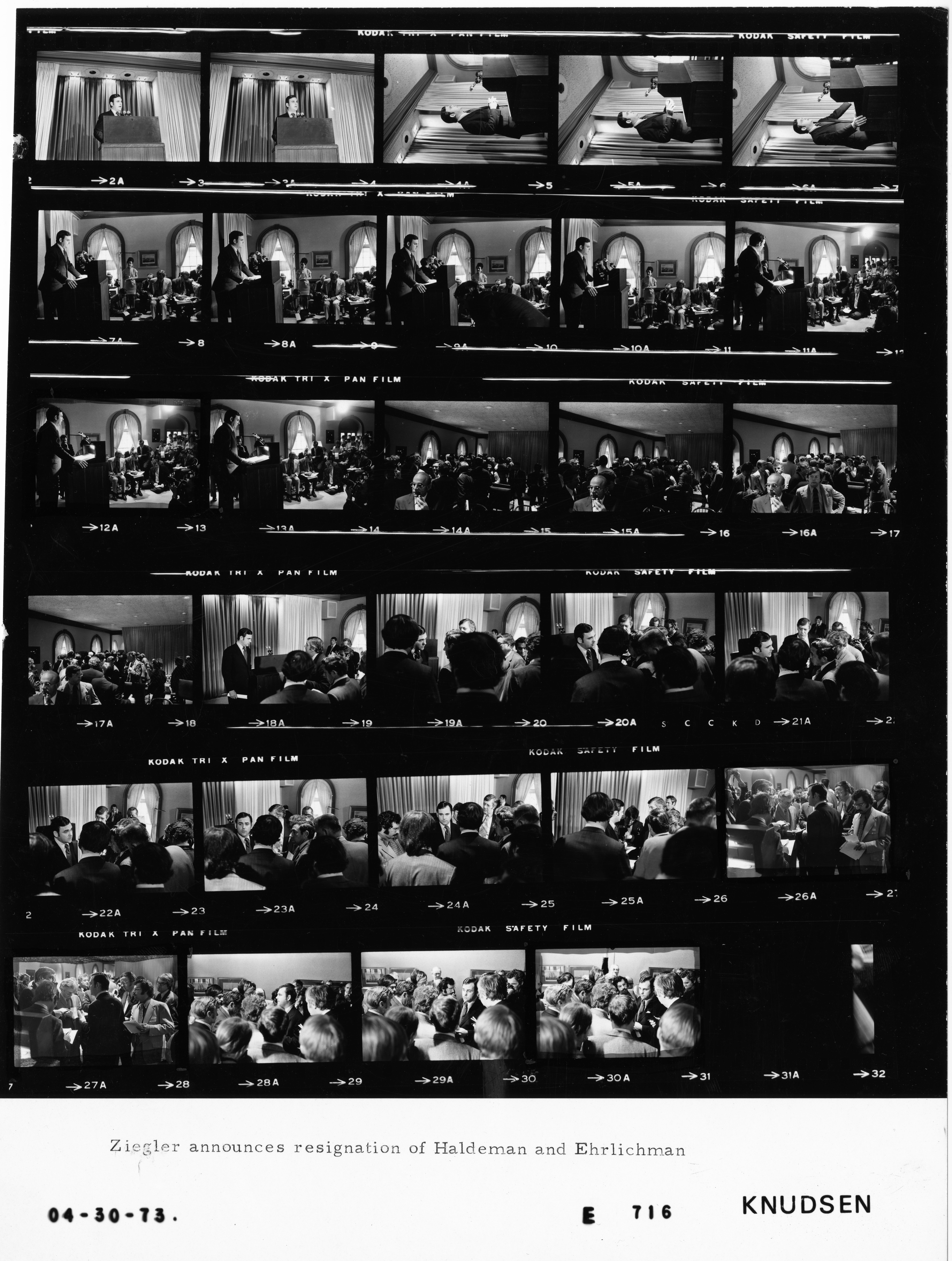 - Frame(s): WHPO-E0716-26A, Press Secretary Ron Ziegler announcing the resignations of H. R. Haldeman and John D. Ehrilchman at a press conference. 4/30/1973, Washington, D.C. White House, Press Room. Ronald Ziegler, members of the press.