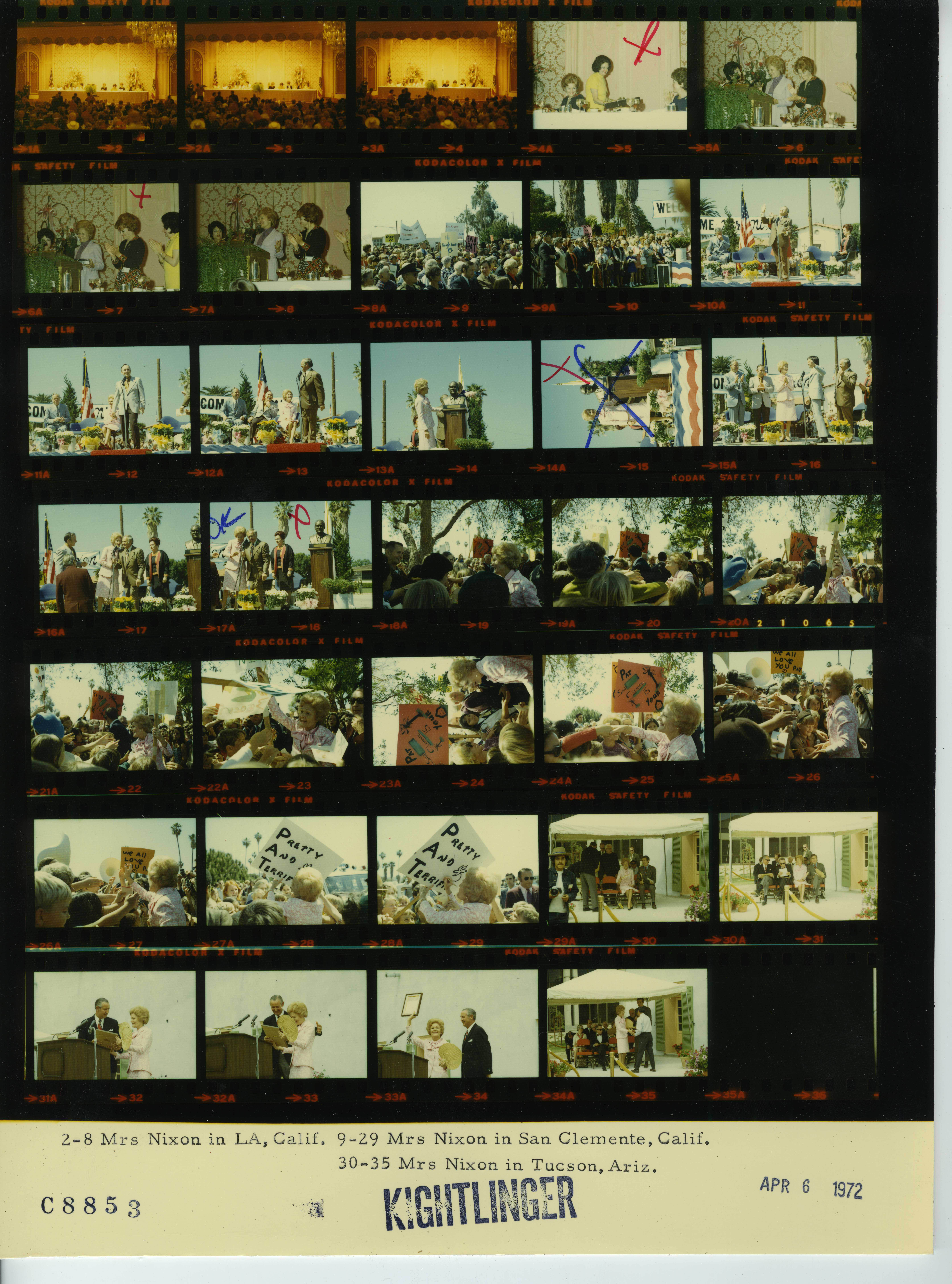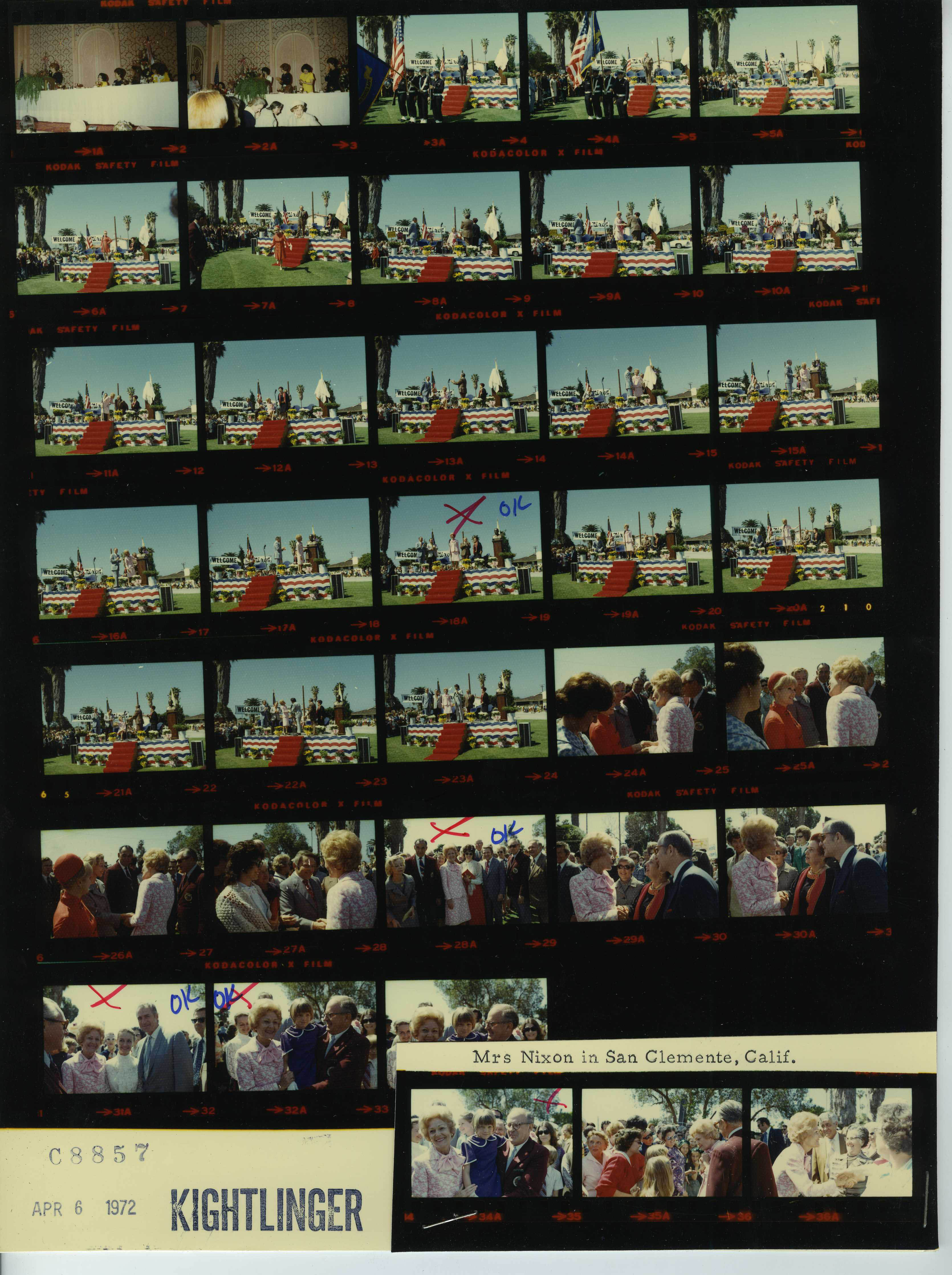 - Frame(s): WHPO-8857-03A-36A, Pat Nixon on a raised platform in a park. Pat Nixon greeting people in the waiting crowd during a welcoming ceremony for her. 4/6/1972, San Clemente, California park. Pat Nixon, unidentified officials, crowd.