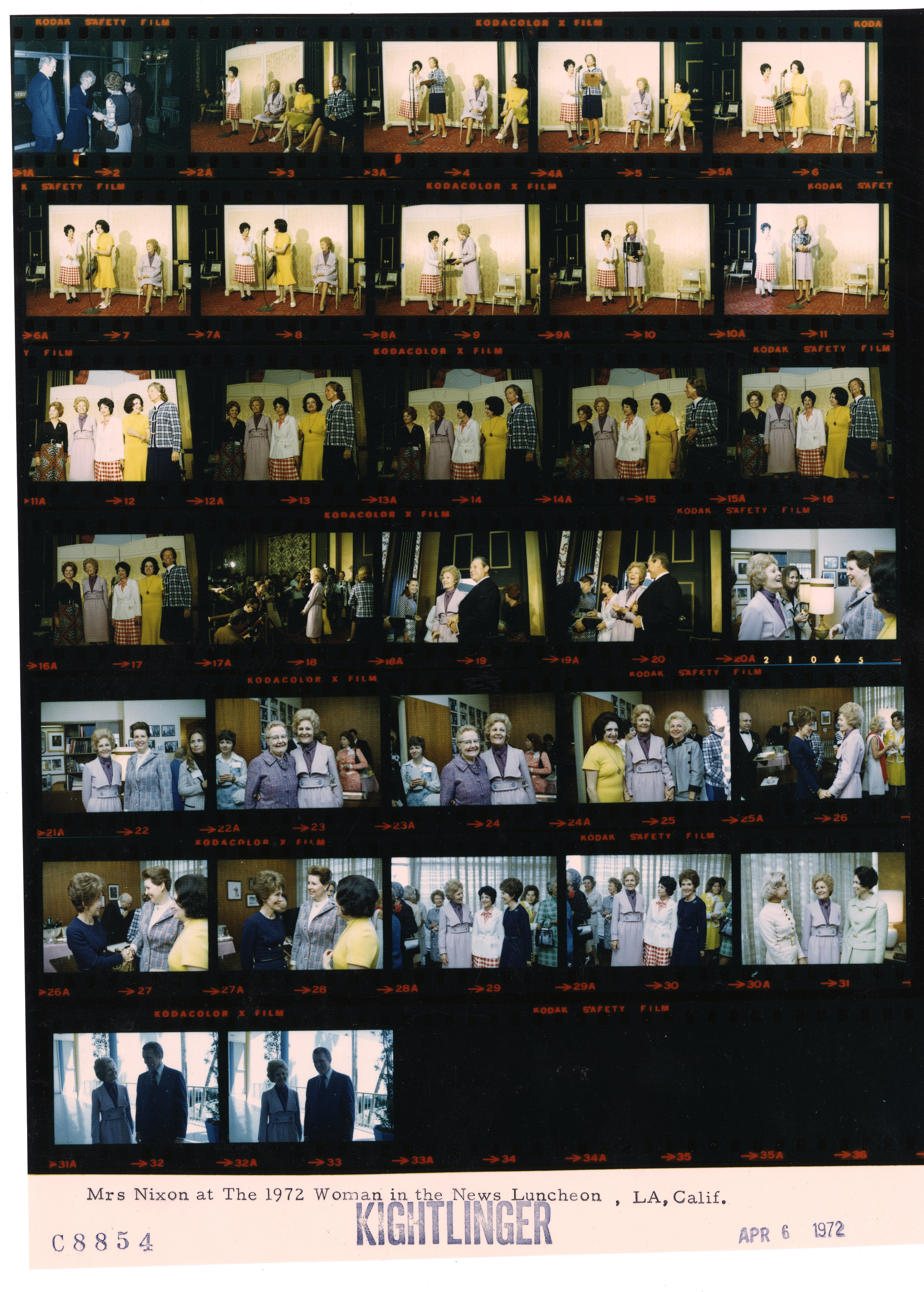 - Frame(s): WHPO-8854-, Pat Nixon in various rooms connected with the Woman in the News Luncheon. 4/6/1972, Los Angeles, California unknown. Pat Nixon, unidentified men and women.