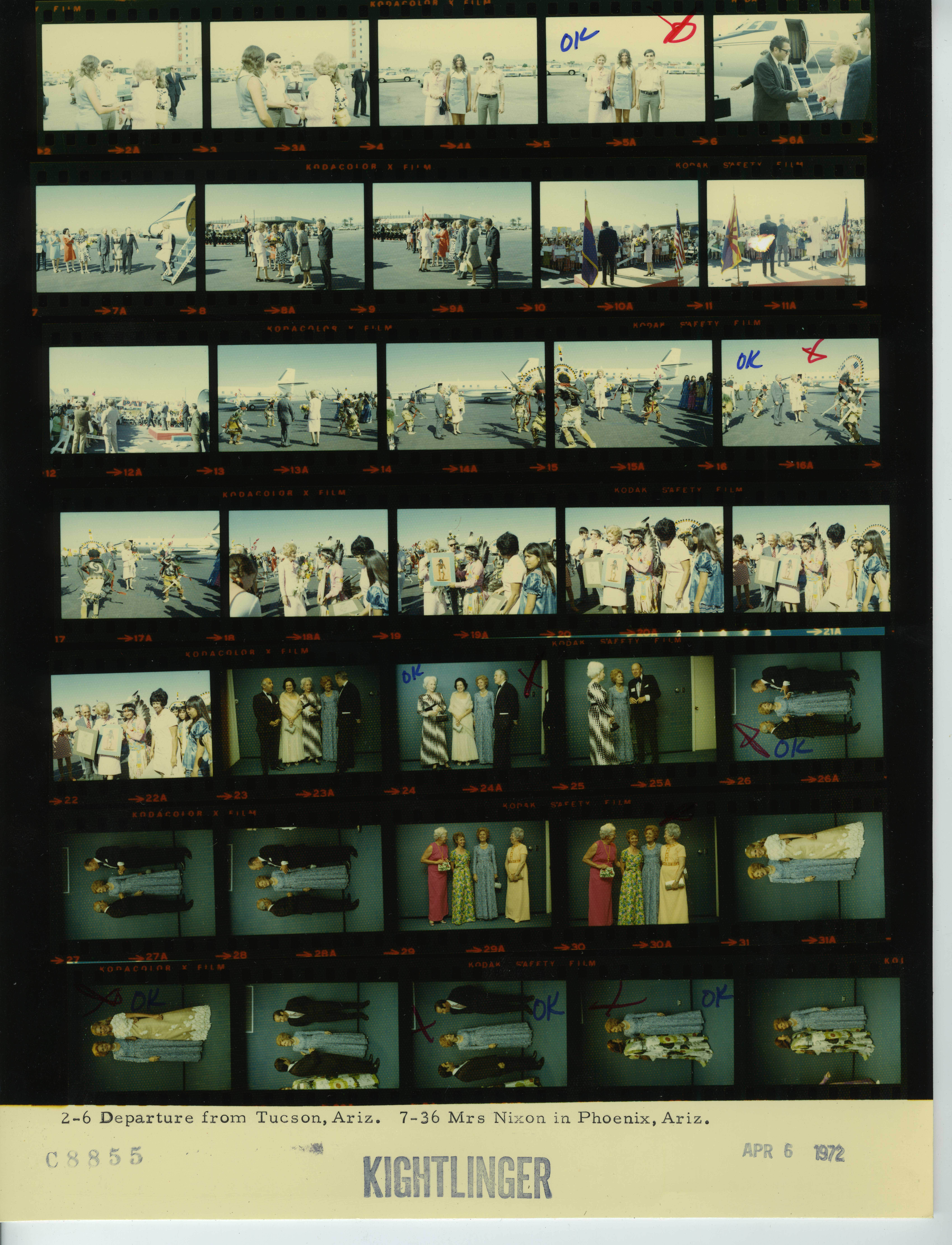 - Frame(s): WHPO-8855-02A-06A, Pat Nixon leaving Tucson, Arizona. 4/6/1972, Tucson, Phoenix, Arizona airports, unknown. Pat Nixon, officials, crowd, unidentified men and women.