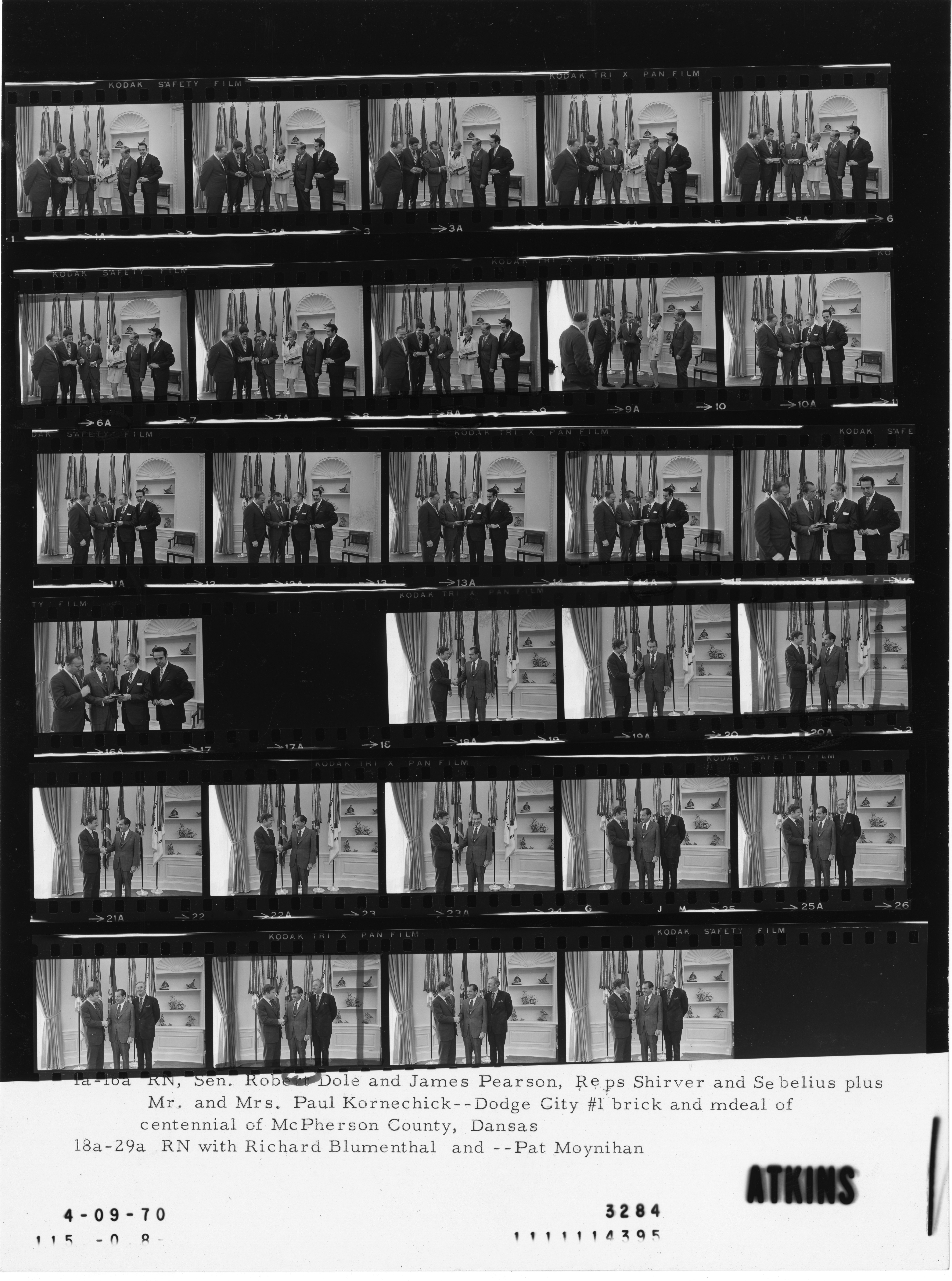 - Frame(s): WHPO-3284-01A-16A, President Nixon meeting with Senator Dole, Senator Pearson, Congressmen Sebelius, Congressman Shriver and Mr. and Mrs, Paul Kornechick. 4/9/1970, Washington, D.C. White House, Oval Office. President Nixon, Senator Dole, Senator Pearson, Congressman Sebelius, Congressman Shriver, Mr. Kornechick, Mrs. Kornechick.