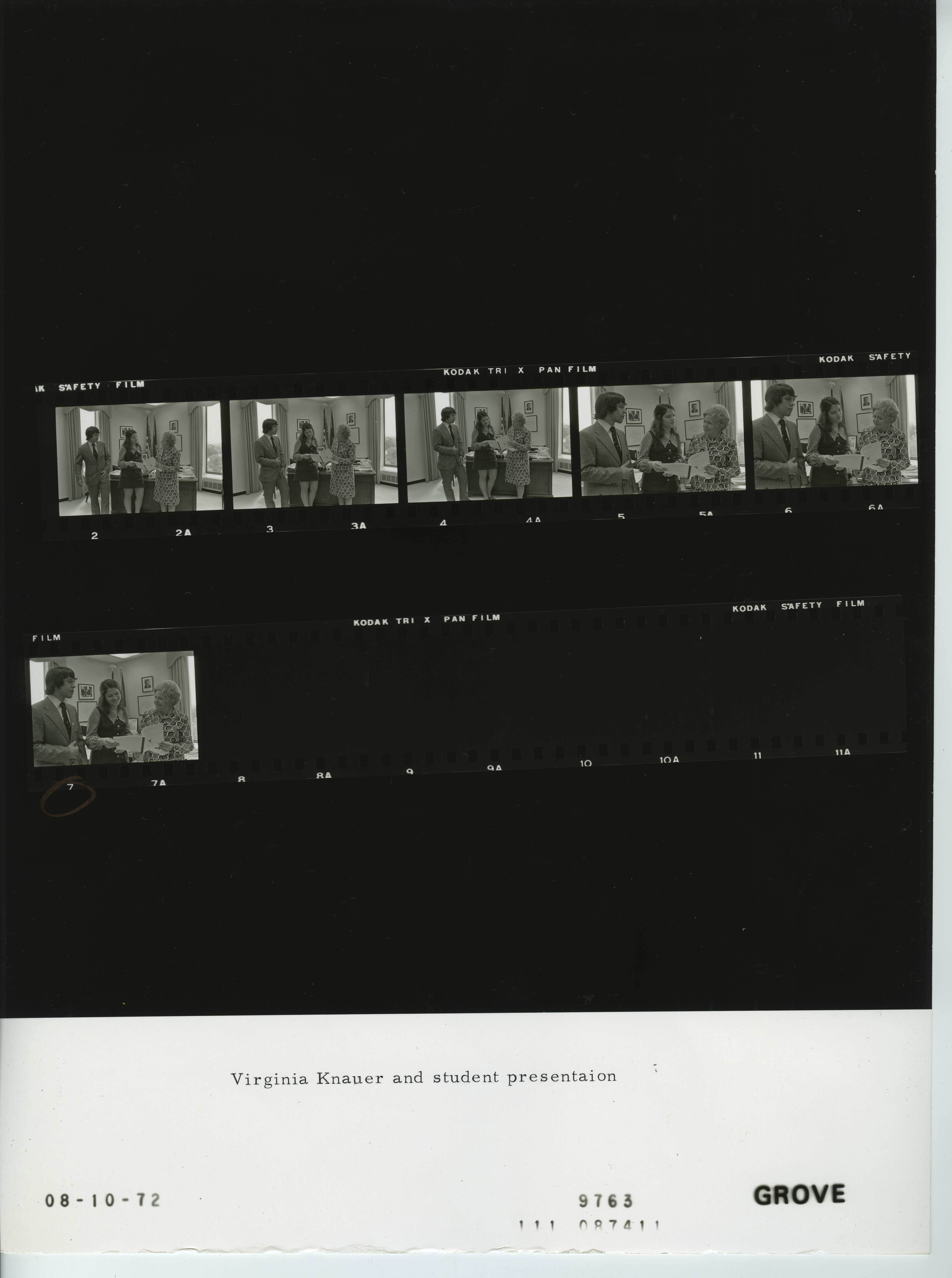 - Frame(s): WHPO-9763-, Virginia Knauer receiving a presentation from two students. 8/10/1972, Washington, D.C. unknown. Virginia Knauer, unidentified young man and young woman.